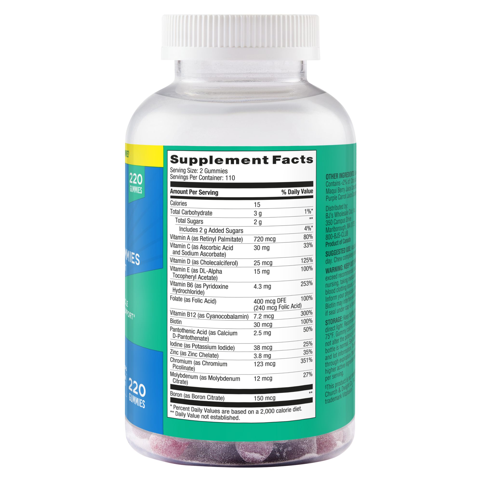 Ingredients: Active Ingredients: Vitamin A, Vitamin C, Vitamin D, Vitamin E, Vitamin B6, Folate, Vitamin B12, Biotin, Pantothenic Acid, Iodine, Zinc, Chromium, Molybdenum, Boron. Other Ingredients: Glucose Syrup, Sugar, Gelatin; Contains <2% Of: Citric Acid, Fumaric Acid, Lactic Acid, Maqui Berry Juice Concentrate (Color), Natural Flavors, Purple Carrot Juice Concentrate (Color).