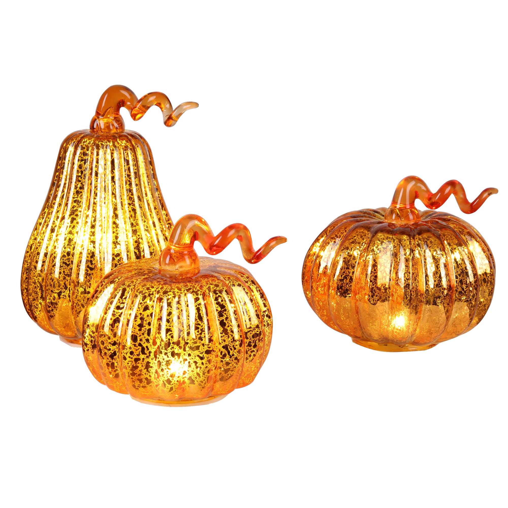 The small one is 5.7"L x 5.5"W x 5.3"H, medium one is 6.4"L x 6.4"W x 5.6"H, large one is 5.8"L x 5.5"W x 8.5"H Warm LED lights Halloween/fall decor Three different sized pumpkin in one set Glass decor Includes Berkley Jensen set of three mercury glass pumpkins