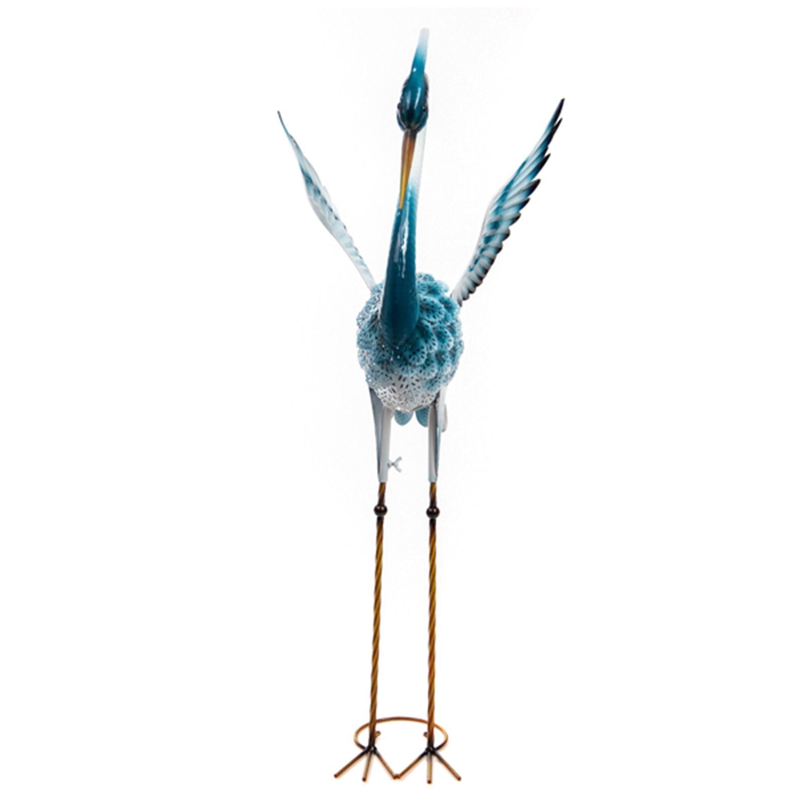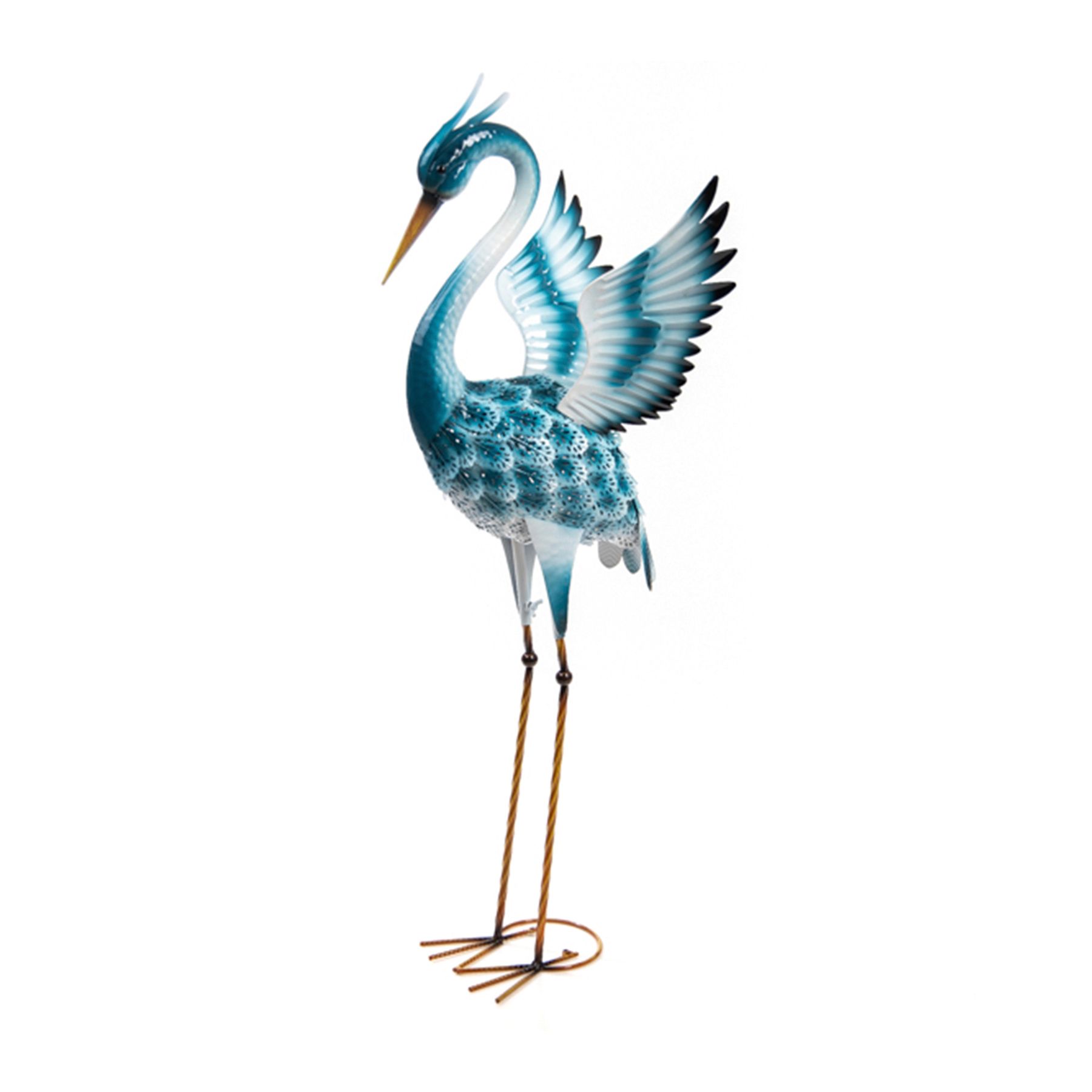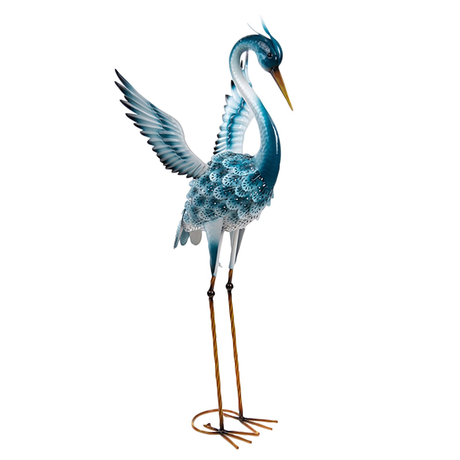 This graceful and colorful metallic heron ornament outlines the natural beauty of your garden. These elegant and truly stunning wading birds look fantastic with their vibrant color and intricate details and will be a nice complement to any garden, landscape, or backyard space. This lawn and garden statue is made of textured and layered metal sections hand-painted in blue hues. Sturdy metal legs and W-shaped base feet allow the heron decoration to stand stable. Garden heron sculpture has a stunning look and will not go unnoticed when your friends or guests stop by. The great metal ornament is approximately 40" high, tall enough to stand above flowers and small bushes. Brings a wonderful and graceful accent to any outdoor setting. Enjoy your outdoor living area with this lifelike metal garden heron statue. The intricate design and vibrant colors of this heron will add a unique, eye-catching feature to your landscaping. Luxurious look, graceful pose, and intricate details A great addition to your backyard Long lasting and durable construction Approximate dimensions: 14" x 17" x 40". Made of metal. Painted by hand. This is not a toy. For outdoor decorative use. Assembly is required. Made in China.