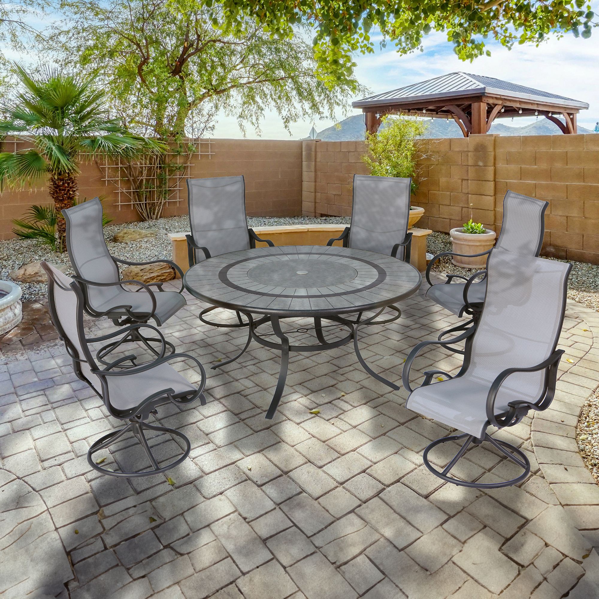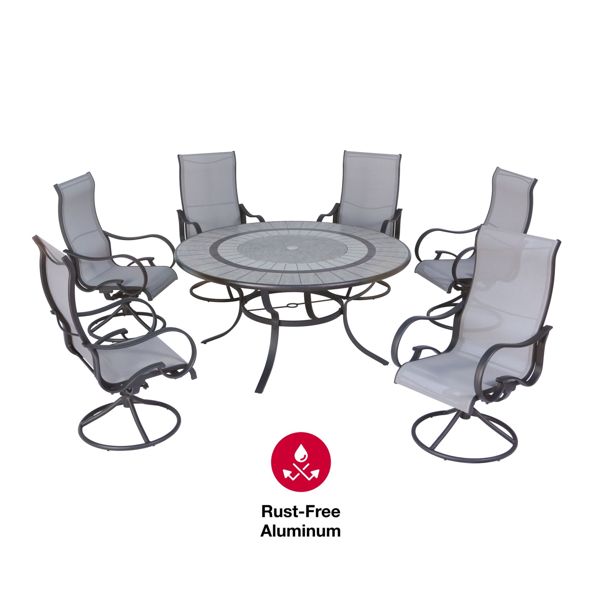 The Millbury seven-piece aluminum sling dining set is perfect for your patio. It features six swivel sling dining chairs and a round dining table with an integrated lazy susan and an engraved faux stone table top.