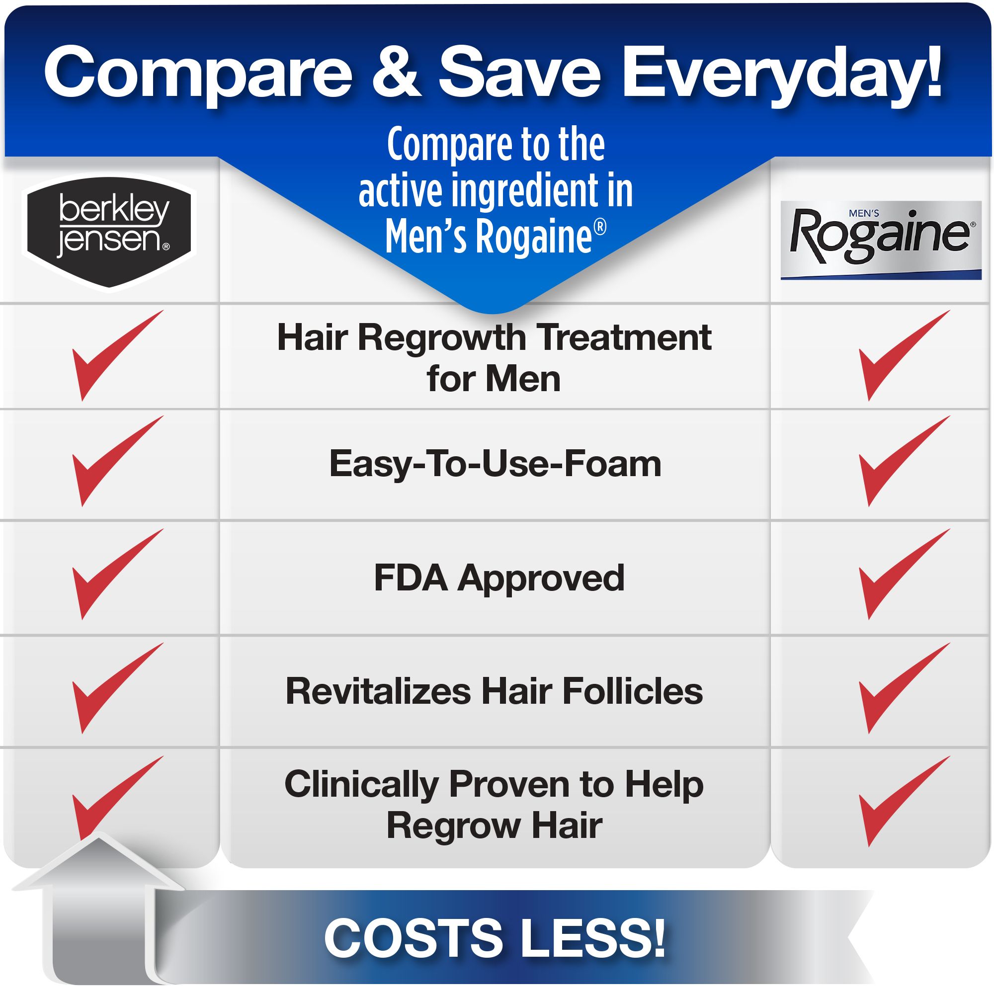 Hair regrowth treatment for men The active ingredient is minoxidil 5% Unscented, easy-to-use foam topical treatment Revitalizes hair follicles Clinically proven to help regrow hair Not intended for frontal baldness or receding hairline For men who have a general thinning of hair on the top of the scalp Not for use by women Includes four 2.11-oz. packs of hair regrowth treatment for men (120 day supply)