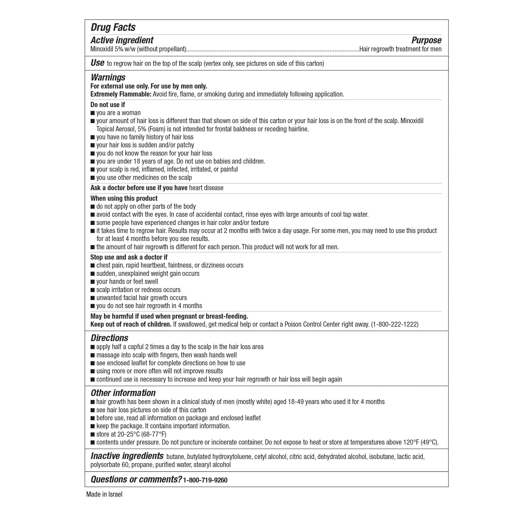 Minoxidil Topical Aerosol, 5% (Foam) is a hair regrowth treatment for men. The active ingredient is minoxidil 5%. It is an unscented, easy-to-use foam topical treatment that revitalizes hair follicles and is clinically proven to help regrow hair. It is not intended for frontal baldness or receding hairline; it is for men who have a general thinning of hair on the top of the scalp.