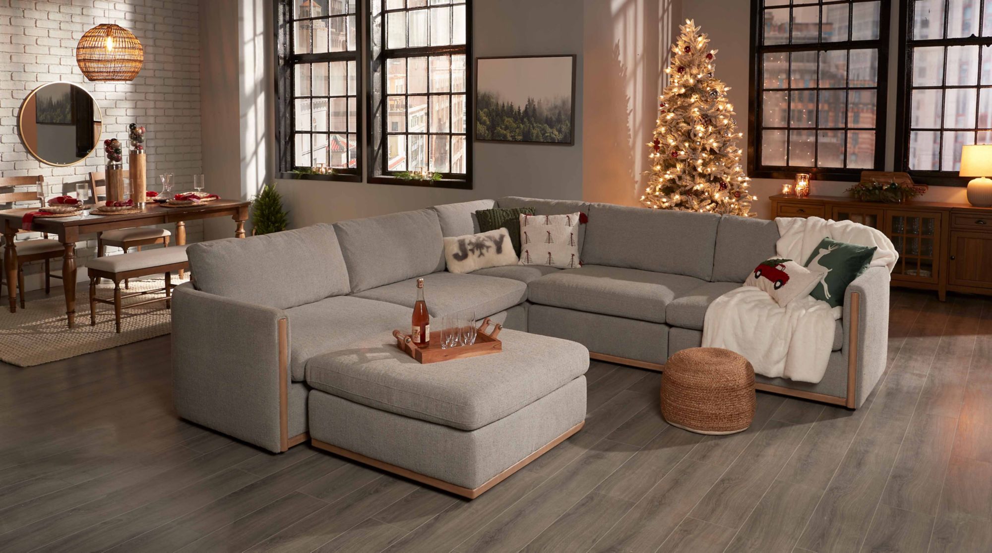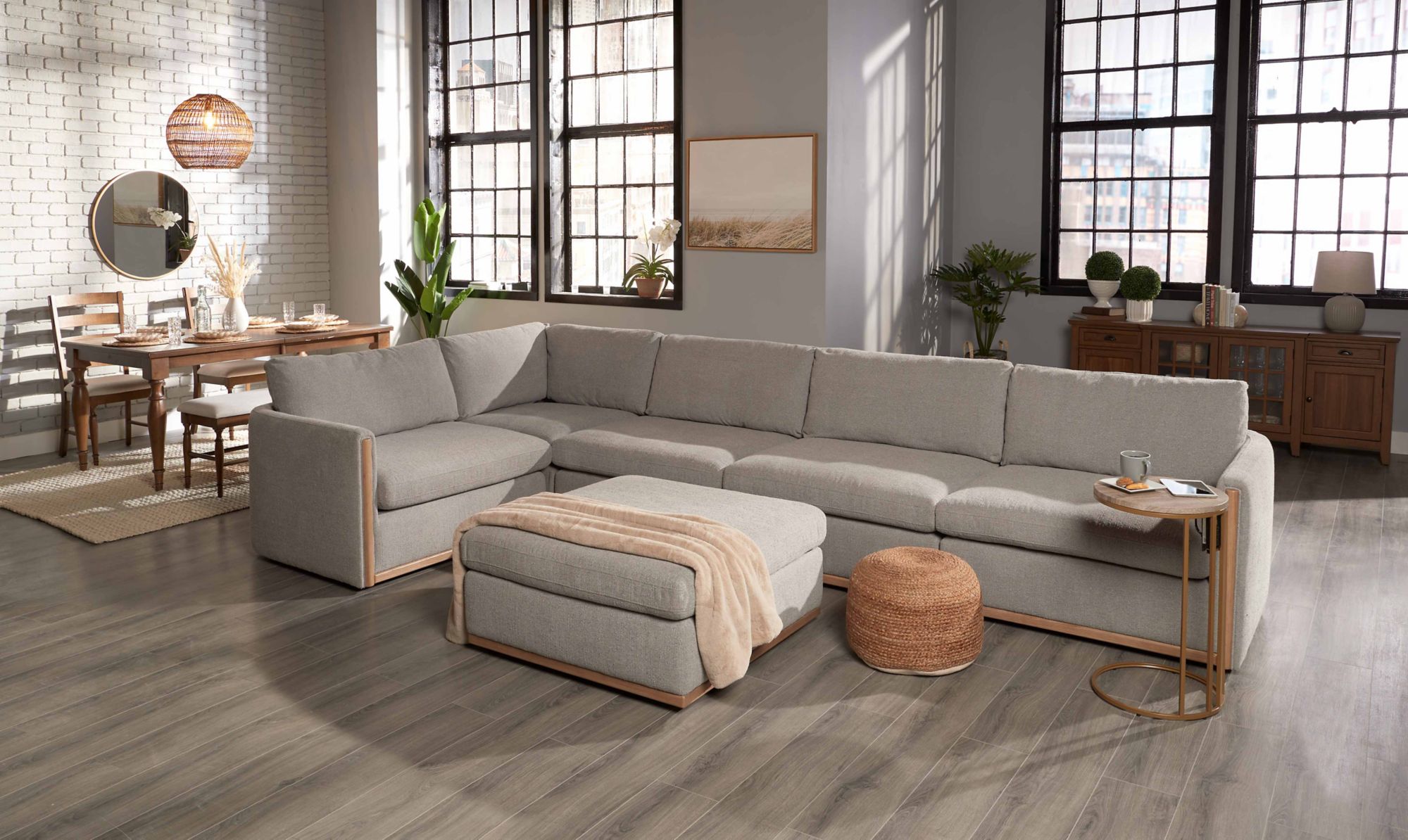 Introducing the modern, casual 6-pc. modular sectional with an ottoman, the perfect addition to any living space. This sectional features a sleek and stylish design, with a casual and modern aesthetic. The grey fabric is not only durable and long-lasting, but also stain-resistant, making it easy to maintain and keep looking like new. The modular design allows for easy customization and flexibility, making it perfect for any room and any occasion. Whether you're entertaining guests or just lounging with your family, this sectional can be configured in multiple ways to suit your space and seating needs. The ottoman can be used as extra seating, a footrest, or even as a coffee table. The sturdy construction and attention to detail make this sectional not only functional but also a beautiful piece of furniture. Upgrade your home decor with this modern, casual 6-pc. modular sectional with an ottoman.