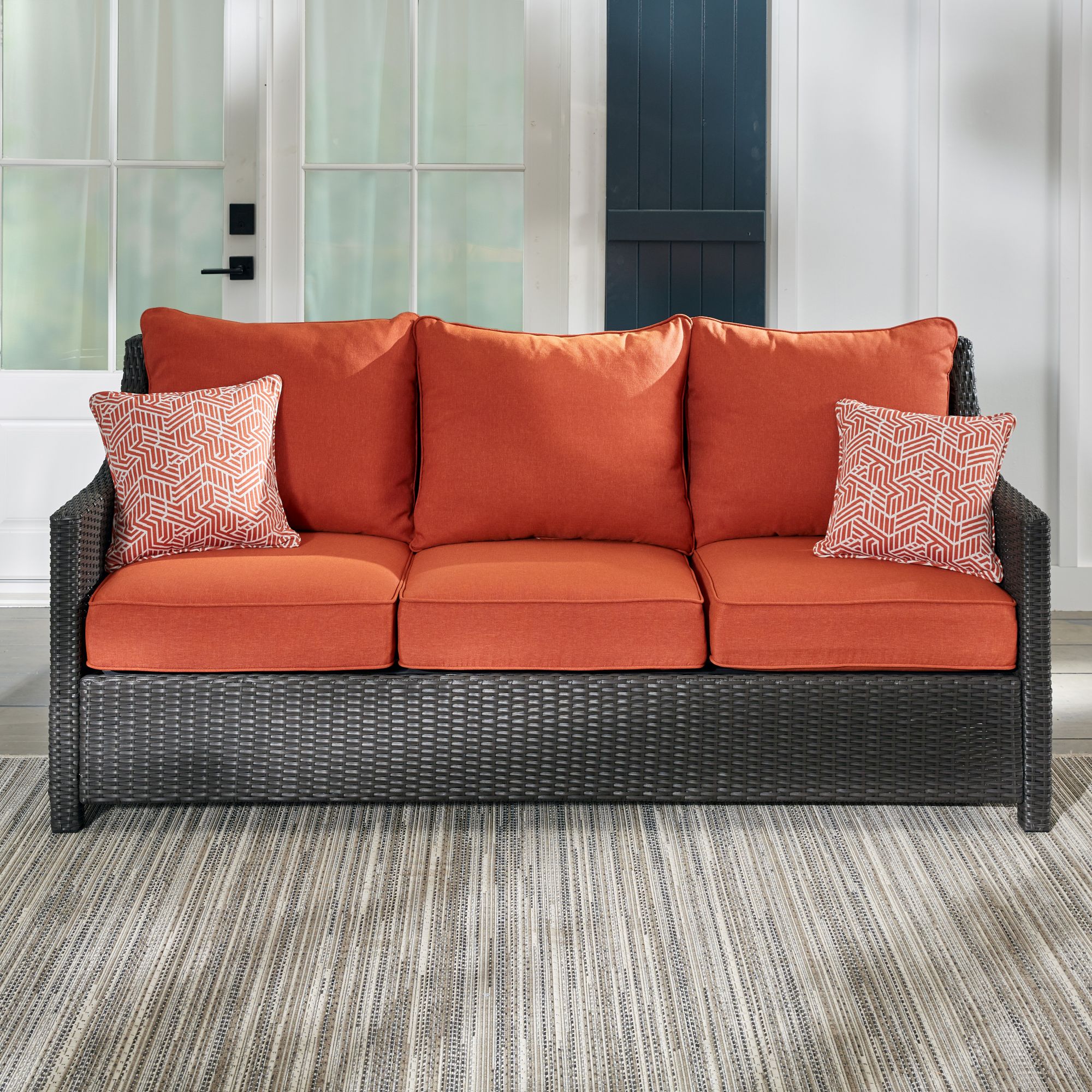 Rust-resistant galvanized steel frame with UV-protected Olefin fabric for outdoor use All-weather hand-woven wicker Easy assembly Packed in two separate boxes Includes one sofa, one coffee table, two chairs, five sets of cushions, and two toss pillows Warranty: 2 years on frame and fabric, 1 year on toss pillow fabric