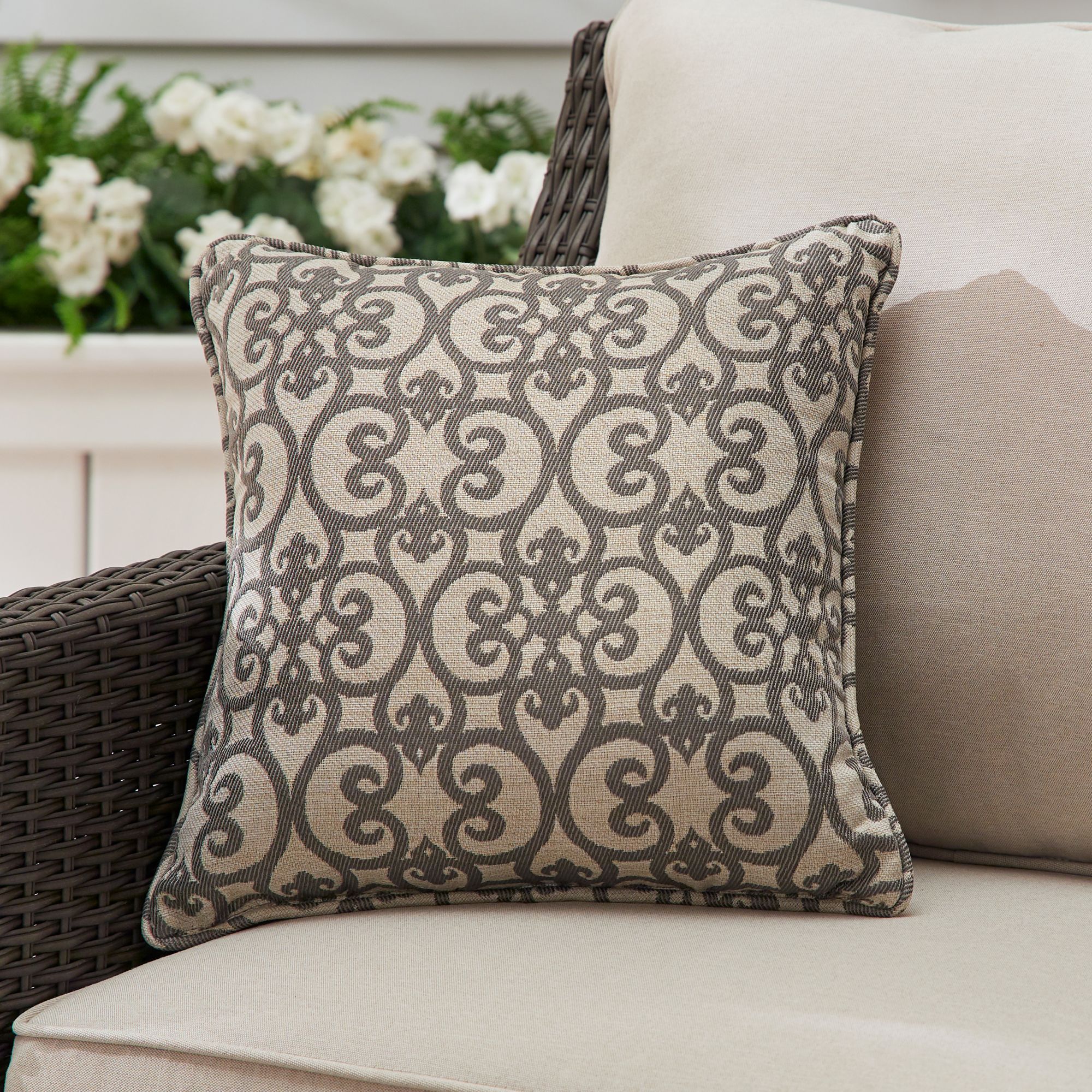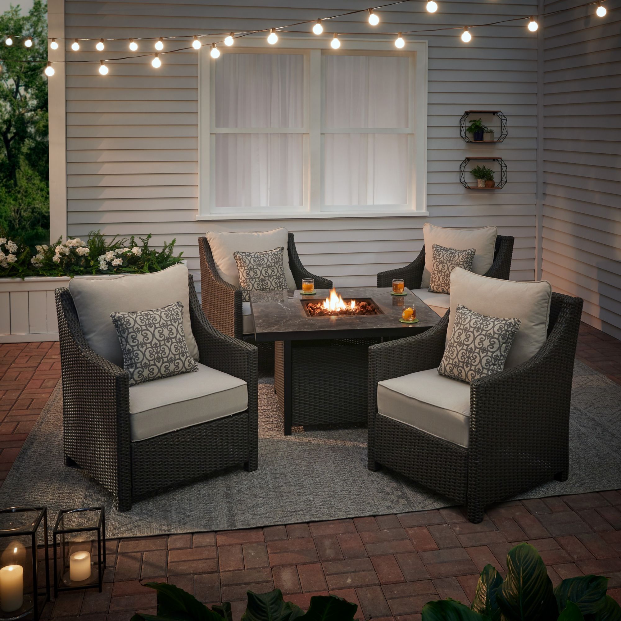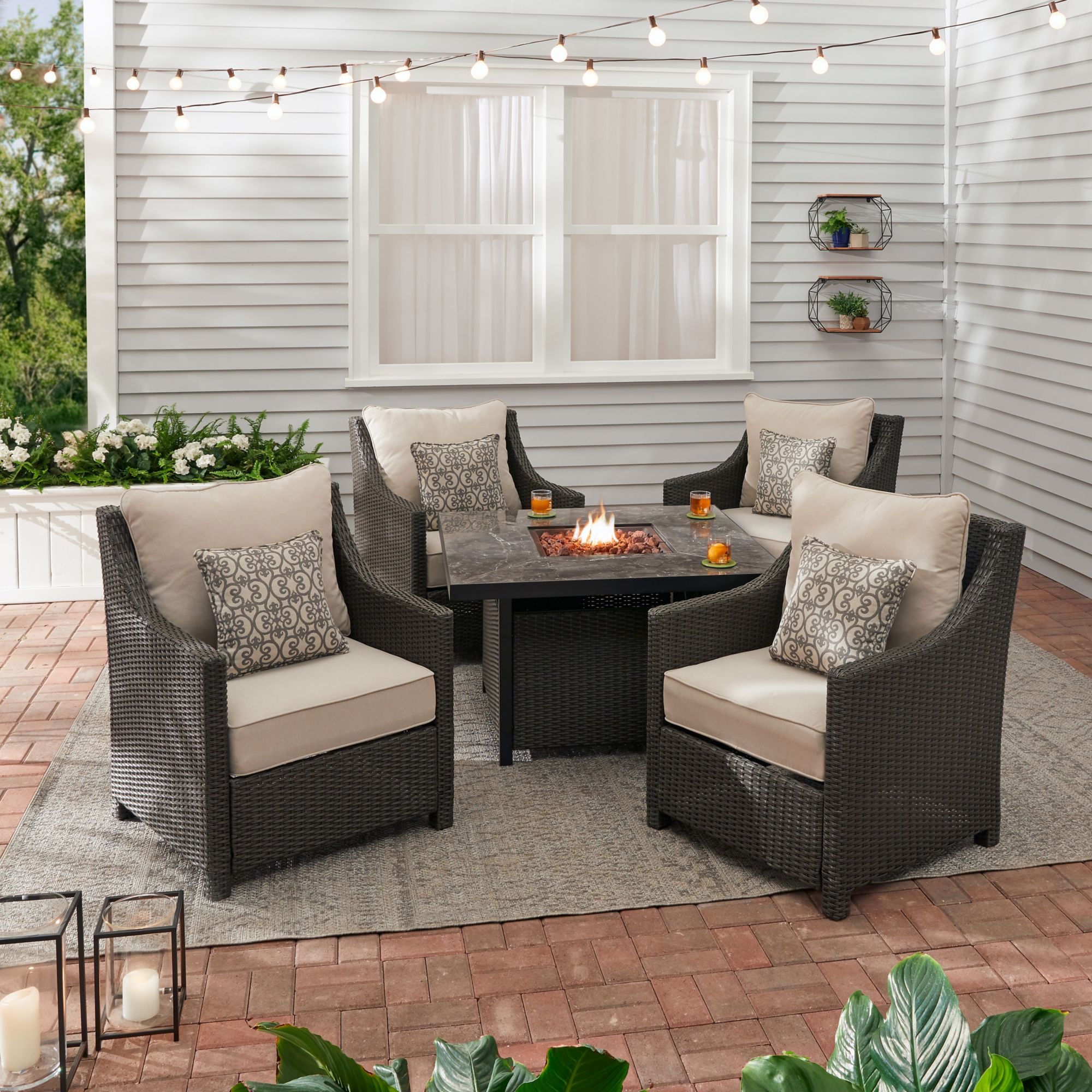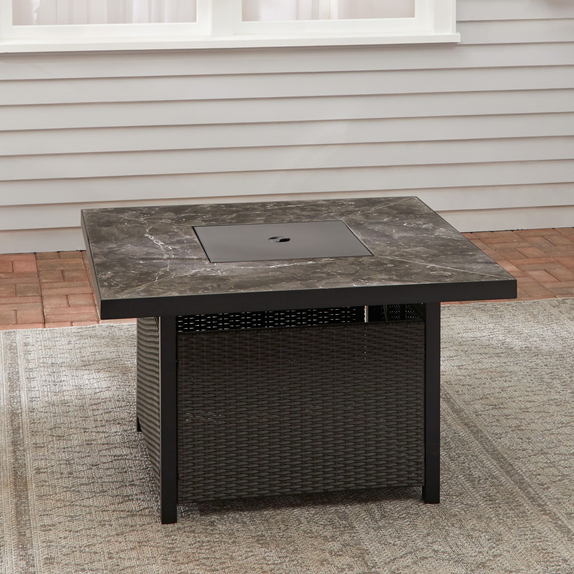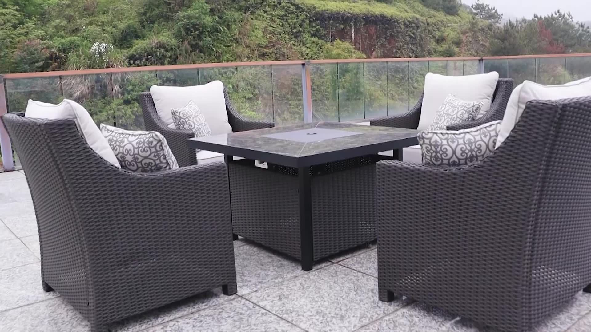 Rust-resistant galvanized steel frame with UV-protected Olefin fabric and wicker for outdoor use Durable heat and scratch-resistant granite-looking tile tabletop Includes one gas fire pit, four chairs, four sets of cushions, and four toss pillows Warranty: frame: 2 years, fabric: 2 years