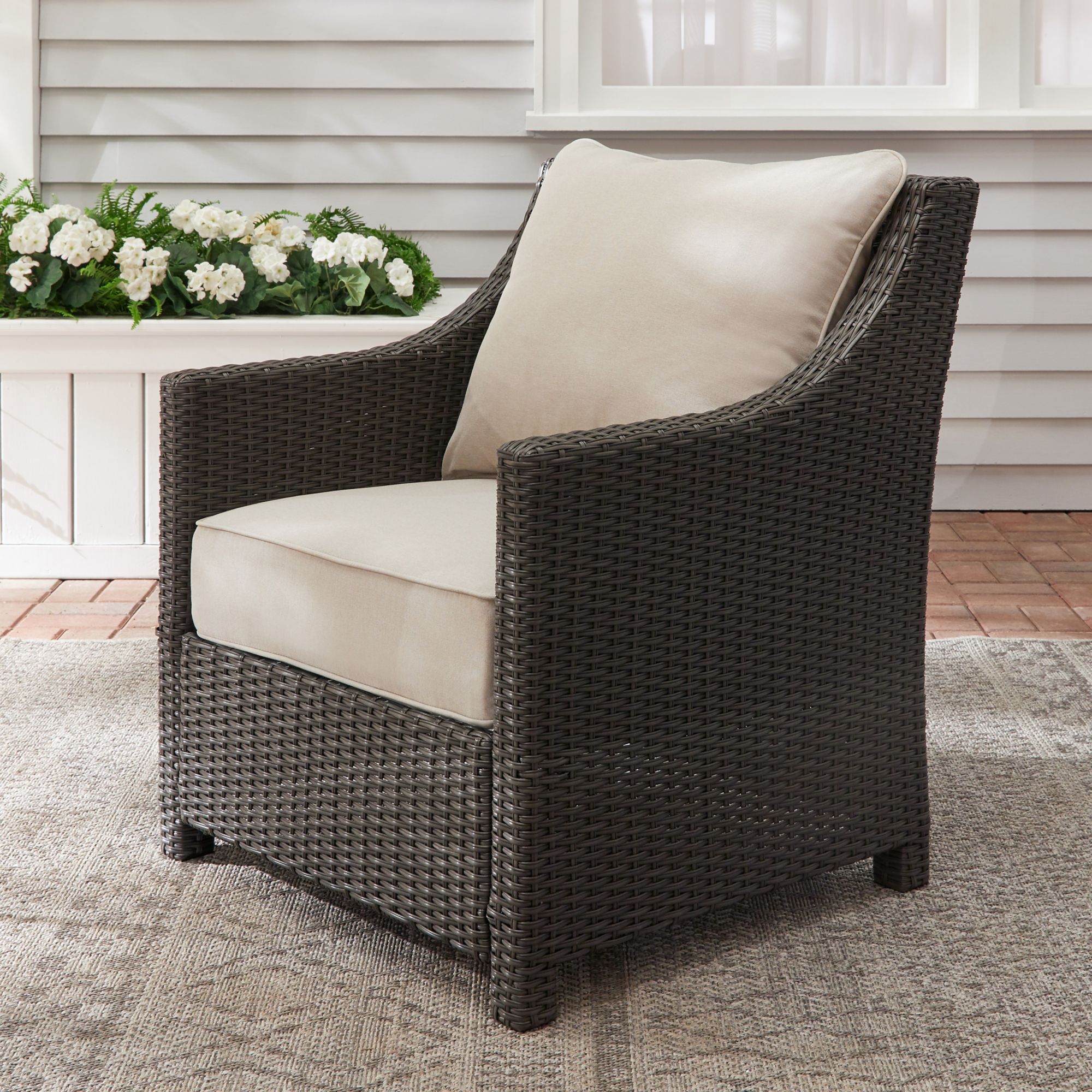 The Berkley Jensen Montauk 5-Pc. Firepit Chat Set with a liquid propane gas fire pit creates a comfortable ambiance in your outdoor living space. This stylish set is constructed with a heavy-duty galvanized steel frame. The fully woven stationary club chairs are handwoven by experienced artisans with weather-resistant synthetic wicker. The UV-protected olefin fabric deep seating cushions are accented with four beautiful throw pillows for a warm and cozy appearance. The CSA-certified gas fire pit with a 50000 BTU fire system not only gives ample warmth, the black granite-looking tile top is also heat and scratch-resistant. The 42" fire table comes with a flushed metal fire bowl cover which turns the fire pit into a table when the fire system is not in use. The set is easy to set up, use, and maintain so you can spend more time enjoying the outdoors with family and friends for years to come.