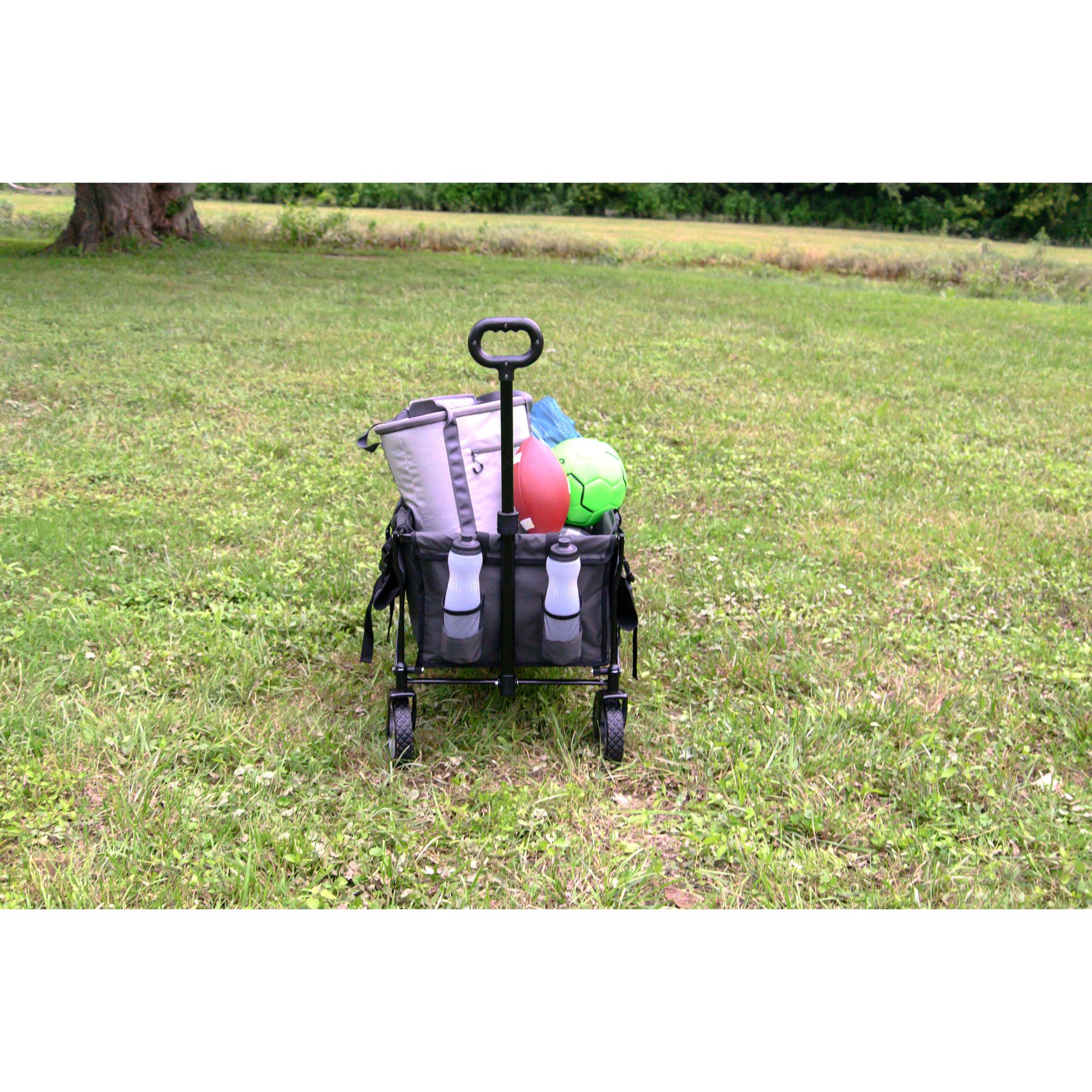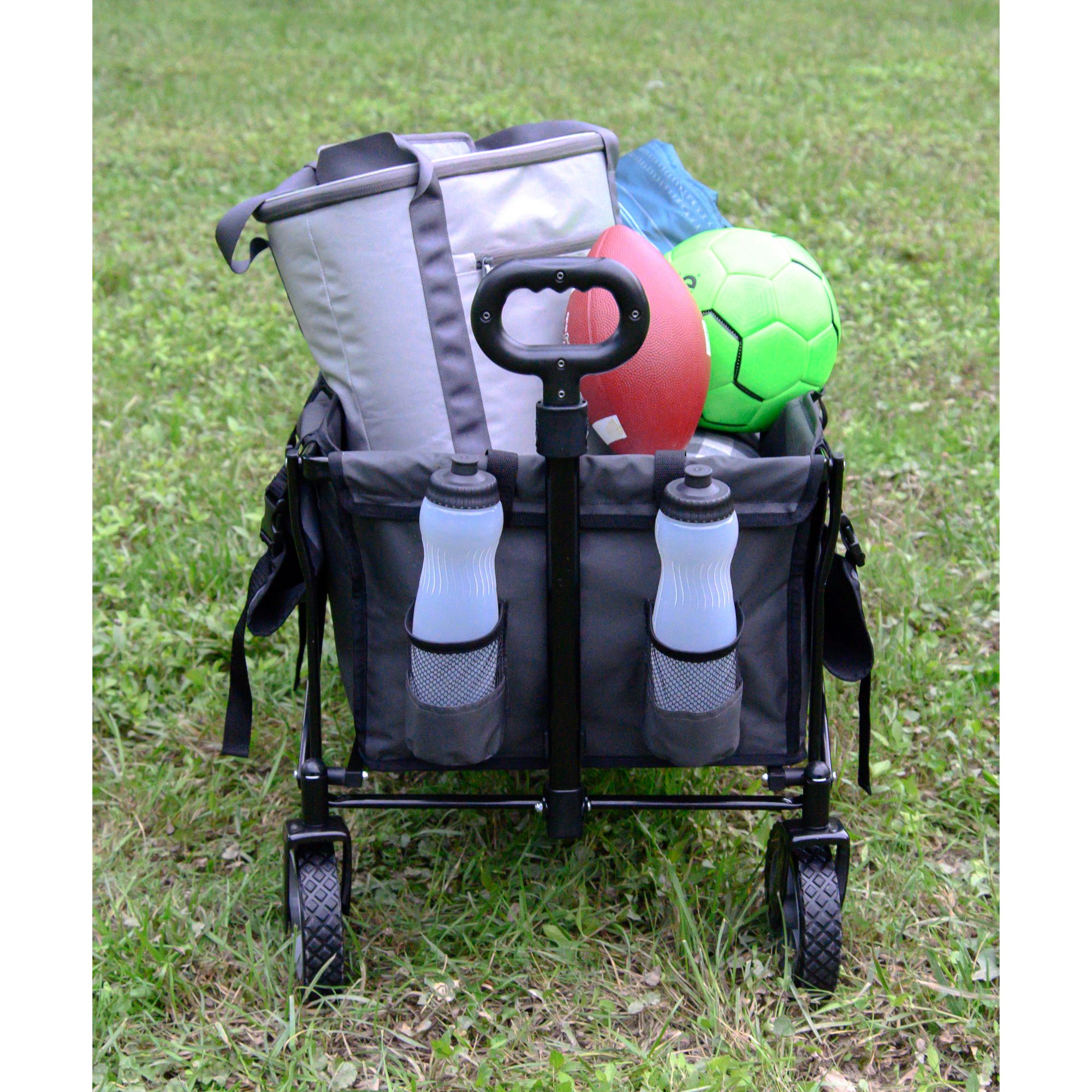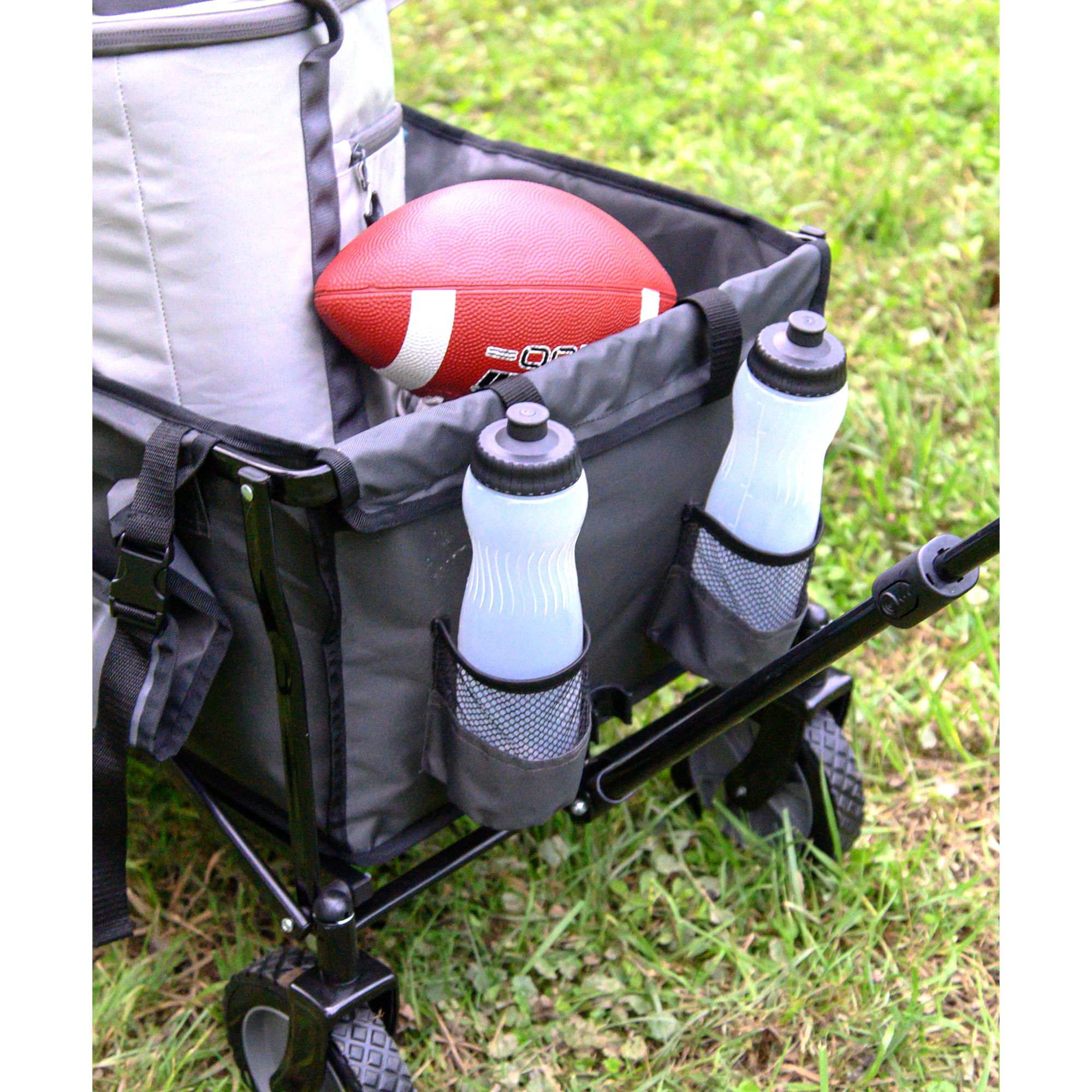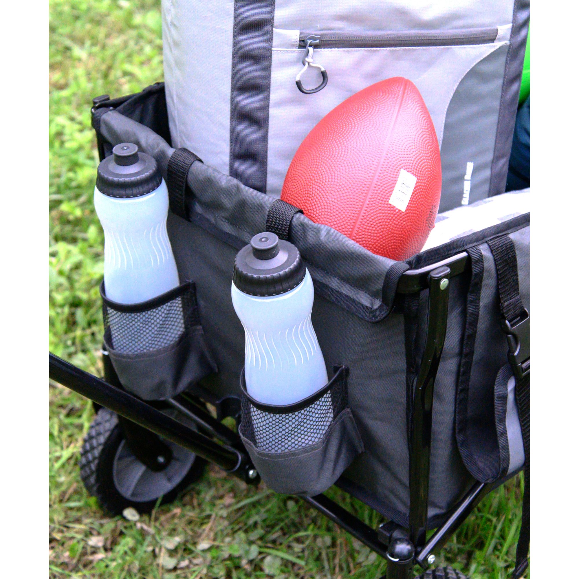 This folding cart has built-in chair holders, cupholders and can carry up to 180 lbs. of gear, groceries or other cargo. It's great for sporting events, picnics, camping or even shopping.