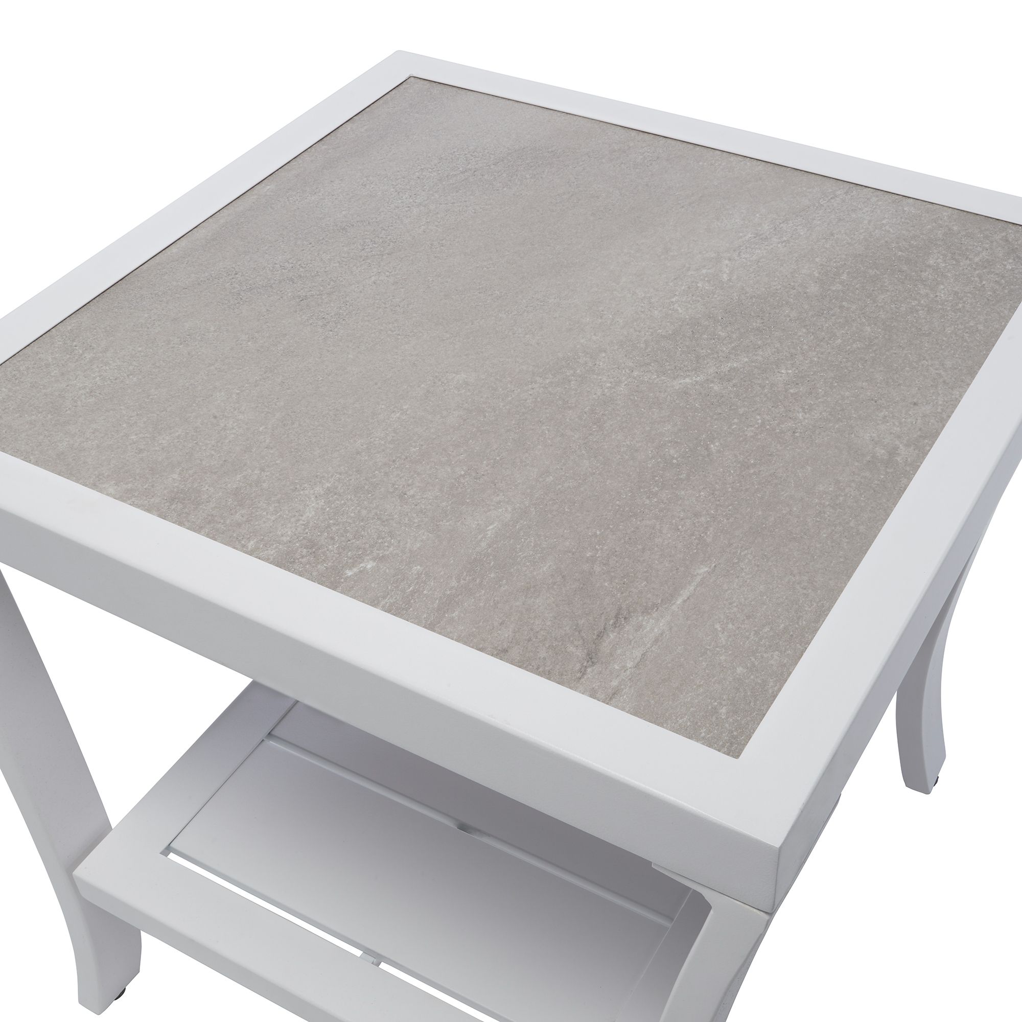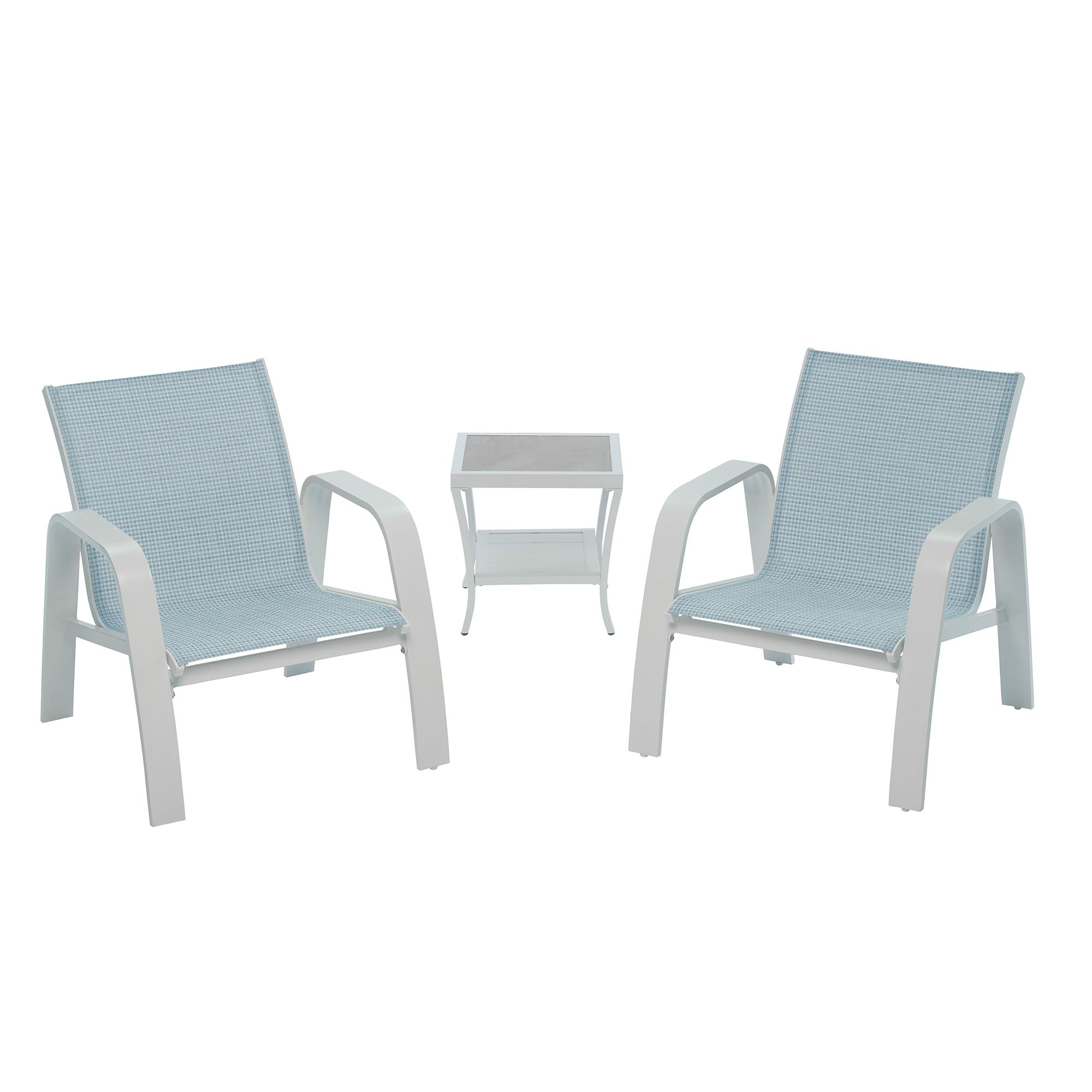 Experience ultimate comfort and style with the mystic -Pc. set. This sleek set includes two oversized sling lounge chairs and an 18" x 18" porcelain tile-top side table, perfect for relaxing outdoors. Each chair features Phifer sling fabric, known for its carefree maintenance and durability. Crafted with rust-free aluminum frames in a crisp white finish, the Evan set combines modern aesthetics with practicality, making it an ideal addition to any patio or outdoor space.