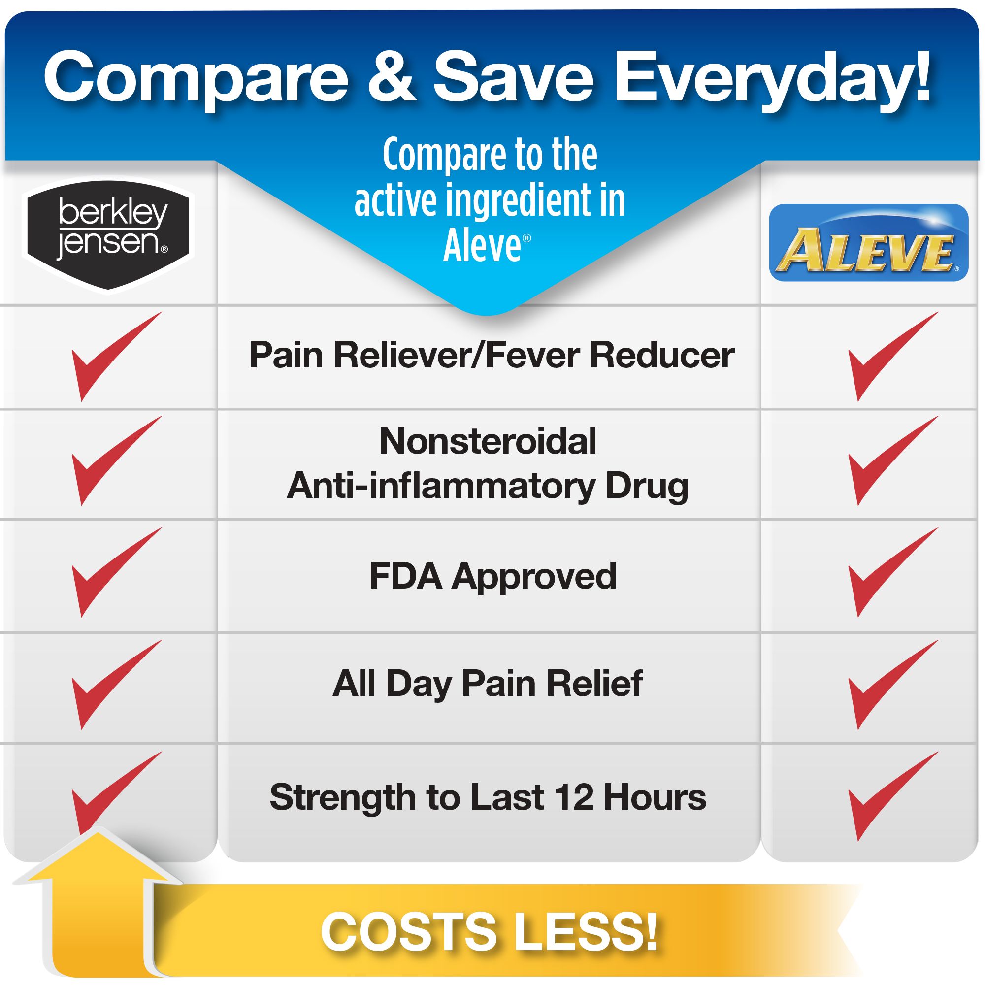 Berkley Jensen 220mg Naproxen Sodium can be used for the temporary relief of minor aches and pains associated with the common cold, headaches, toothaches, muscular aches, backache and arthritis. It can also be used for the reduction of fever. Included in each bottle are 400 caplets.