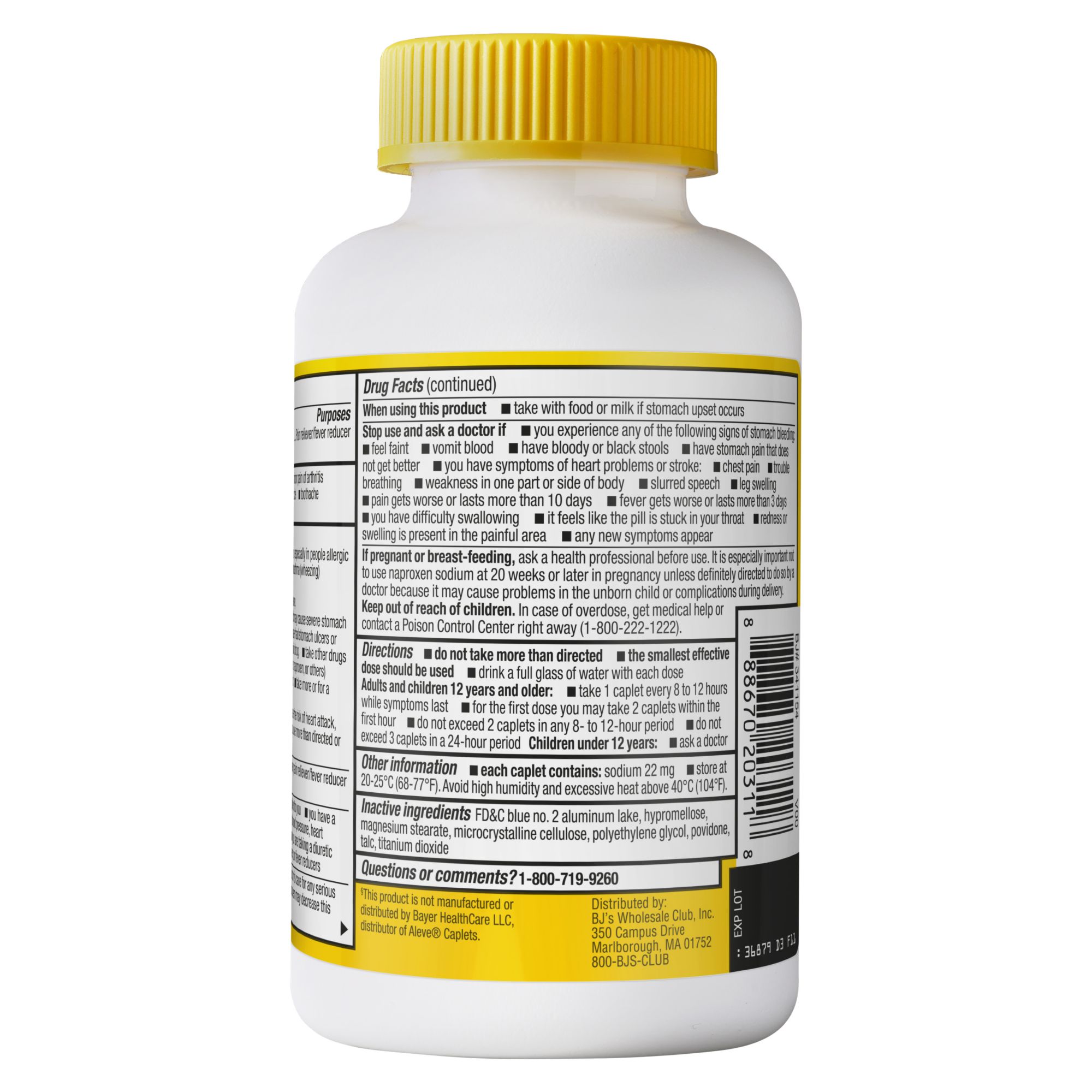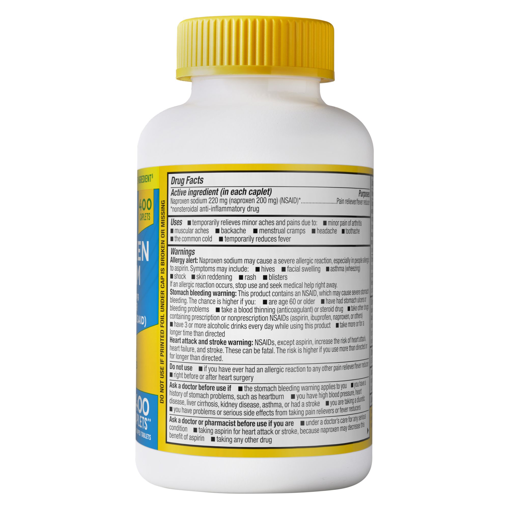 Product Warnings and Restrictions: Warnings: Allergy Alert: Naproxen Sodium May Cause a Severe Allergic Reaction, Especially in People Allergic to Aspirin. Symptoms May Include: Hives; Facial Swelling; Asthma (Wheezing); Shock; Skin Reddening; Rash; Blisters. If an Allergic Reaction Occurs, Stop Use and Seek Medical Help Right Away. Stomach Bleeding Warning: This Product Contains an NSAID, Which May Cause Severe Stomach Bleeding. The Chance Is Higher If You: Are Age 60 or Older; Have Had Stomach Ulcers or Bleeding Problems; Take a Blood-Thinning (Anticoagulant) or Steroid Drug; Take Other Drugs Containing Prescription or Nonprescription NSAIDs (Aspirin, Ibuprofen, Naproxen, or Others); Have 3 or More Alcoholic Drinks Every Day While Using This Product; Take More or for a Longer Time Than Directed. Heart Attack and Stroke Warning: NSAIDs, Except Aspirin, Increase the Risk of Heart Attack, Heart Failure, and Stroke. These Can Be Fatal. The Risk Is Higher If You Use More Than Directed or for Longer Than Directed. Do Not Use: If You Have Ever Had an Allergic Reaction to Any Other Pain Reliever/Fever Reducer; Right Before or After Heart Surgery. Ask a Doctor Before Use If: The Stomach Bleeding Warning Applies to You; You Have a History of Stomach Problems, Such as Heartburn; You Have High Blood Pressure, Heart Disease, Liver Cirrhosis, Kidney Disease, Asthma, or Had a Stroke; You Are Taking a Diuretic; You Have Problems or Serious Side Effects From Taking Pain Relievers or Fever Reducers. Ask a Doctor or Pharmacist Before Use If You Are: Under a Doctor’s Care for Any Serious Condition; Taking Aspirin for Heart Attack or Stroke, Because Naproxen May Decrease This Benefit of Aspirin; Taking Any Other Drug. When Using This Product: Take With Food or Milk If Stomach Upset Occurs. Stop Use and Ask a Doctor If: You Experience Any of the Following Signs of Stomach Bleeding: Feel Faint; Vomit Blood; Have Bloody or Black Stools; Have Stomach Pain That Does Not Get Better; You Have Symptoms of Heart Problems or Stroke: Chest Pain; Trouble Breathing; Weakness in One Part or Side of Body; Slurred Speech; Leg Swelling; Pain Gets Worse or Lasts More Than 10 Days; Fever Gets Worse or Lasts More Than 3 Days; You Have Difficulty Swallowing; It Feels Like the Pill Is Stuck in Your Throat; Redness or Swelling Is Present in the Painful Area; Any New Symptoms Appear. If Pregnant or Breastfeeding, Ask a Health Professional Before Use. It Is Especially Important Not to Use Naproxen Sodium at 20 Weeks or Later in Pregnancy Unless Definitely Directed to Do So by a Doctor Because It May Cause Problems in the Unborn Child or Complications During Delivery. Keep Out of Reach of Children. In Case of Overdose, Get Medical Help or Contact a Poison Control Center Right Away (1-800-222-1222).