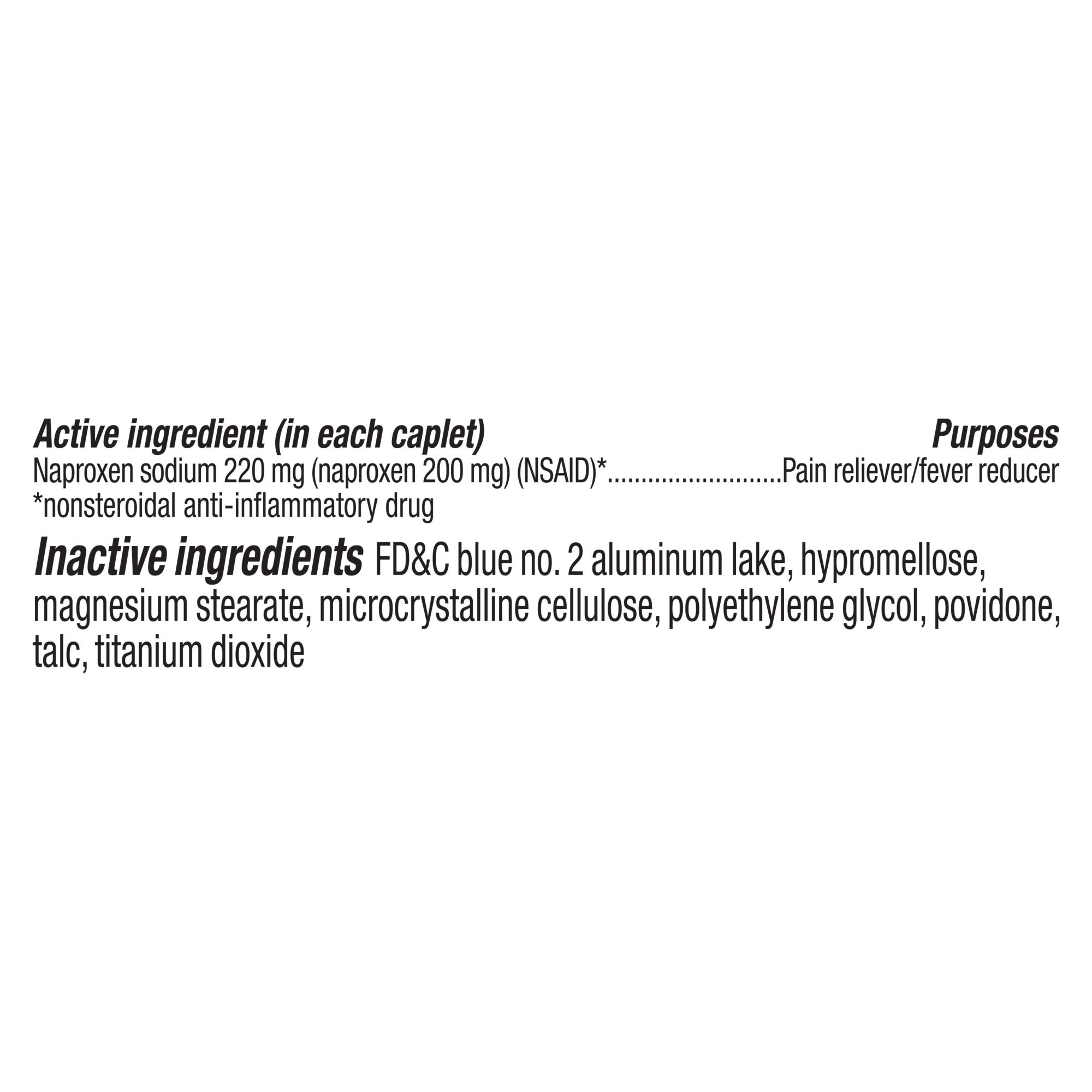 Ingredients: Active Ingredient (In Each Caplet): Naproxen Sodium 220mg (Naproxen 200mg) (NSAID)* *Nonsteroidal Anti-Inflammatory Drug. Inactive Ingredients: FD&C Blue No. 2 Aluminum Lake, Hypromellose, Magnesium Stearate, Microcrystalline Cellulose, Polyethylene Glycol, Povidone, Talc, Titanium Dioxide.
