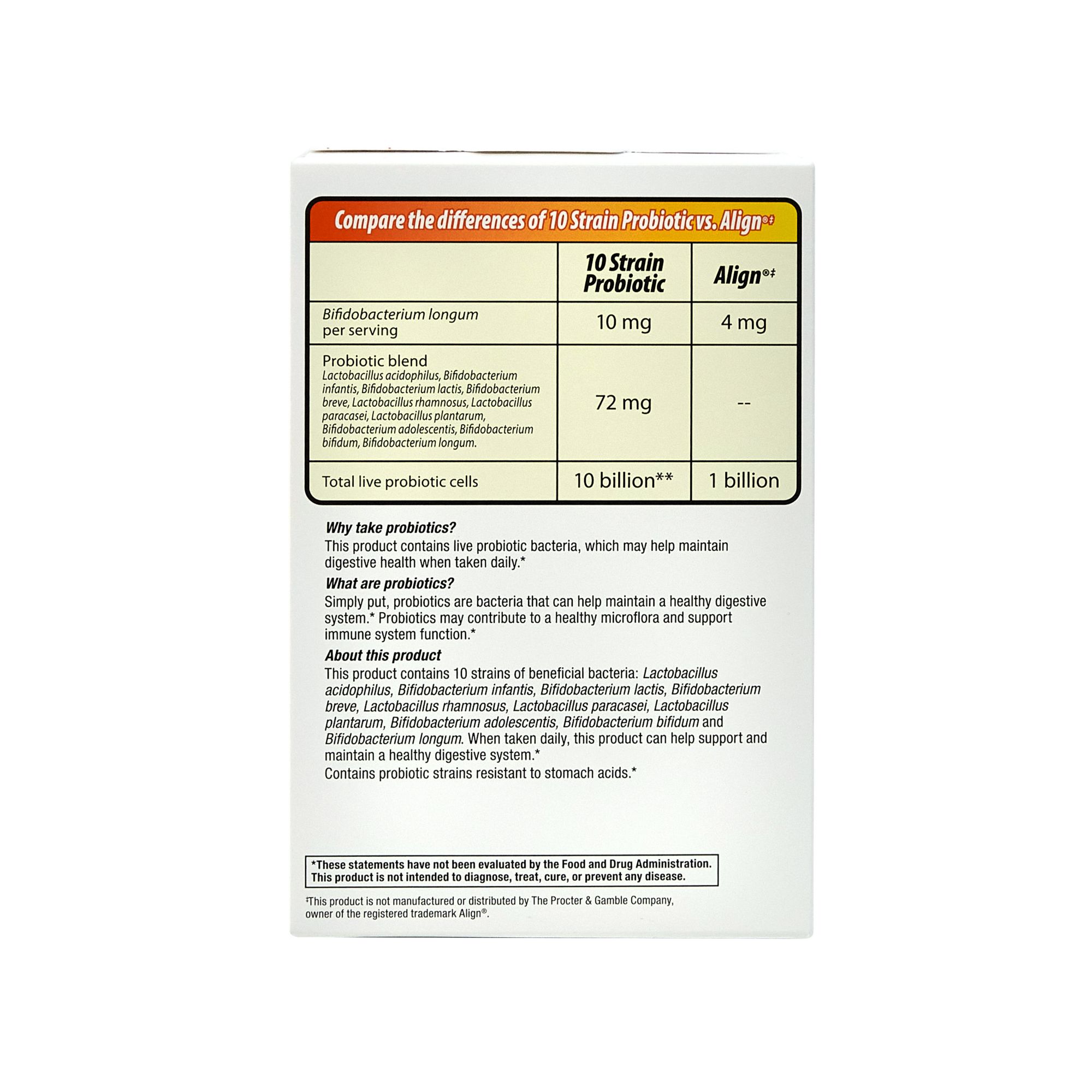Each 1-capsule serving contains 10 billion CFUs from 10 probiotic strains Helps support and maintain a healthy immune system Promotes gastrointestinal health and digestive system balance 120 servings per bottle Contains 10 strains of natural, beneficial bacteria Includes 120 capsules
