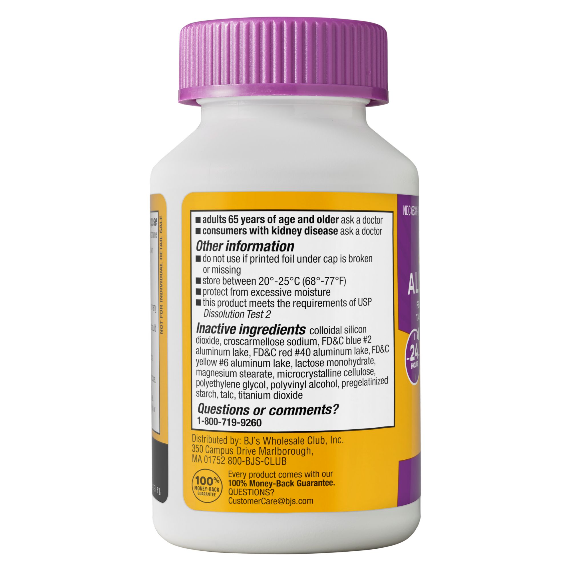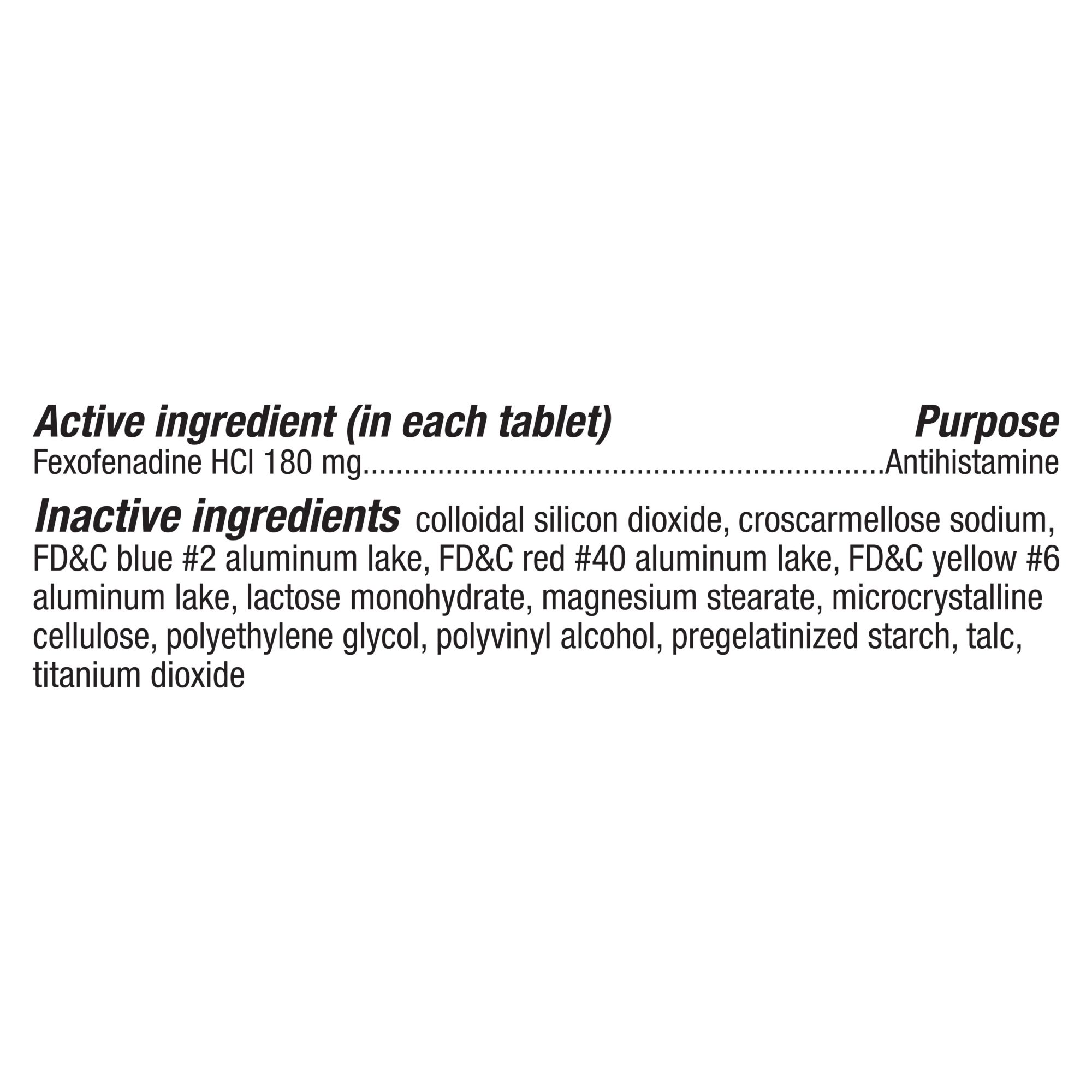 Ingredients: Active Ingredient (In Each Tablet): Fexofenadine HCl 180mg. Inactive Ingredients: Colloidal Silicon Dioxide, Croscarmellose Sodium, FD&C Blue #2 Aluminum Lake, FD&C Red #40 Aluminum Lake, FD&C Yellow #6 Aluminum Lake, Lactose Monohydrate, Magnesium Stearate, Microcrystalline Cellulose, Polyethylene Glycol, Polyvinyl Alcohol, Pregelatinized Starch, Talc, Titanium Dioxide.