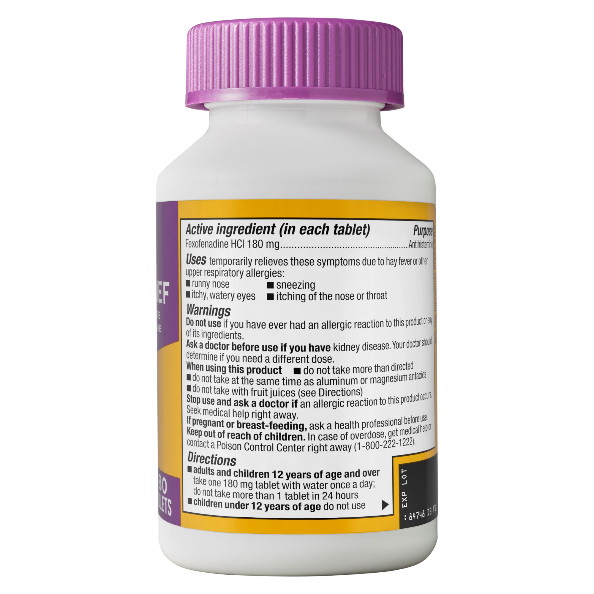 Product Warnings and Restrictions: Warnings: Do Not Use If You Have Ever Had an Allergic Reaction to This Product or Any of Its Ingredients. Ask a Doctor Before Use If You Have Kidney Disease. Your Doctor Should Determine If You Need a Different Dose. When Using This Product: Do Not Take More Than Directed; Do Not Take at the Same Time as Aluminum or Magnesium Antacids; Do Not Take With Fruit Juices (See Directions). Stop Use and Ask a Doctor If an Allergic Reaction to This Product Occurs. Seek Medical Help Right Away. If Pregnant or Breastfeeding, Ask a Health Professional Before Use. Keep Out of Reach of Children. In Case of Overdose, Get Medical Help or Contact a Poison Control Center Right Away (1-800-222-1222)