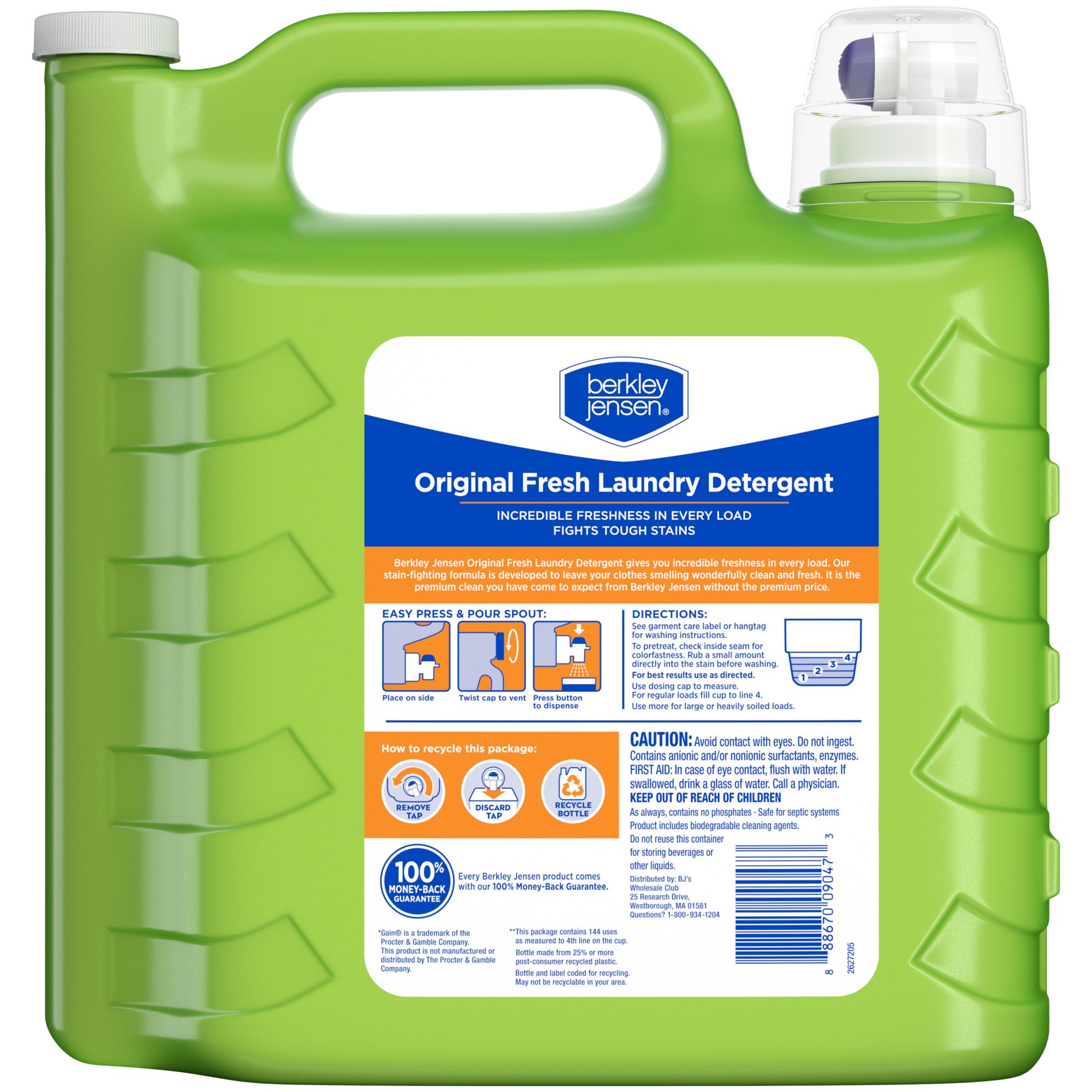 Berkley Jensen Original Fresh Laundry Detergent gives you incredible freshness in every load. Our stain-fighting formula is developed to leave your clothes smelling wonderfully clean and fresh. It is 144 loads of the premium clean you have come to expect from Berkley Jensen without the premium price.
