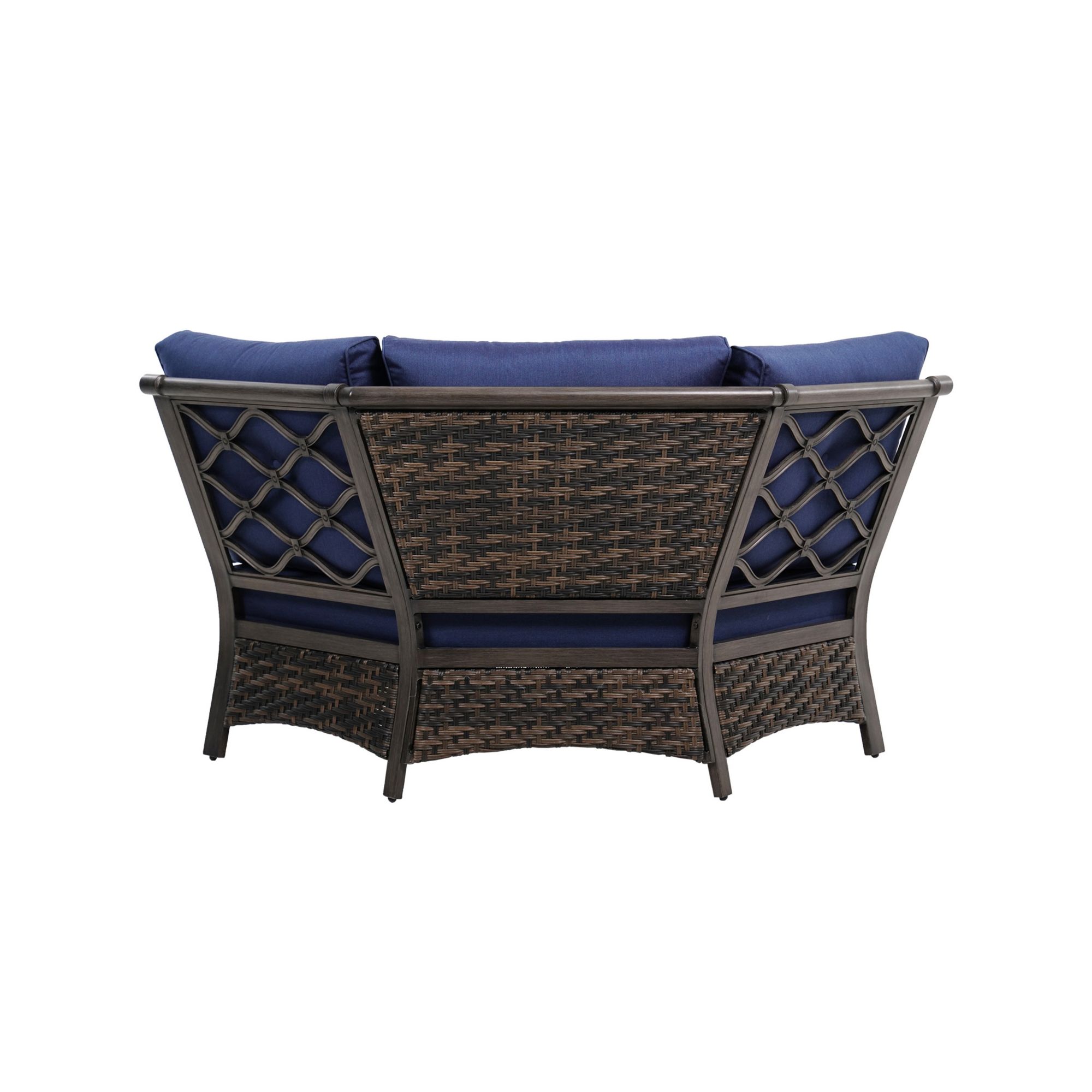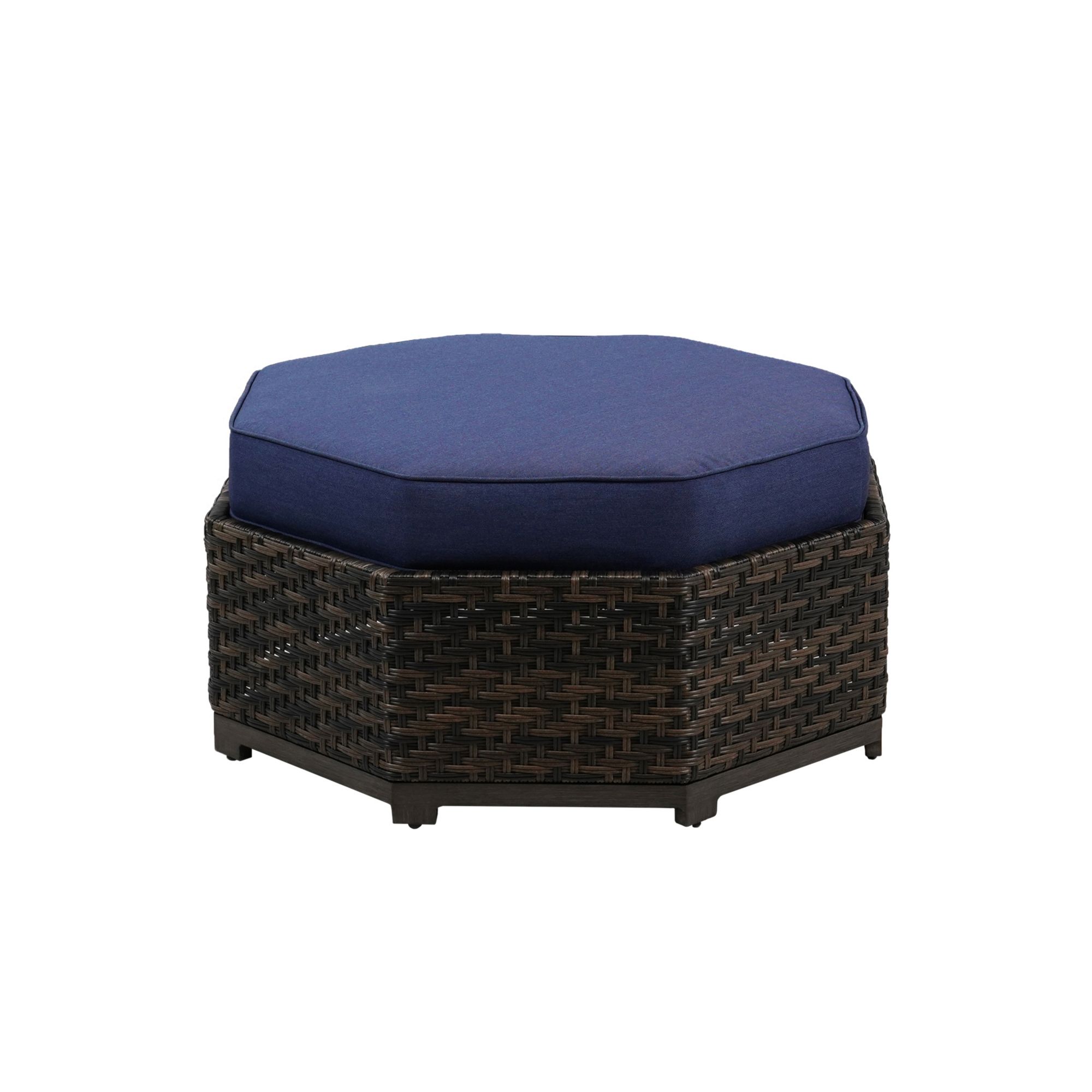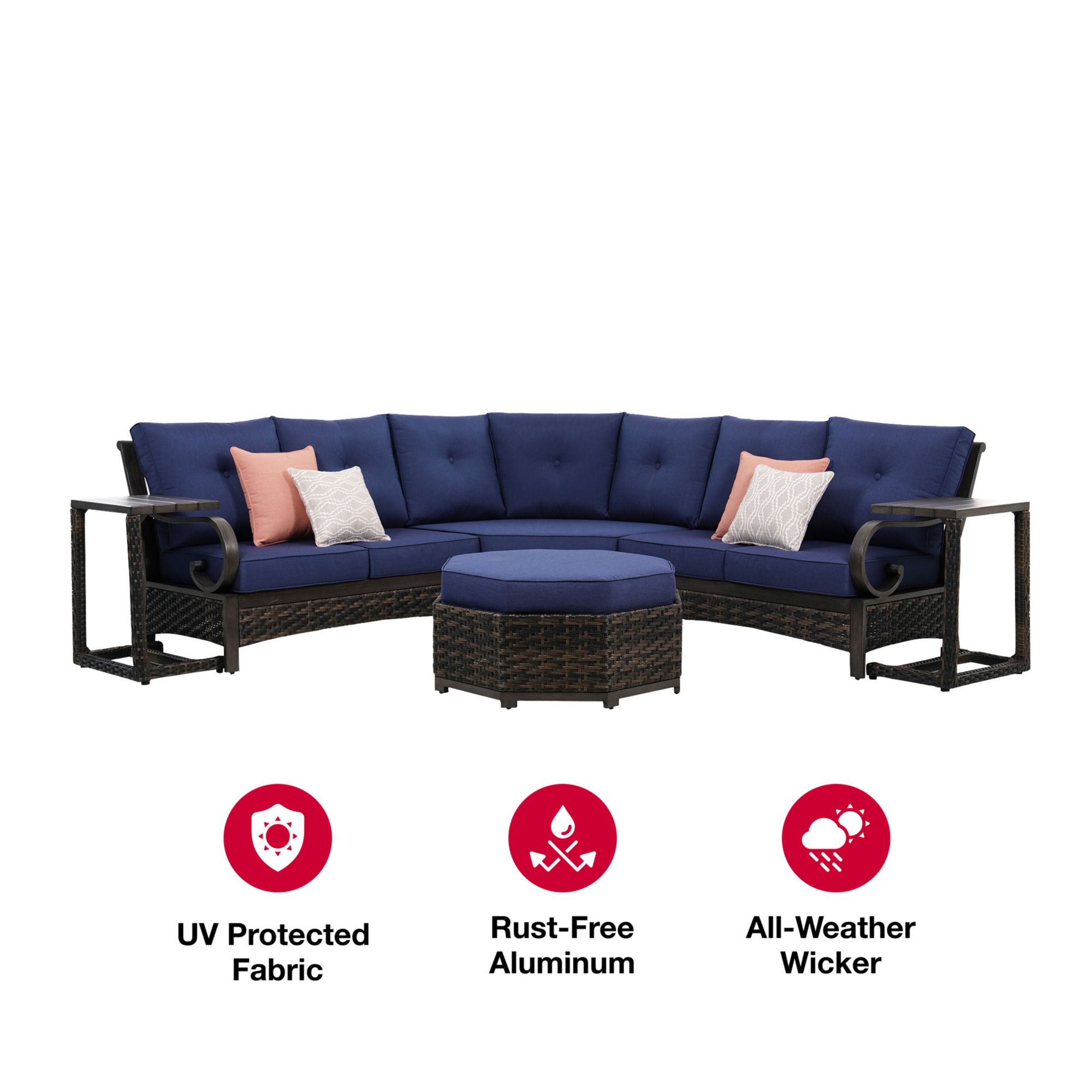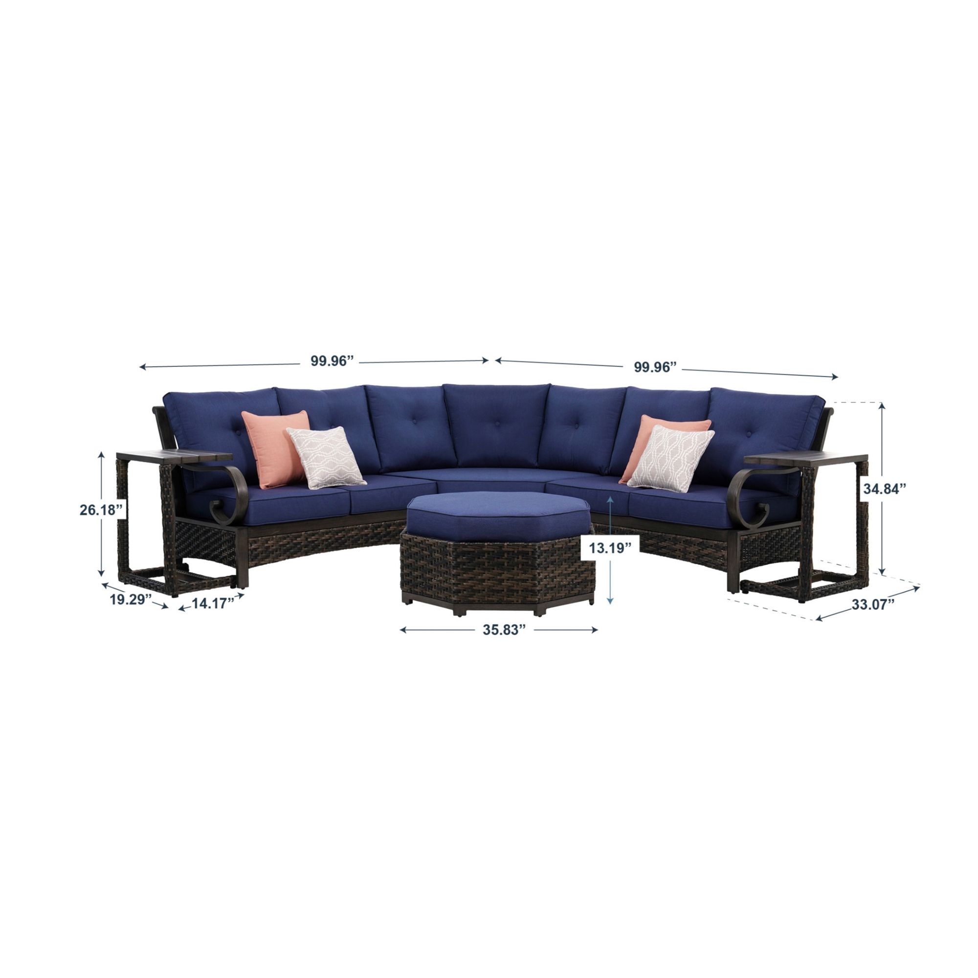 Crafted for timeless appeal, the Berkley Jensen Windsor six-piece sectional set combines the rustic charm of farmhouse style with the resilience of modern materials, presented in a warm brown aluminum frame and dark multi-brown wicker. The L-shaped sectional is paired with plush, dark blue cushions that boast water and UV resistance, ensuring both comfort and durability. Two movable C-tables enhance the functionality, perfect for hosting refreshments or books, while an upholstered, octagonal ottoman adds a unique touch and extra seating. Complemented by four chic Sunbrella fabric accent pillows, this set invites relaxed conversations by the pool or on the patio. It's a sophisticated and practical choice for those who seek to create a serene outdoor retreat.