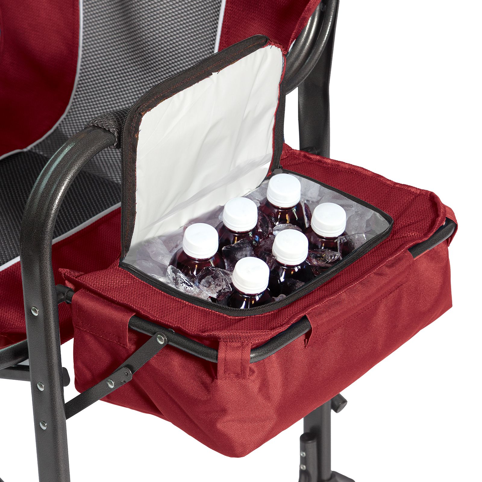 Exclusive oversized frame, two-tone herringbone fabric with side color and snack table Two tone powder coated oversized frame Two tone herringbone burgundy polyester fabric skin Breathable and moisture-wicking foam back mesh Side snack table with cup holder Fold-away snack cooler with 12 can capacity Folds flat for easy transport and storage Padded arms and headrest Includes steel, plastic, polyester, foam back mesh