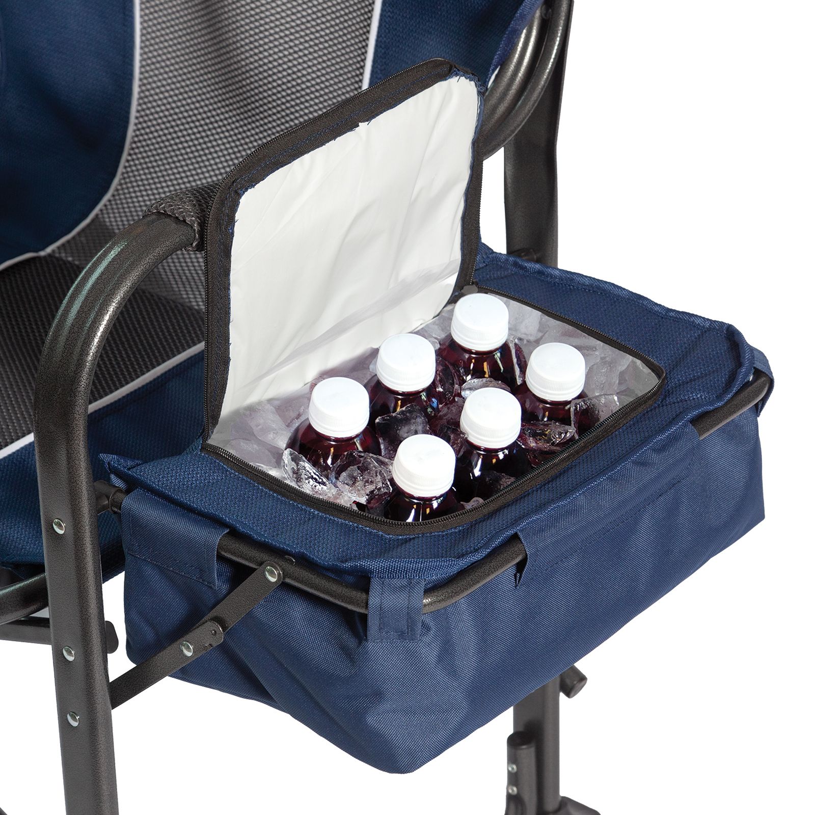 Exclusive oversized frame, two-tone herringbone fabric with side color and snack table Two tone powder coated oversized frame Two tone herringbone navy polyester fabric skin Breathable and moisture-wicking foam back mesh Side snack table with cup holder Fold-away snack cooler with 12 can capacity Folds flat for easy transport and storage Padded arms and headrest Includes steel, plastic, polyester, foam back mesh