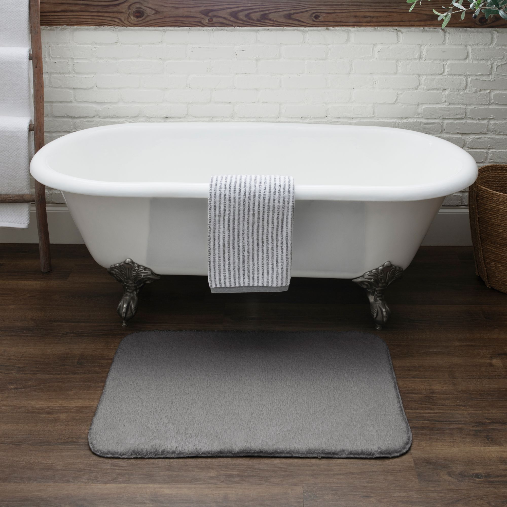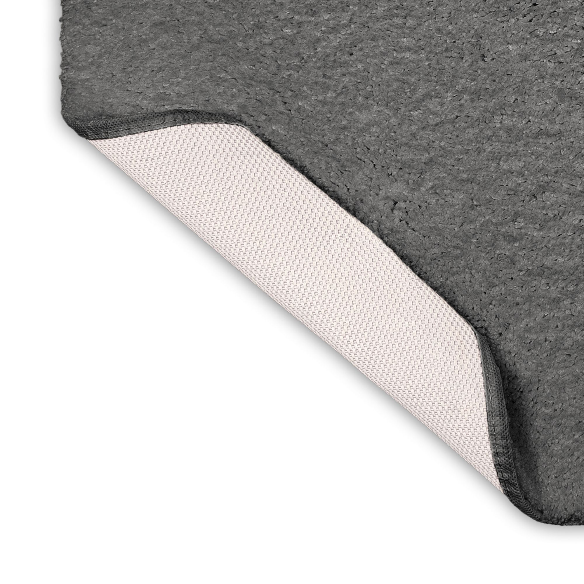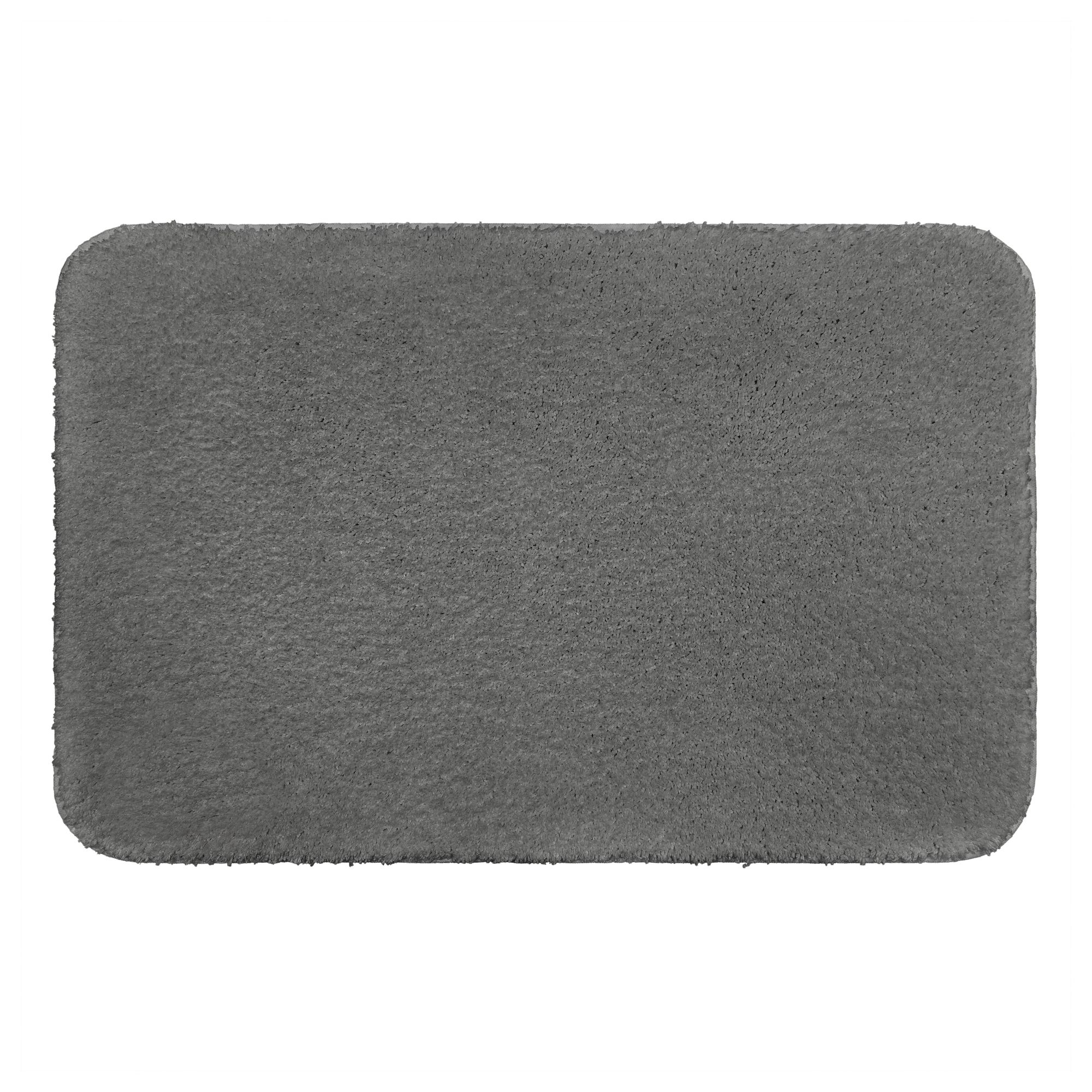 Plush bath rug Skid resistant backing Easy care 100% PET polyester face Gray Machine wash Includes bath mat
