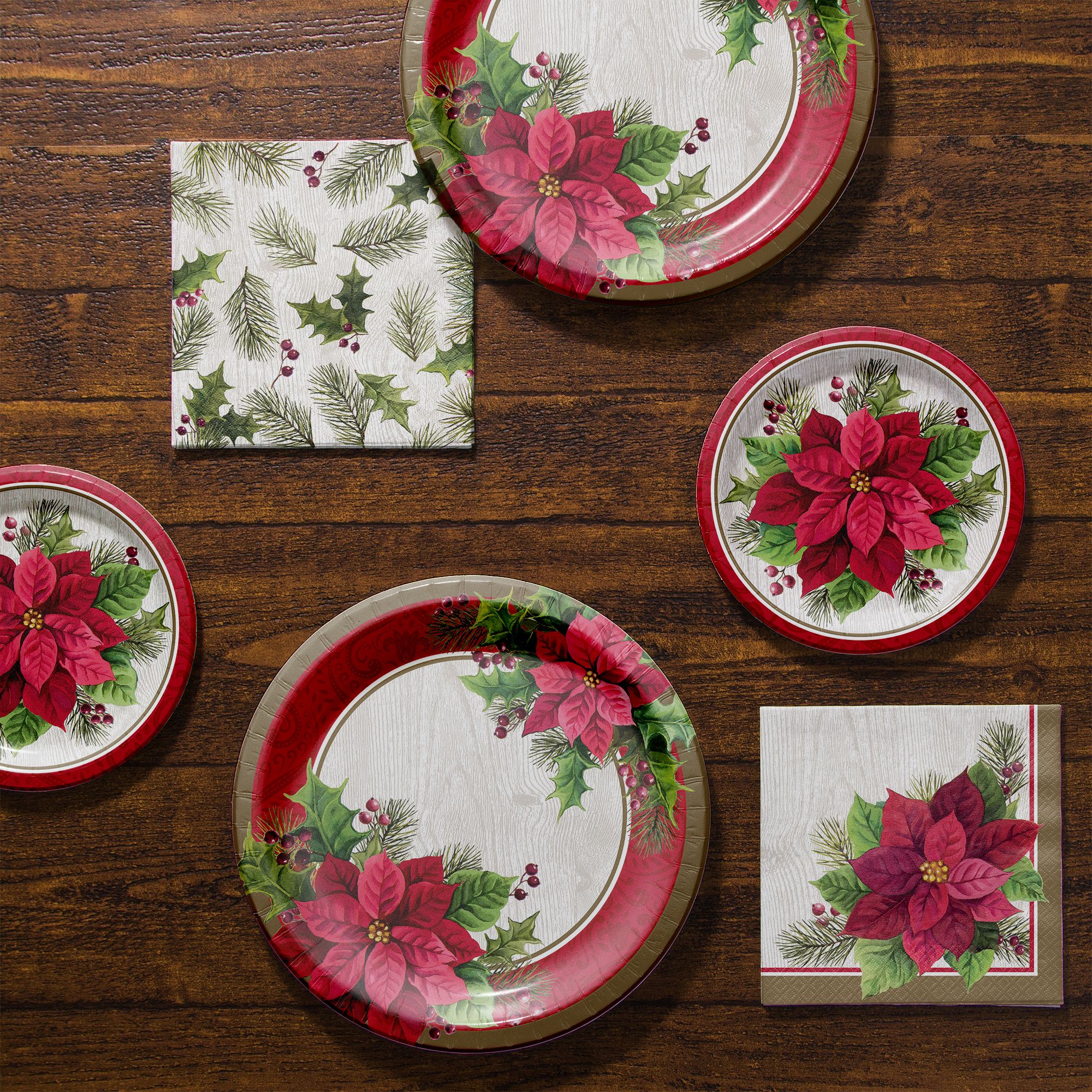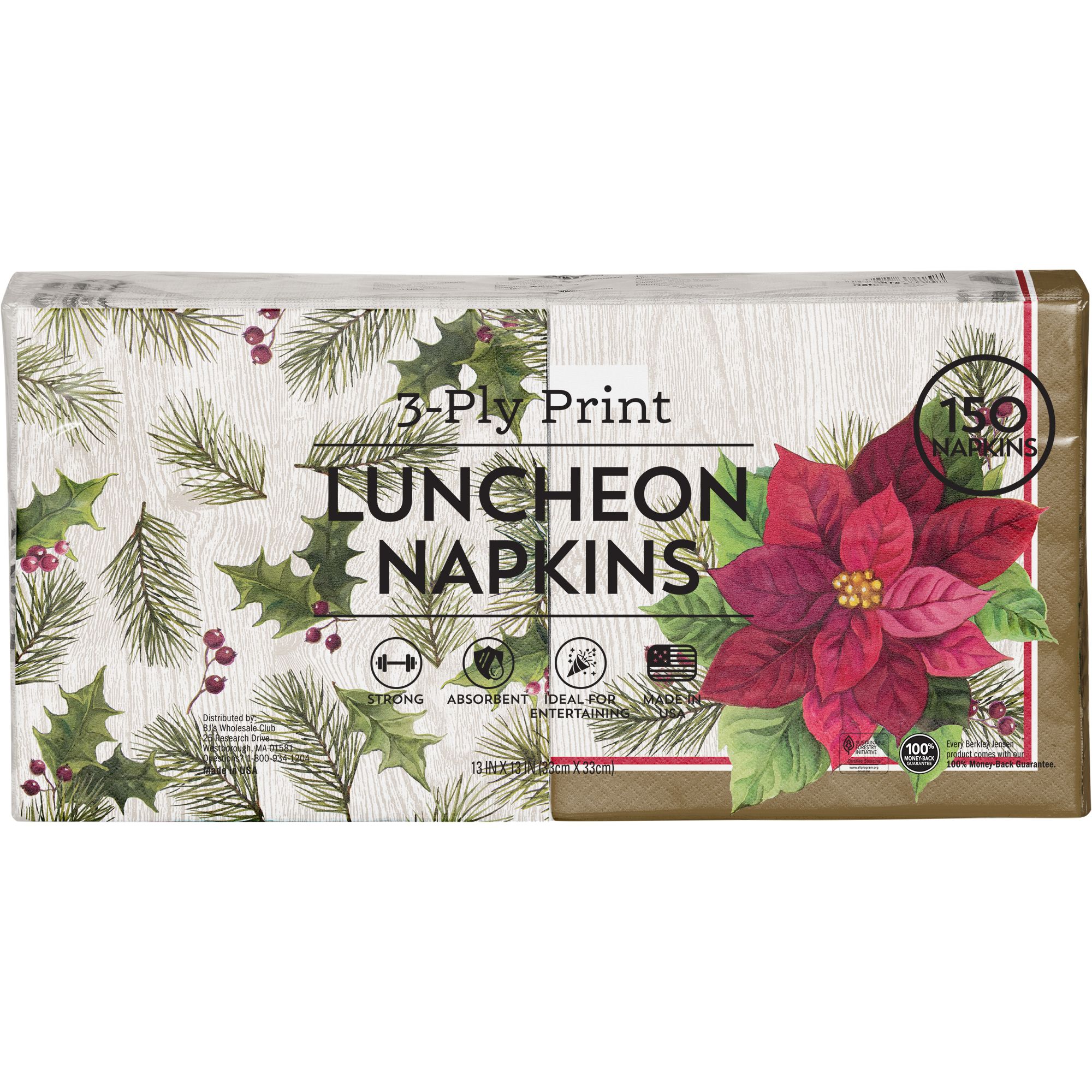 Set the table with elegance with our BJ's exclusive Poinsettia Hearth 3 ply Lunch Napkins. Measuring 13" x 13" when unfolded, these strong and absorbent 3 ply Lunch Napkins are for easy serving and fast clean up. This beautiful design is perfect for any Holiday gathering. Sold in packs of 150. Pair this Lunch Napkin with coordinating 10.25" plates, 7" dessert plates, 20 oz paper bowls or 10" x 12" oval platters.