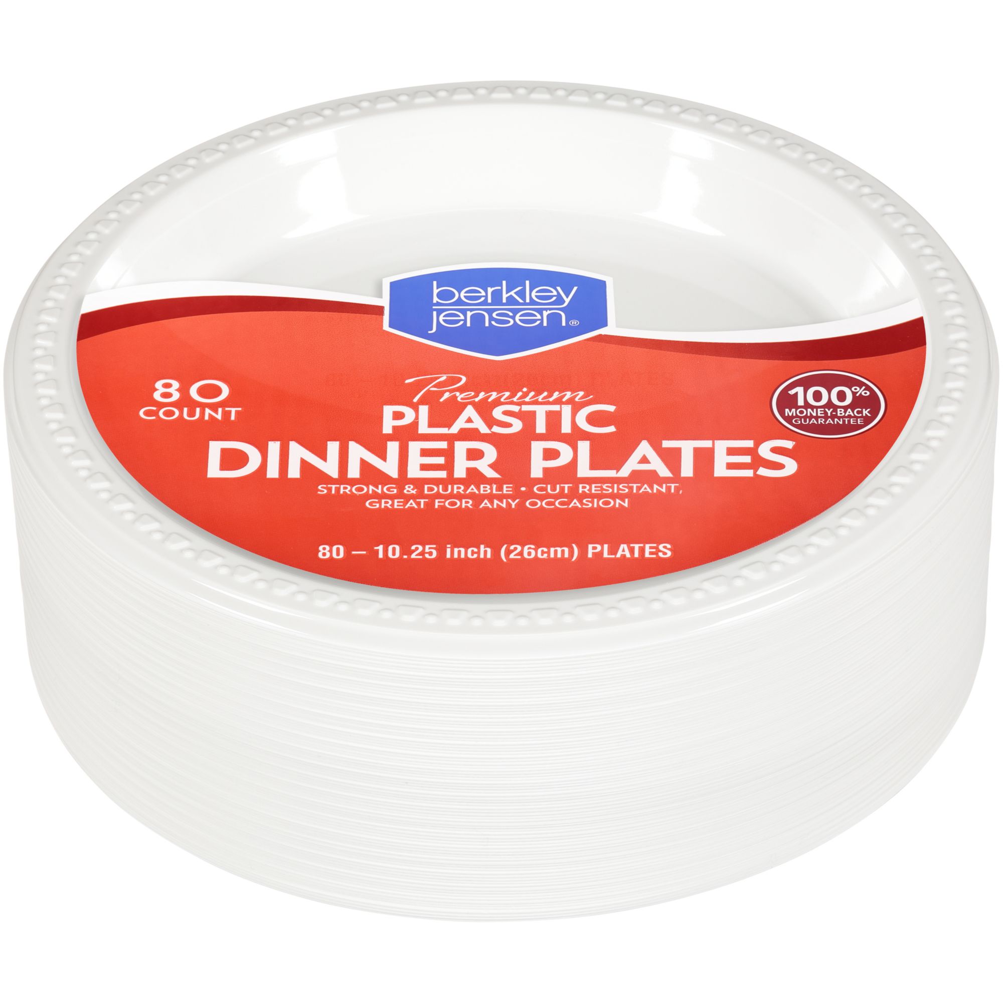 In a 80-count pack, these Berkley Jensen 10" White Plastic Dinner Plates will be perfect for any occasion, whether it's a casual dinner at home with the family or a large party. These durable plastic plates are leak proof and cut resistant, making them a great choice for any meal. Their classic white color will match any table setting and their sturdy design will hold up to even the heaviest of foods.