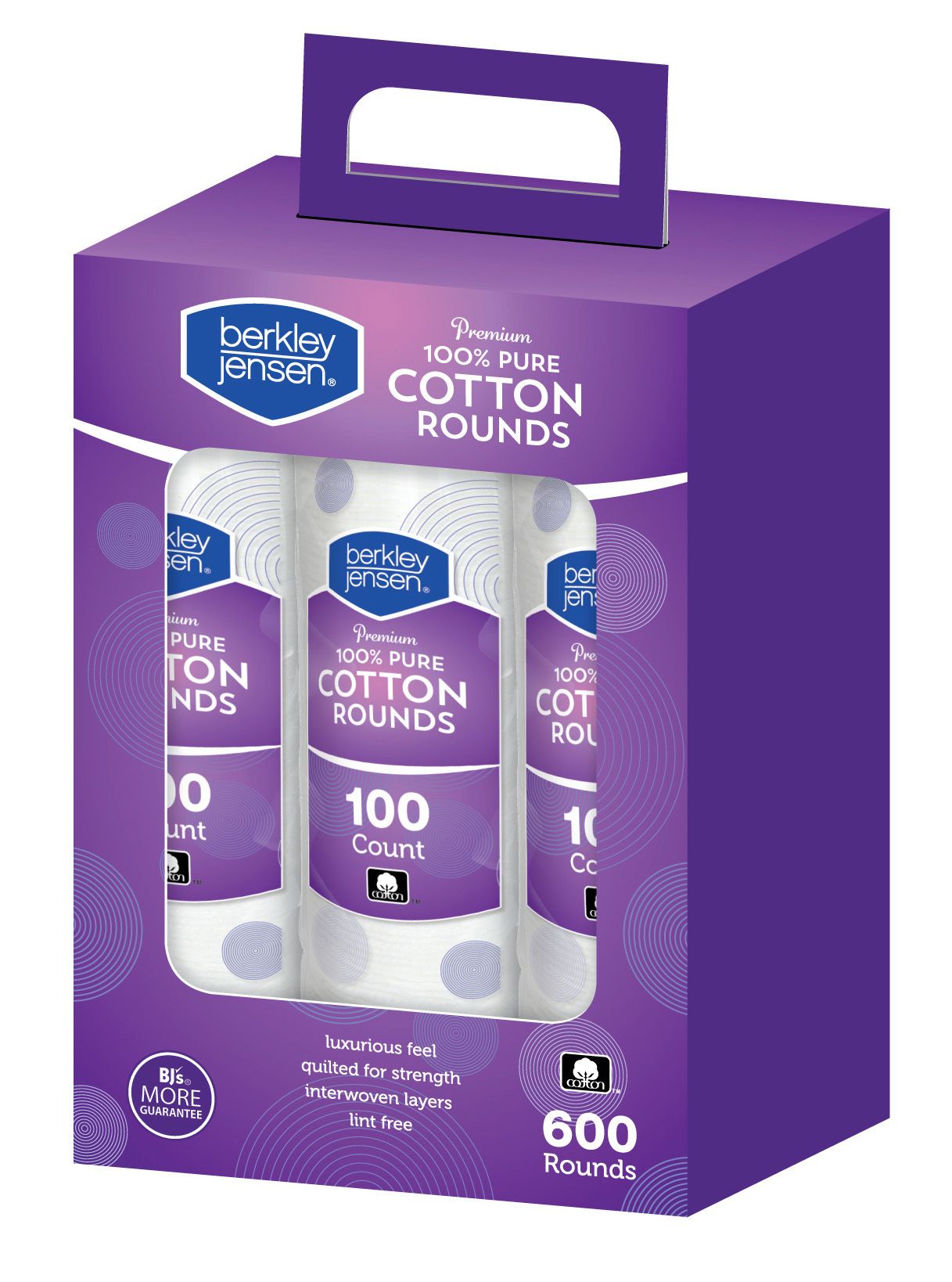 Be kind to your skin with Berkley Jensen's 100% pure cotton rounds. Our premium cotton rounds are proudly made in the USA from layers of 100% all-natural cotton. This single pad with two textures is a beauty and skincare staple. Starting with an embossed layer of cotton that is quilted for strength, it also helps to reduce linting. A plush cotton core provides softness, absorbency, and thickness. A smooth layer of spunlace delivers added strength creating an ideal cotton round for cleansing and removal of cosmetics and nail polish. You can expect premium quality with our patented stitched edge design that binds all cotton layers together to ensure a durable, lint-free pad that will not separate during use. Soft enough to remove face or eye makeup, strong enough to apply toners and lotions, or take off nail polish, this is a beauty and skincare must have!