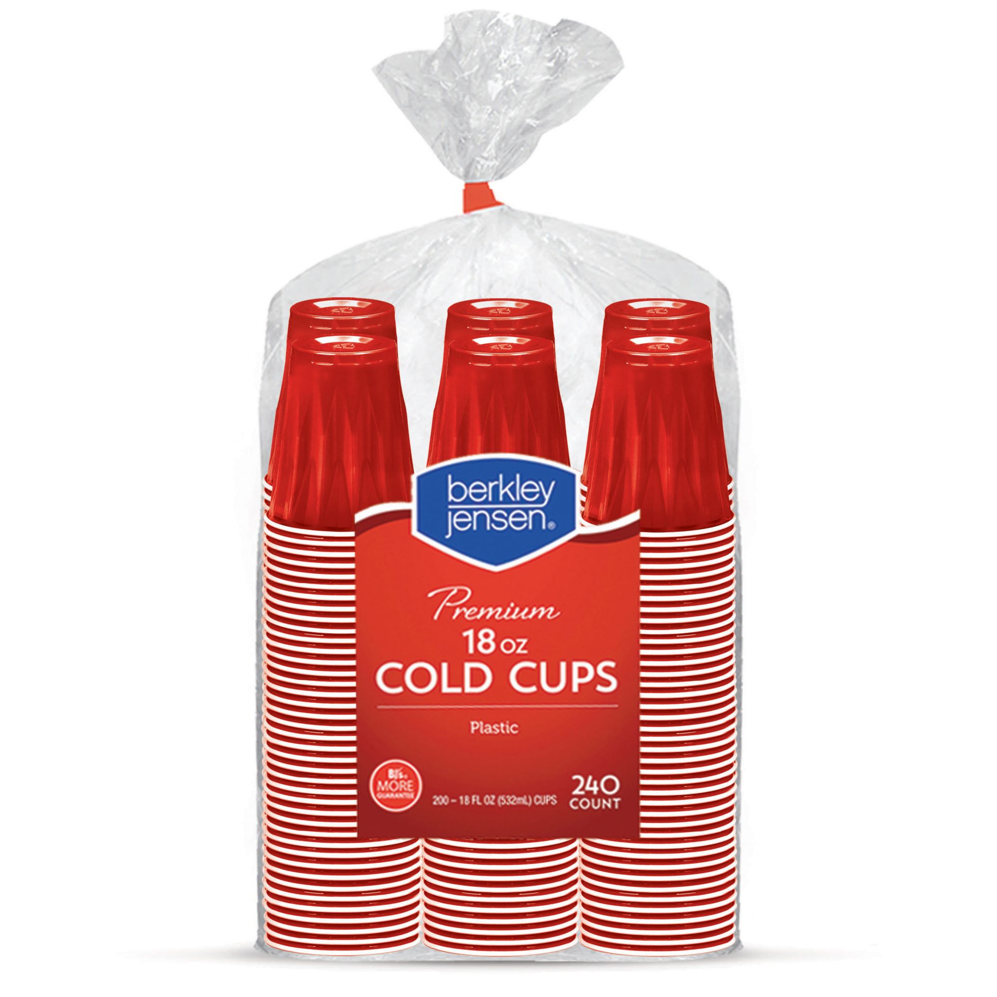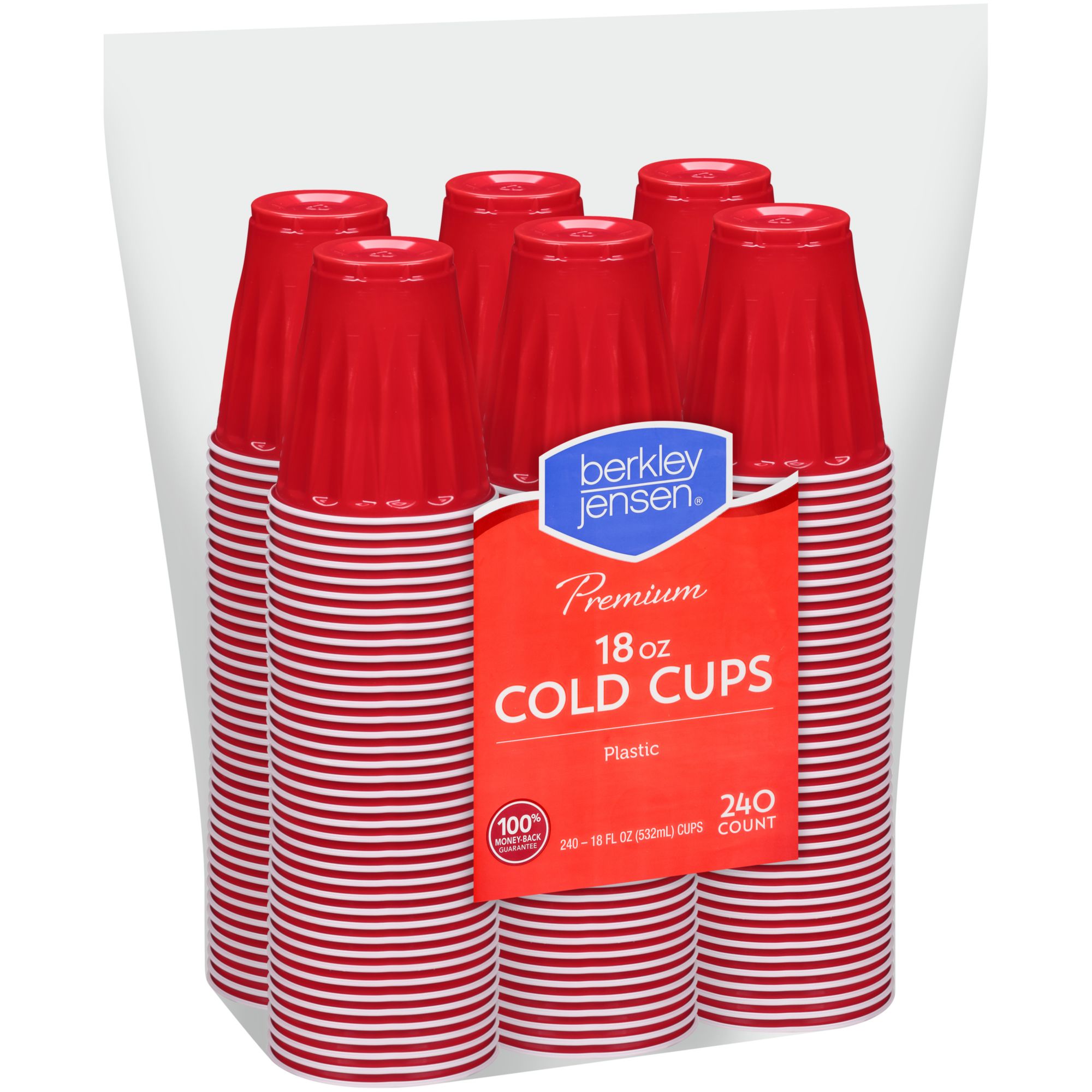 Thanks to a disposable design, the Berkley Jensen 18 Oz. Plastic Cups make sipping your favorite drink or serving up delicious beverages simple. Tough plastic construction delivers strength, while the bold red color offers classic appeal. Includes 240 red plastic Berkley Jensen cups.