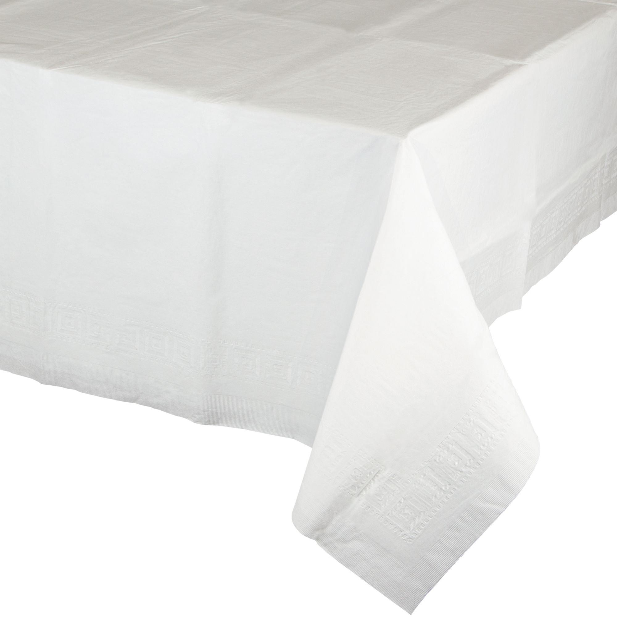Cover tables in style at any event or gathering with the White Paper Tablecloths. Durable rectangular tablecloths measure 54" x 108" and are perfectly sized for standard 6' to 8' banquet tables. The paper surface with poly liner protects tabletops from spills and scratches and can simply be disposed of for quick cleanup. The white coordinates perfectly with a variety of party ensembles for baby showers, bridal showers, birthdays, everyday entertaining, and more. The white tablecloths are packaged in a quantity of six disposable tablecloths.