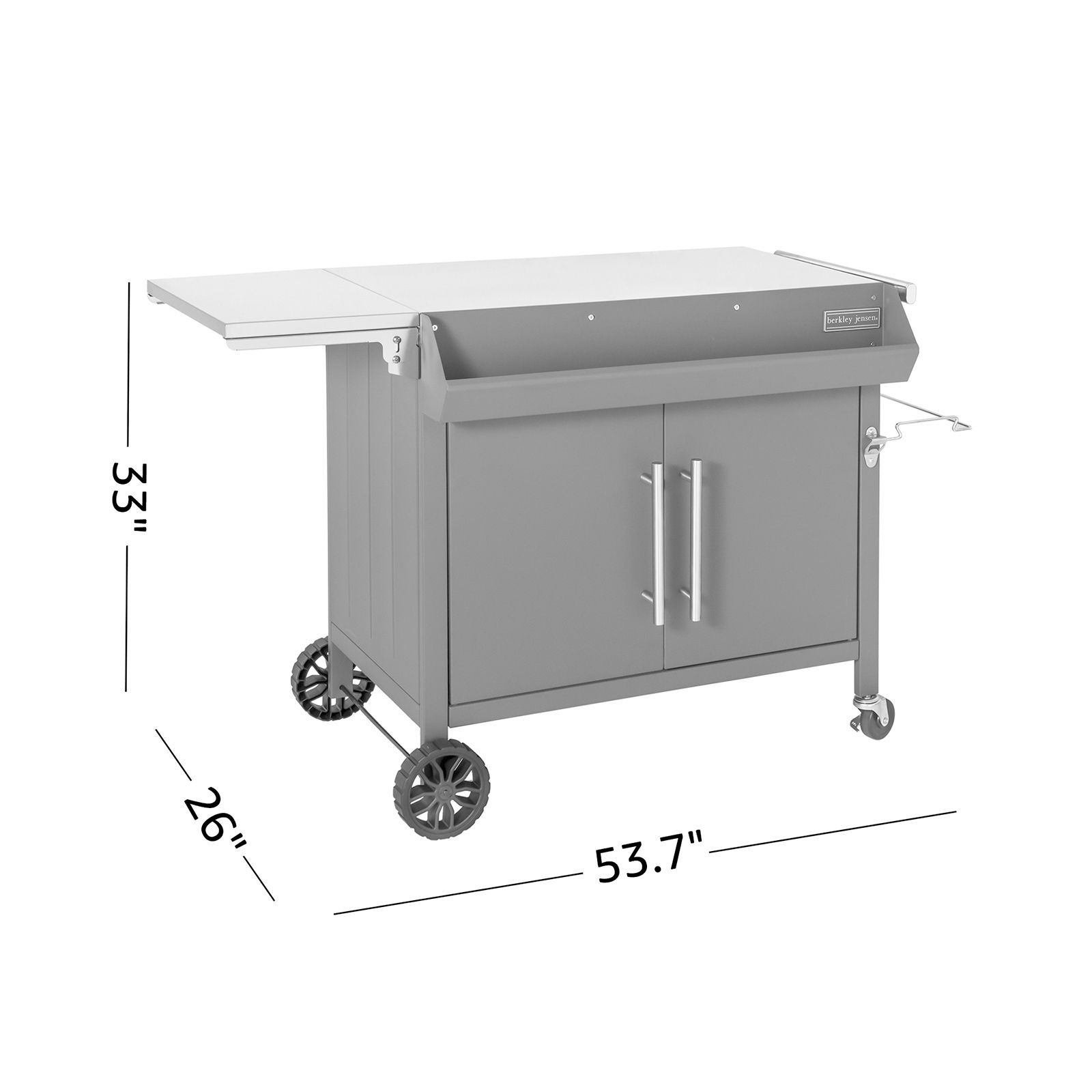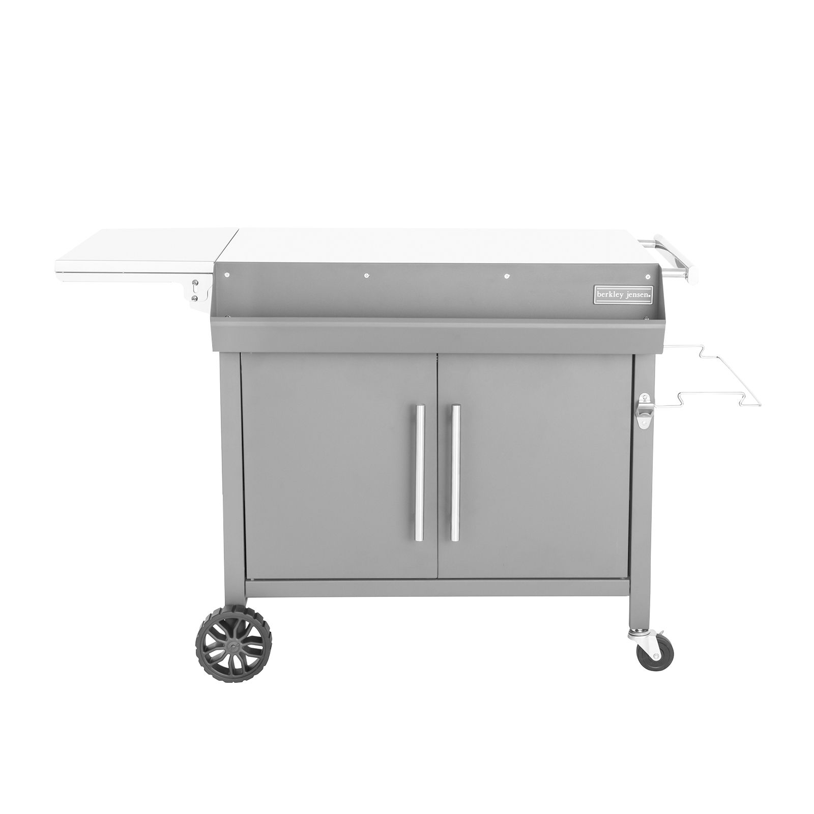 Enjoy the benefits of mobility and accessibility from Berkley Jensen Movable Dining Prep Table, a handy and versatile compliment to your backyard grilling, BBQ, parties, events, and other fun activities. This durable cart is constructed in accordance with rigidity and will not easy to fracture and rust under proper maintenance. The stainless-steel tabletop measures 658 sq. in., with an extra extended side table of 232 sq. in., more than enough for daily family needs. The cabinet and double-layer shelves offer ample storage. This prep table is perfect to use with portable grills or griddles. Easily transfer the work table around your backyard or patio by using wheels and a guiding handle.