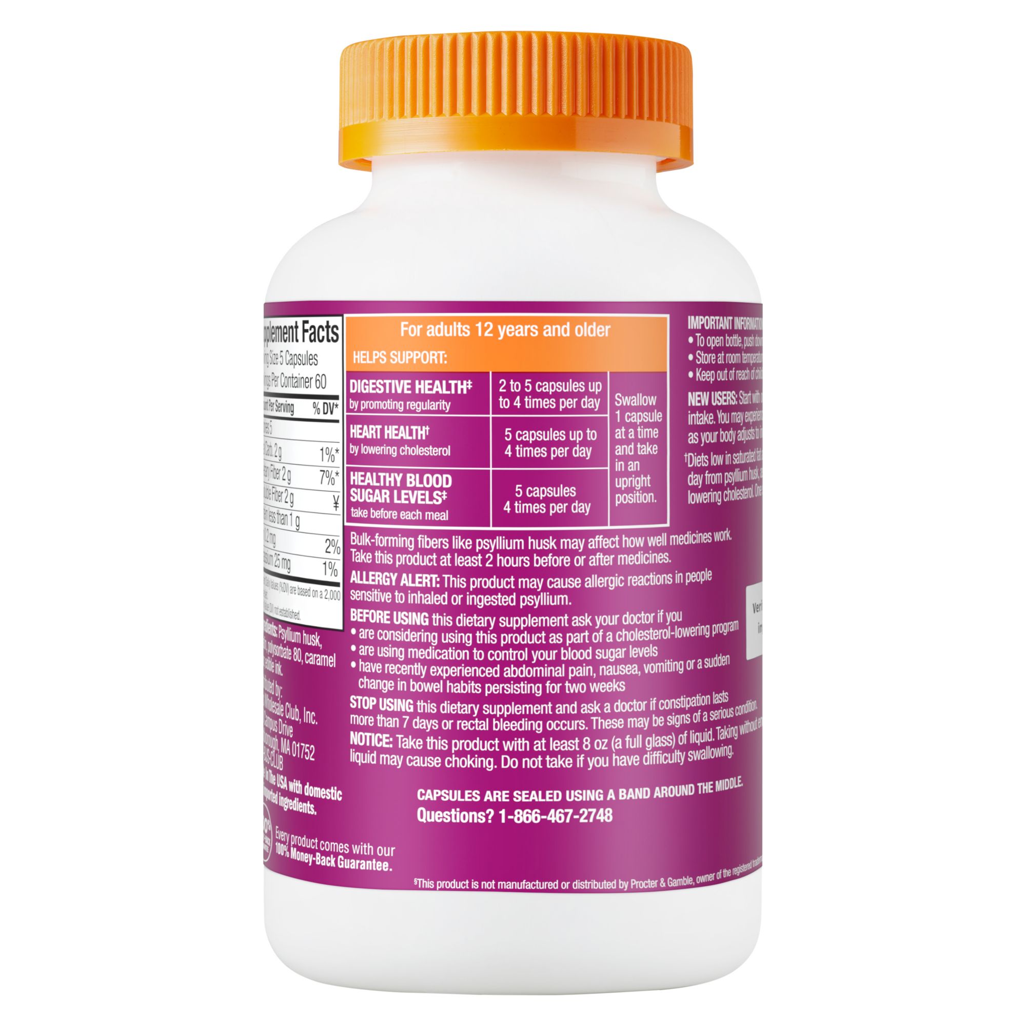 Berkley Jensen fiber capsules compare to the fiber content in Metamucil Capsules. This product is not manufactured or distributed by Procter & Gamble, owner of the registered trademark Metamucil Capsules. Diets low in saturated fat and cholesterol that include 7g of soluble fiber per day from psyllium husk, as in this product, may reduce the risk of heart disease by lowering cholesterol. One serving of this product has 2g of this soluble fiber. May support regularity, helps maintain blood sugar levels as part of your diet, helps lower cholesterol to promote heart health, and promotes digestive health.