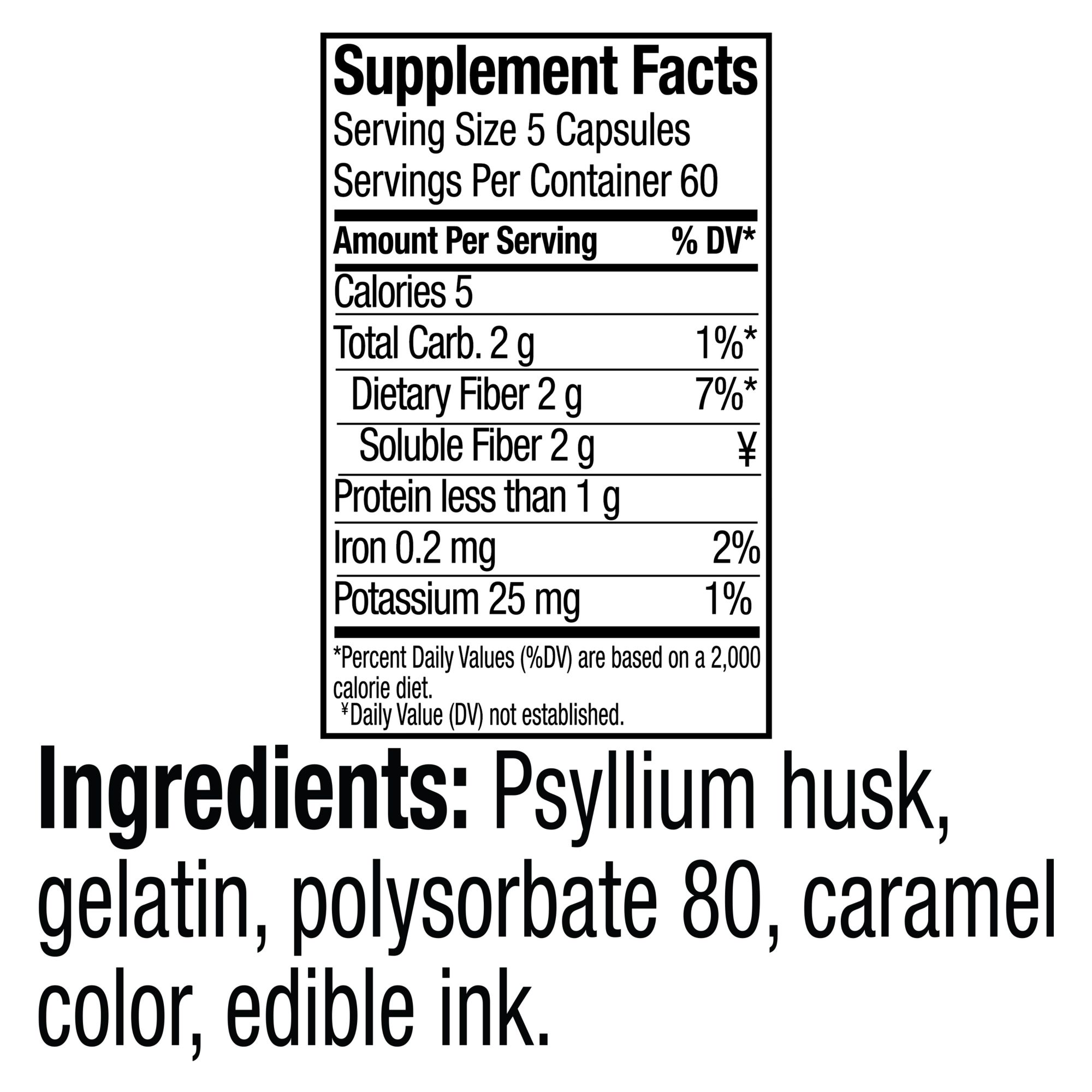 Ingredients: Psyllium Husk, Gelatin, Polysorbate 80, Caramel Color, Edible Ink