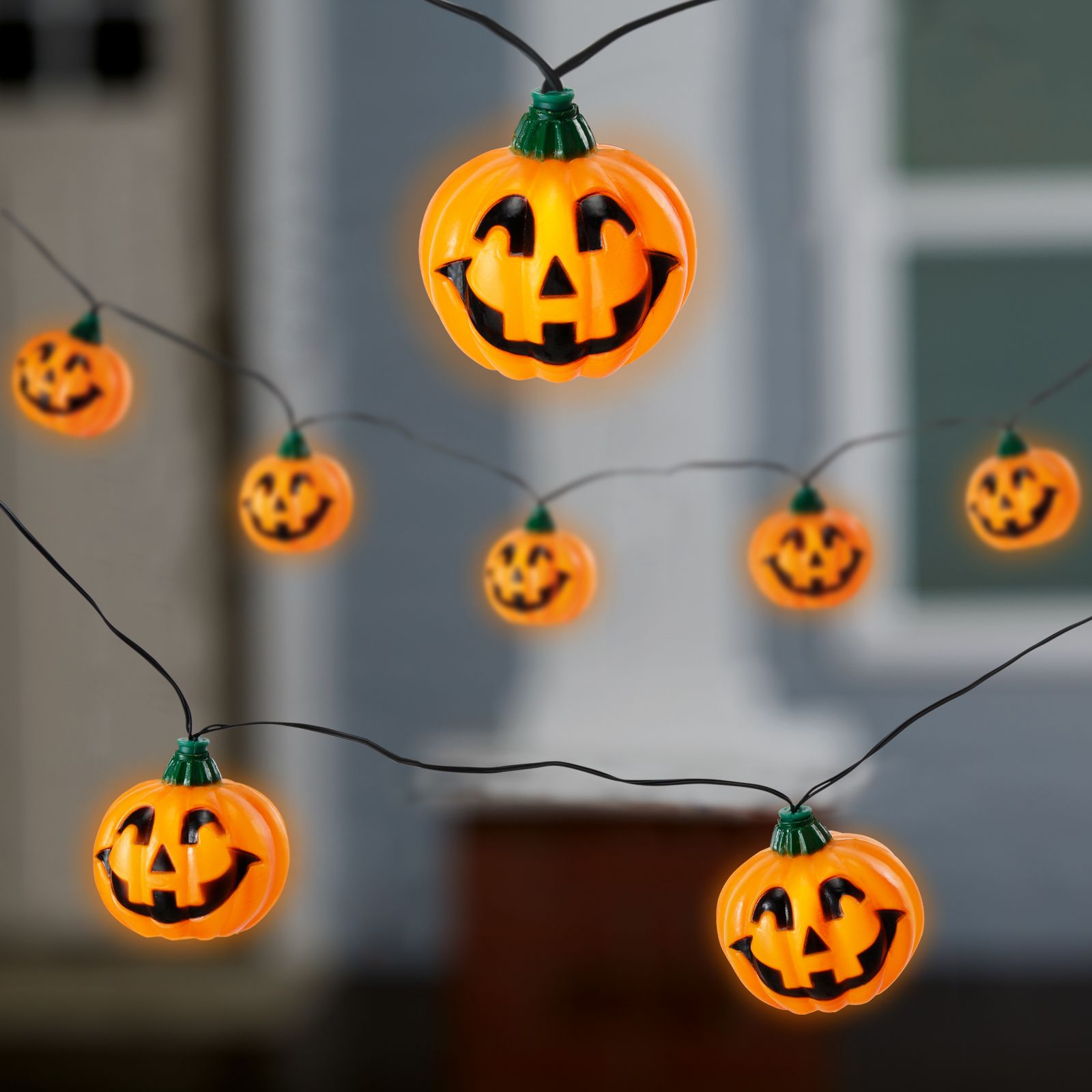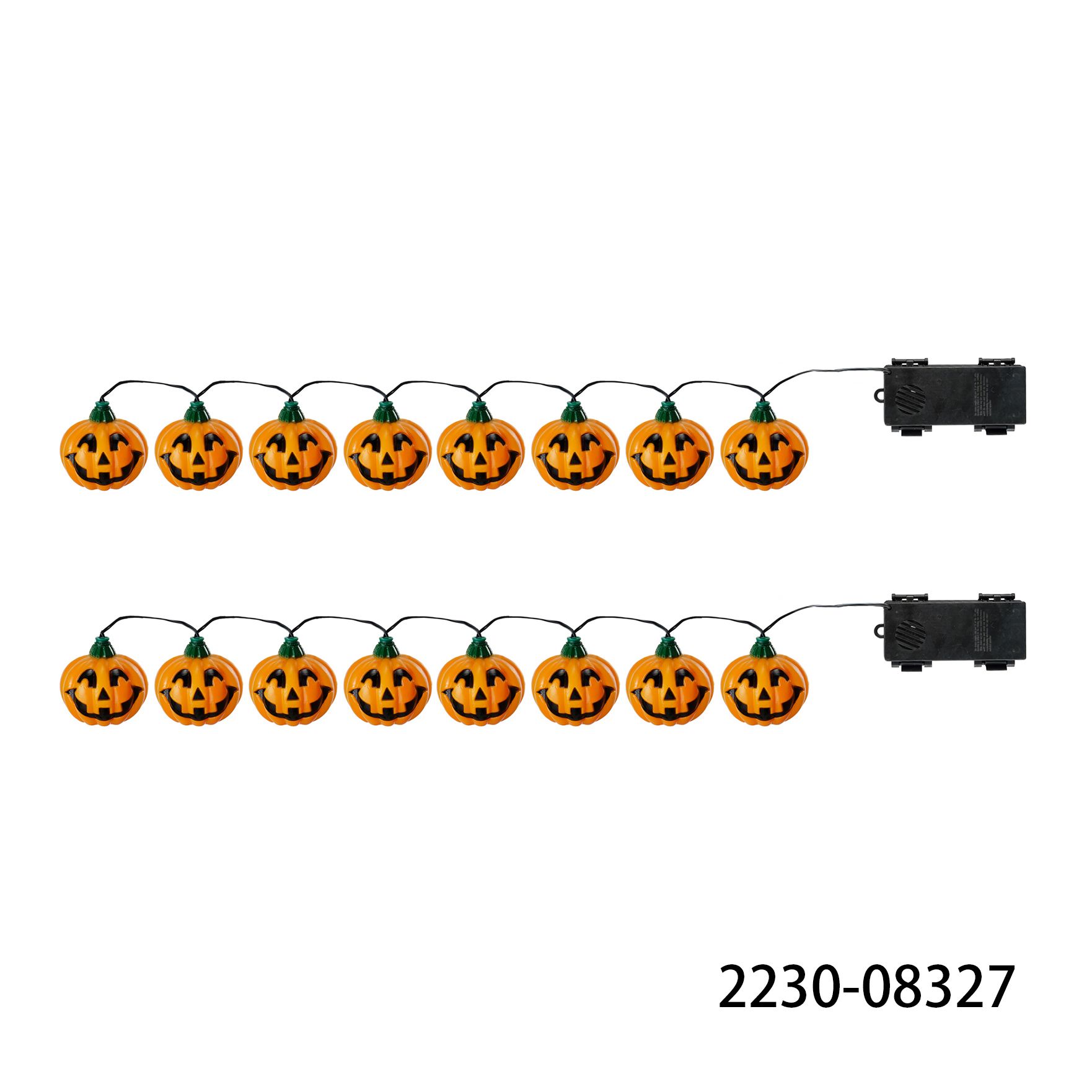 LED illuminated string lights 6 hours on/18 hours off timer Halloween sound effect Contains two strands, 88.58" long each Indoor use only Requires six AA batteries, included Includes 2 pk. of Halloween light sets pumpkin icon