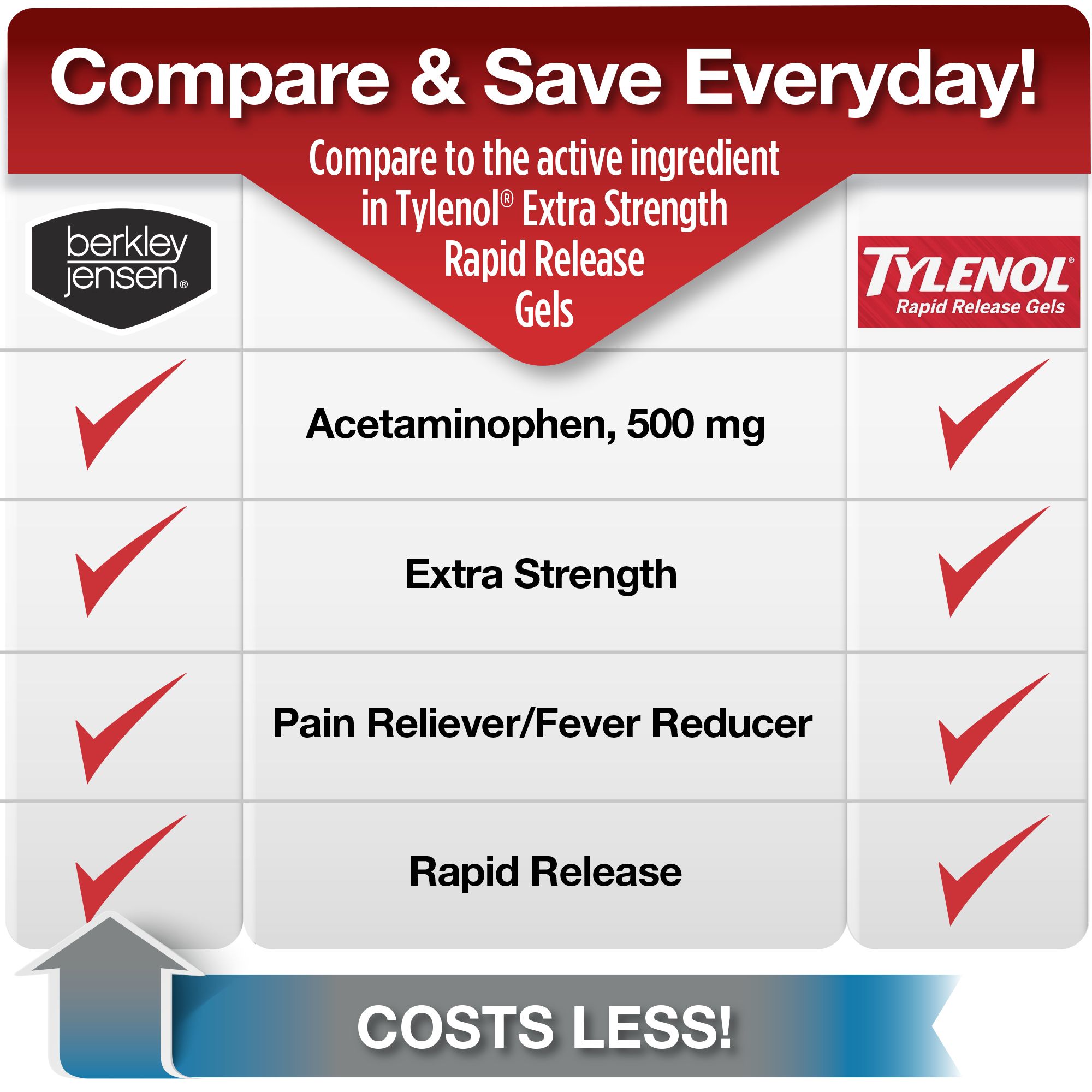 Berkley Jensen Rapid Release Extra Strength Acetaminophen Caplets, 400 ct. is a fast-acting pain reliever and fever reducer for adults. With 500mg of acetaminophen per caplet, this product provides rapid relief from aches and pains, allowing you to get back to your day.
