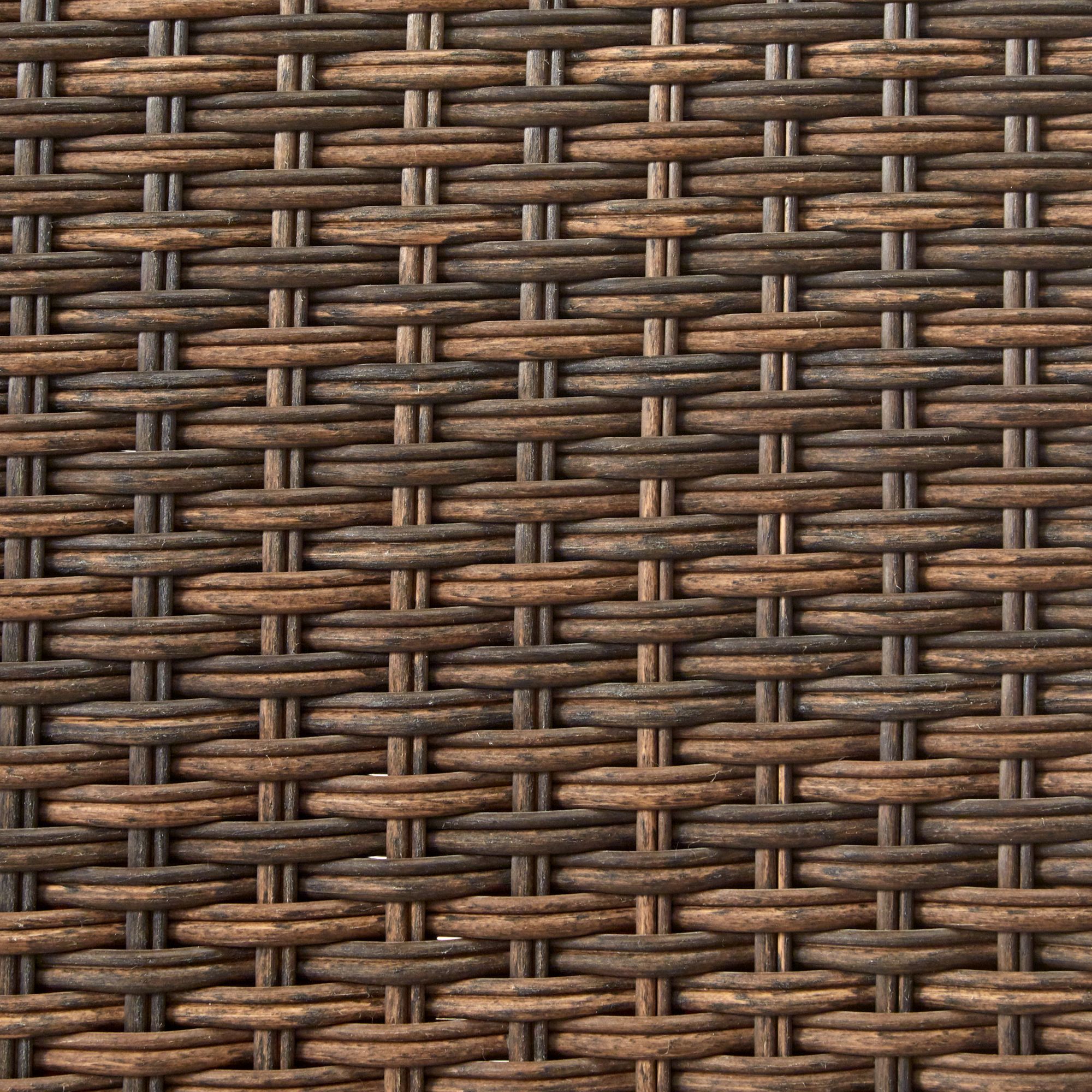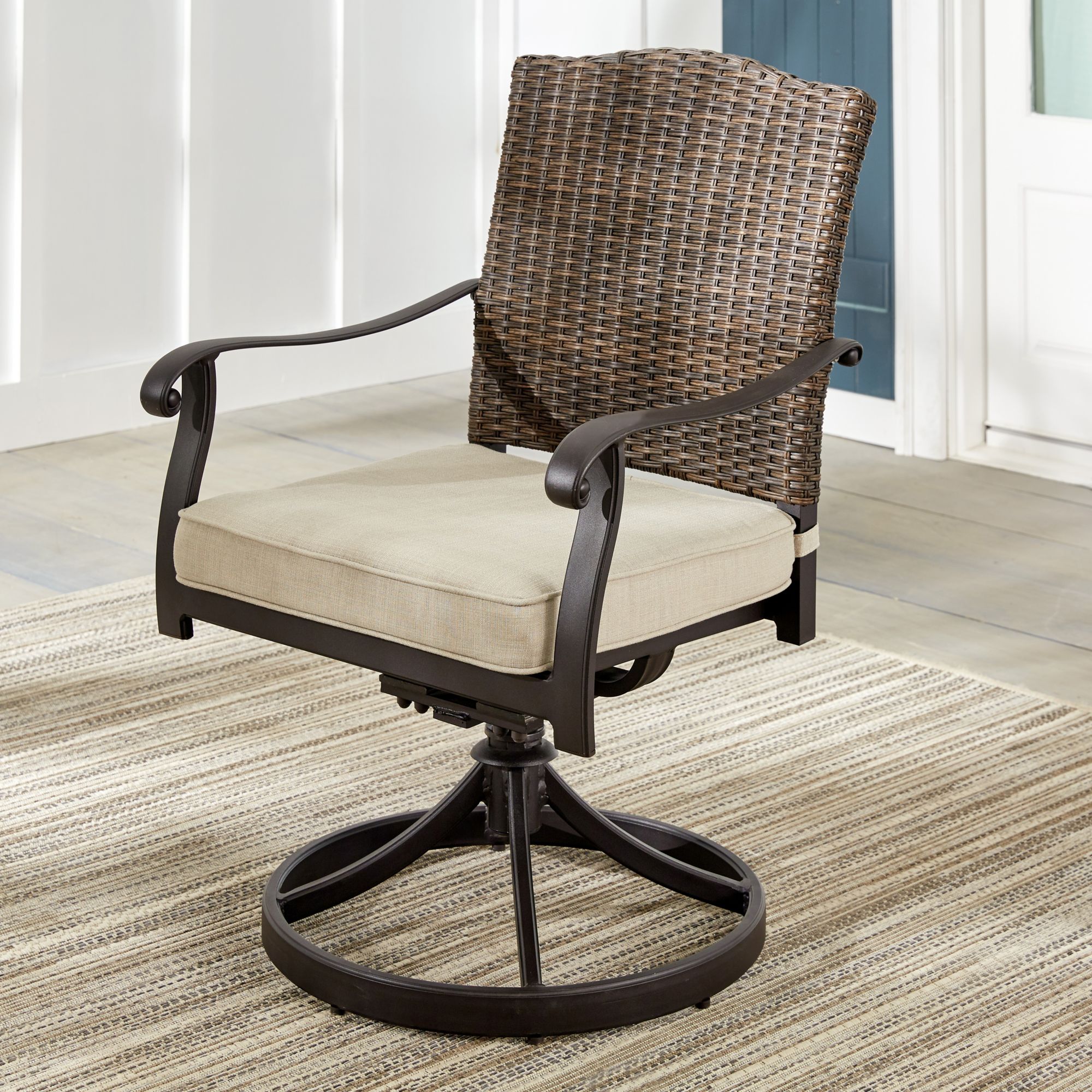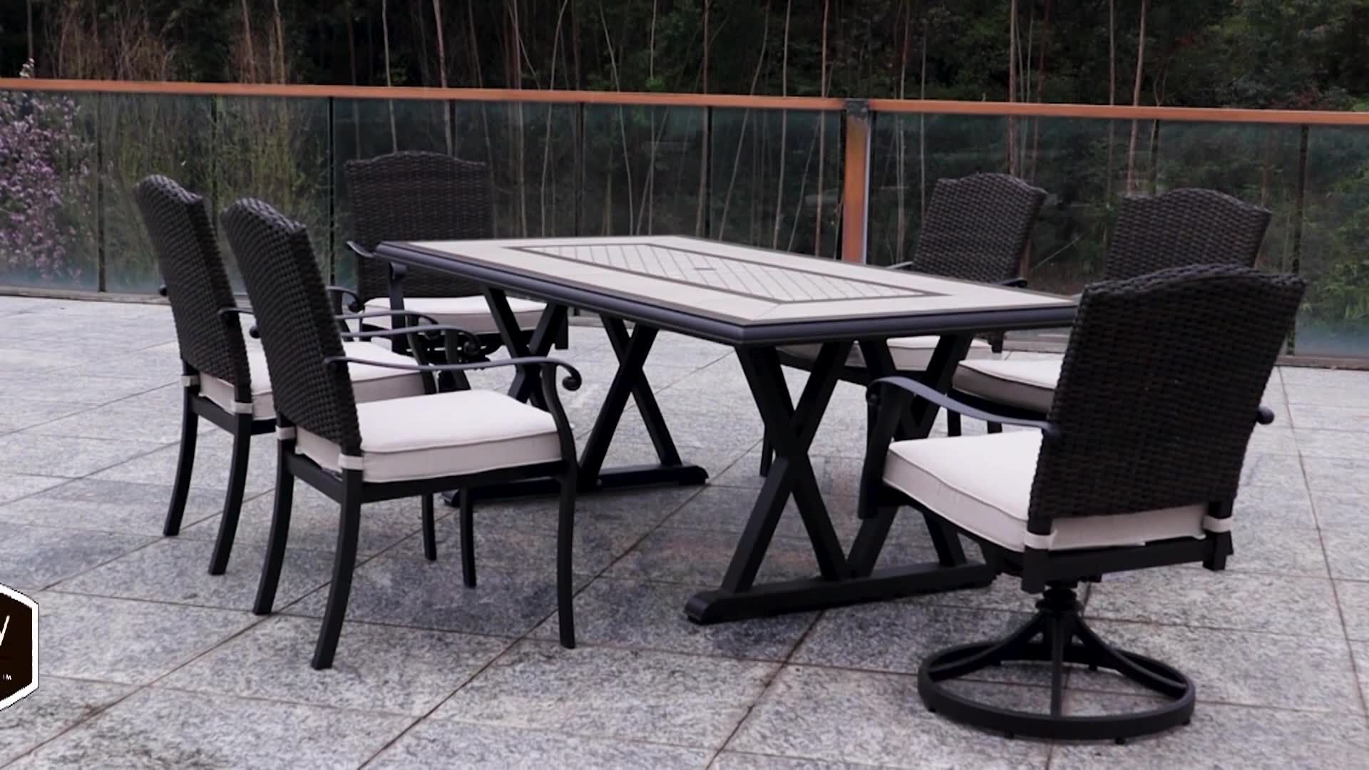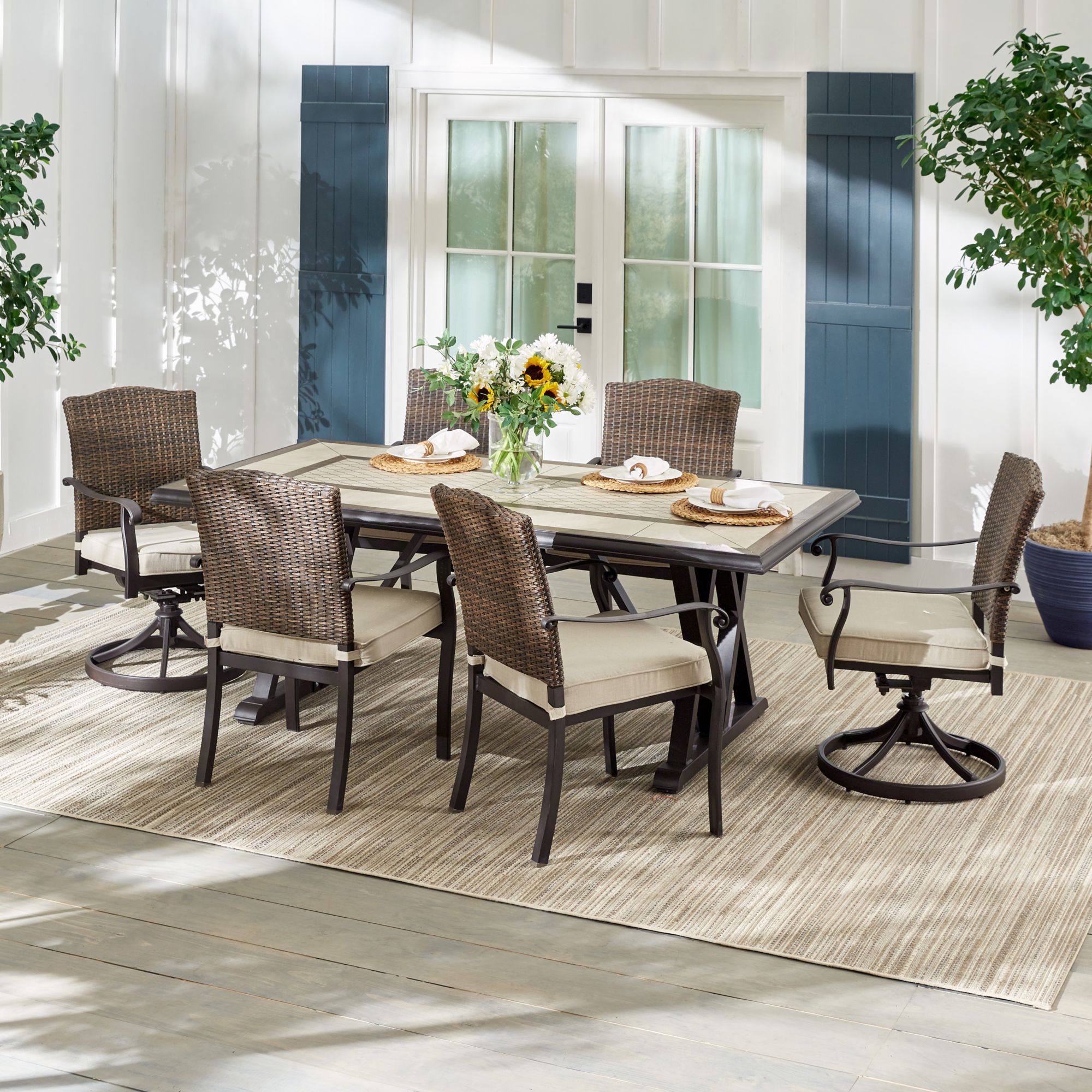 Crafted with all-weather wicker and decorative "crown-styled" chairs, the Berkley Jensen Rockport 7-Pc. Aluminum Wicker Tile Top Dining Set creates a relaxing and comfortable outdoor oasis perfect for dining and entertaining. This set includes two cushioned swivel rocking wicker chairs, four cushioned stationary chairs, and a rectangular dining table. Experienced artisans hand weave the mixed color all-weather wicker chairs on a rust-free brown powder-coated aluminum frame which is easy to clean and maintain.