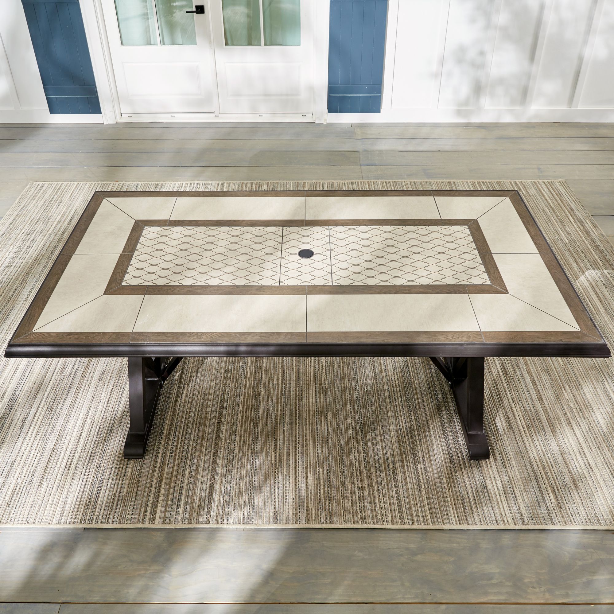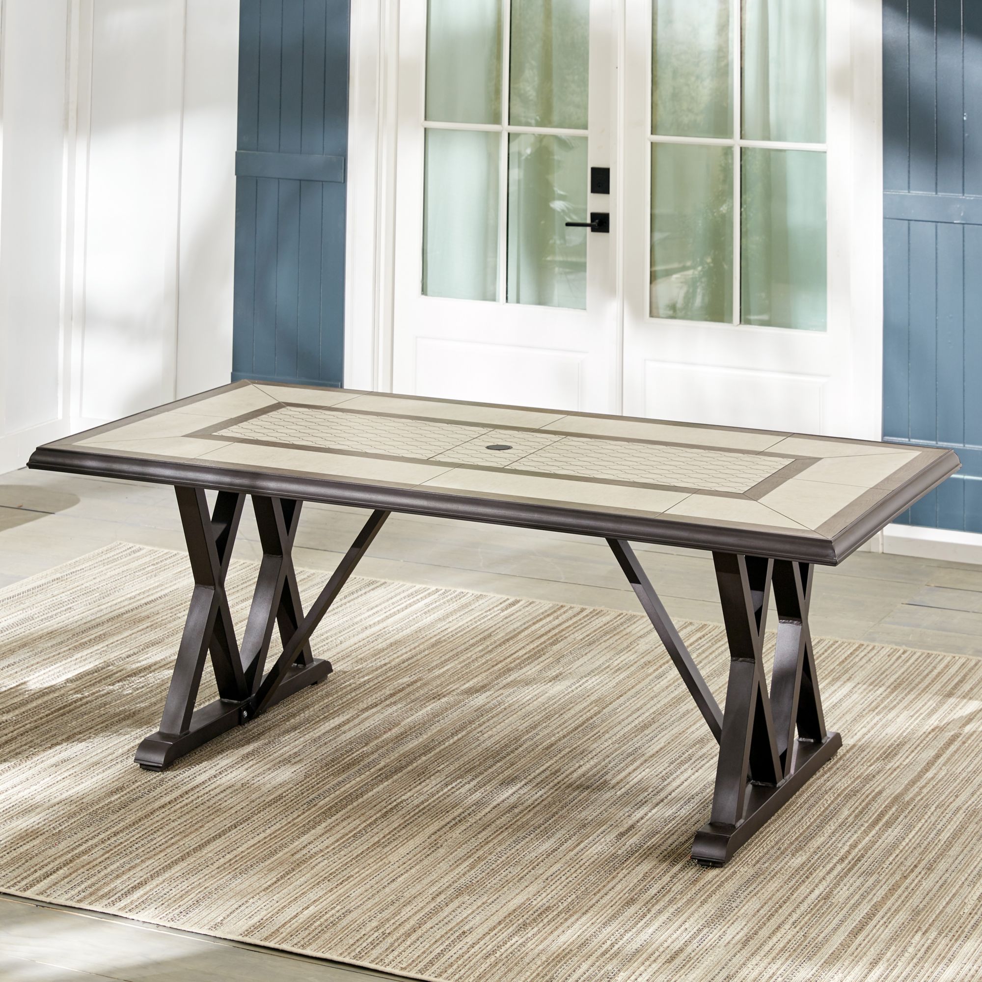 This set also includes UV-protected premium acrylic cushions which bring both style and comfort to your backyard. The 81.5"L x 41.5"W large rectangular dining table is accented with a beautiful heat and scratch-resistant porcelain tile tabletop and is supported by a stylish double X table stand. This dining table also comes with a 2" diameter umbrella hole that will work with most outdoor umbrellas in the market. The rust-free aluminum frame and cushion fabric have a 5-year limited warranty.