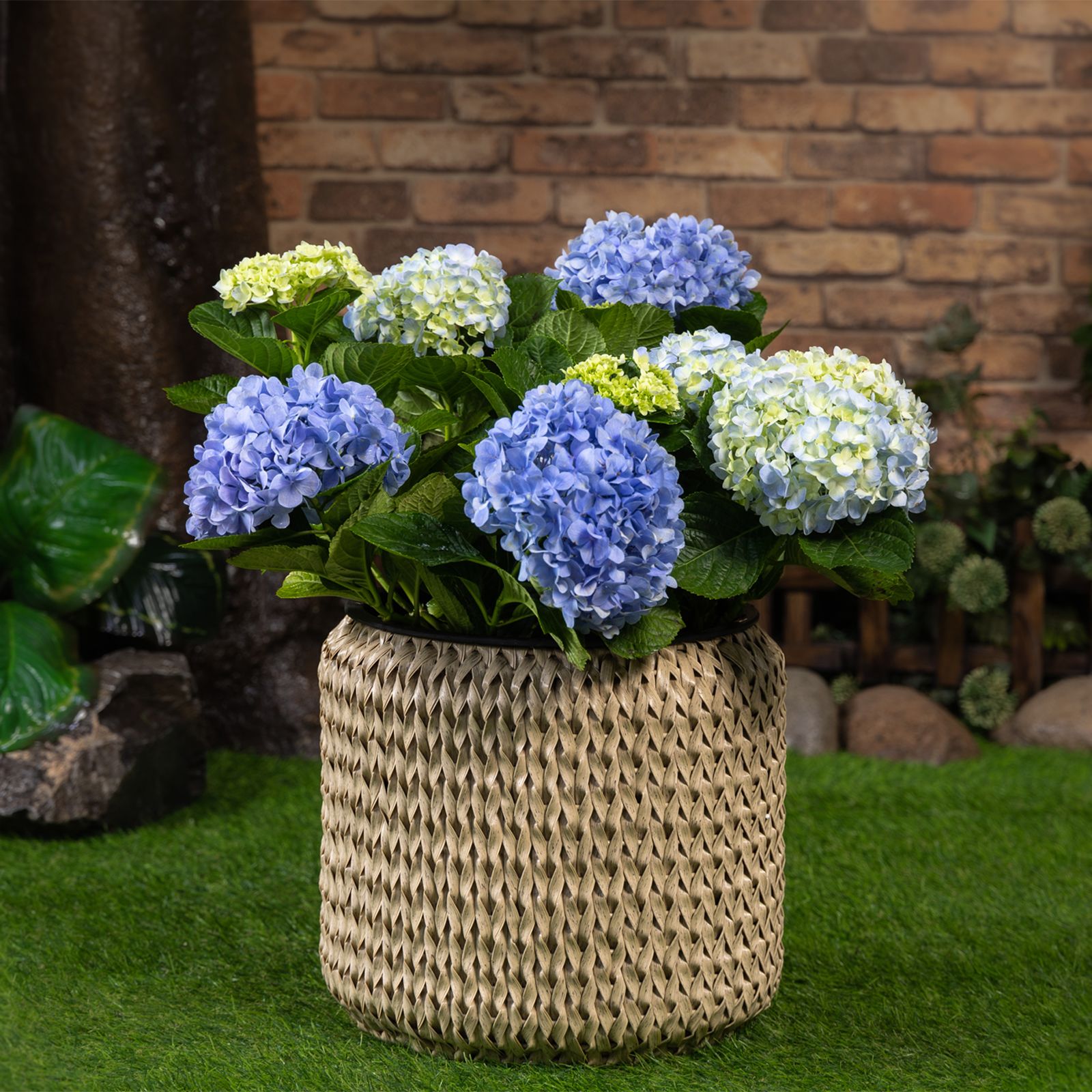 Elevate your outdoor or indoor space with this stylish and durable round wicker planter. Designed to bring a touch of modern elegance to your patio, balcony, or even living room, this planter seamlessly blends beauty and functionality. Crafted from high-quality PE wicker, the planter boasts a natural, woven texture that mimics traditional rattan but with added durability. This planter is resistant to weather, UV rays, and fading, ensuring that it maintains its appearance even when exposed to sunlight, rain, or changing temperatures. The included removable plastic insert simplifies the planting process, offering a clean and practical solution for housing your favorite plants. Its sturdy yet lightweight construction makes it easy to move from room to room inside to outside. Enjoy your favorite foliage and flower décor adding a beautiful focal point to your outdoor living space with this carefree, weather-proof, and ultra-tough planter for years to come. Perfect for both seasoned gardeners and those new to planting, this round wicker planter is a versatile and stylish addition to your plant collection. Perfect gift for gardener enthusiasts. Made of steel, plastic, and PE wicker. Made in Vietnam. For outdoor and indoor use.