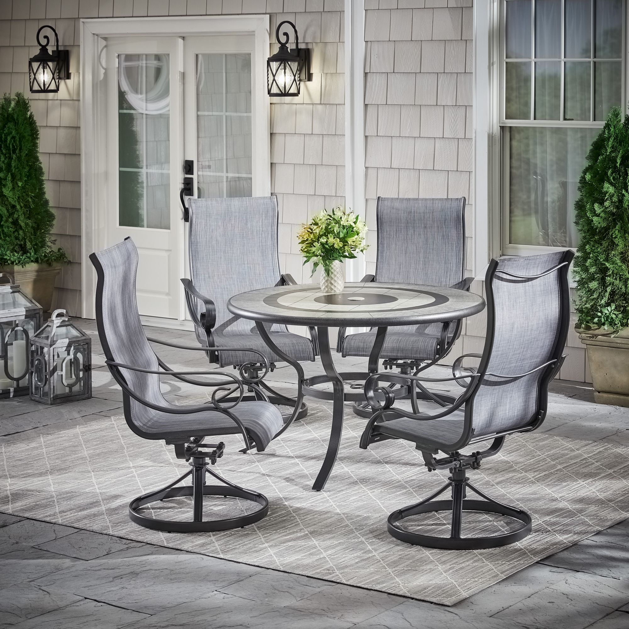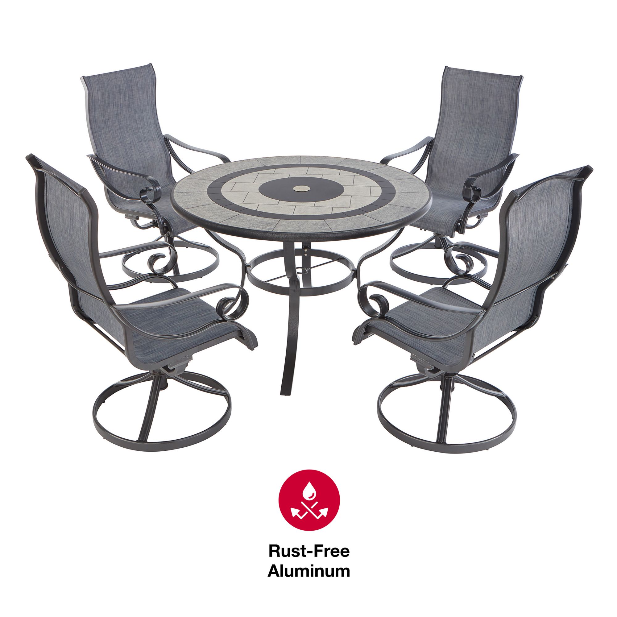 This Rowley 5 pc. aluminum sluing dining set is perfect for all your outdoor entertaining needs. Comes with four swivel dining chairs and a round dining table with an engraved faux stone top.