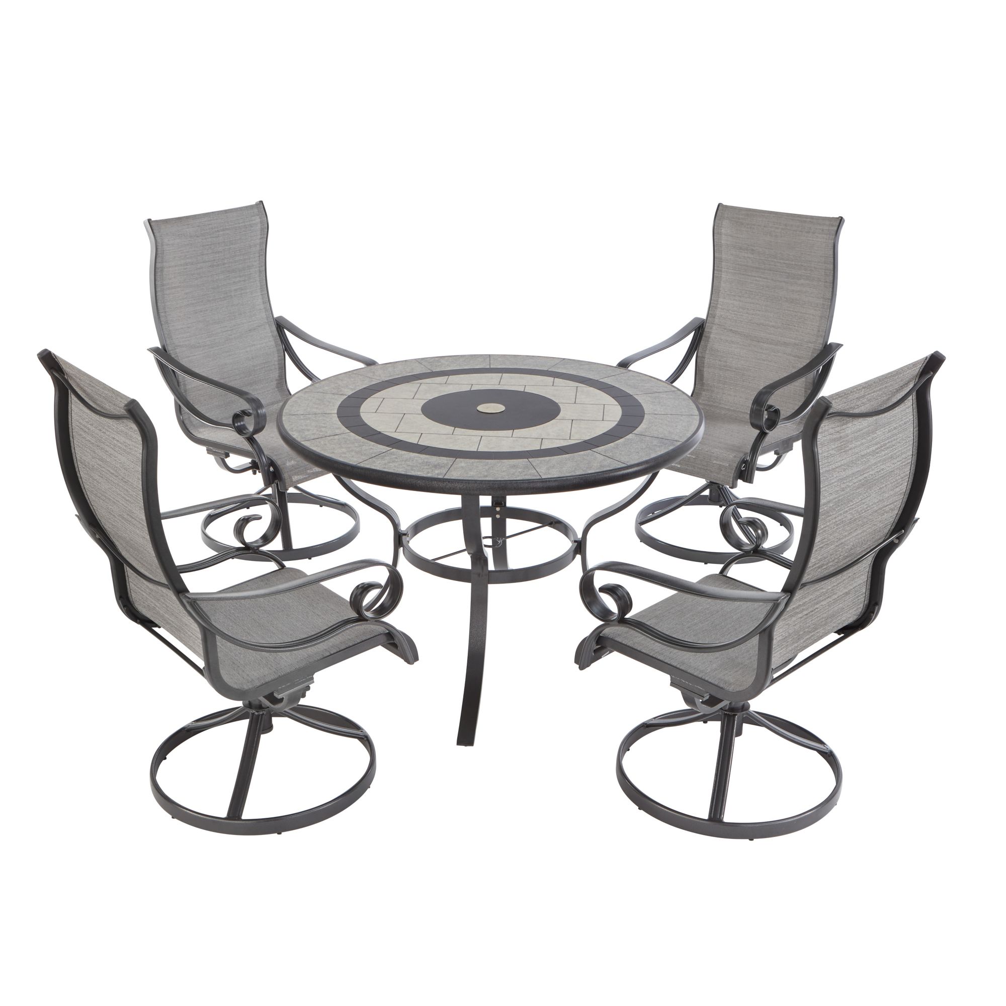 The Berkley Jensen Rowley 5-Piece Round Sling Dining Set is an all aluminum non-rust set, with all motion swivel rocking chairs. This set has a round dining table with an aluminum engraved faux stone tabletop, and a central hole for umbrella support. This set of five furniture pieces includes four dining chairs and one dining table.