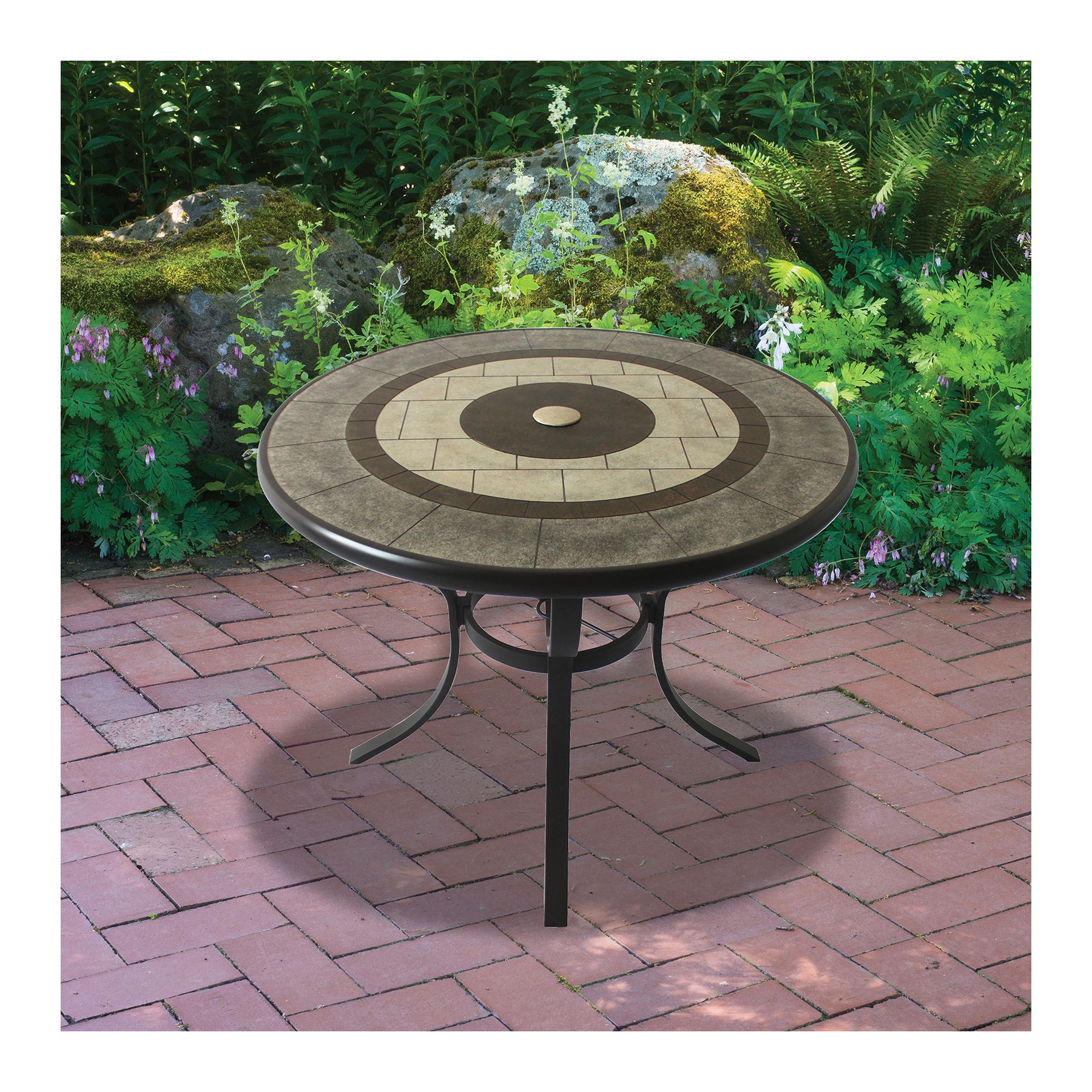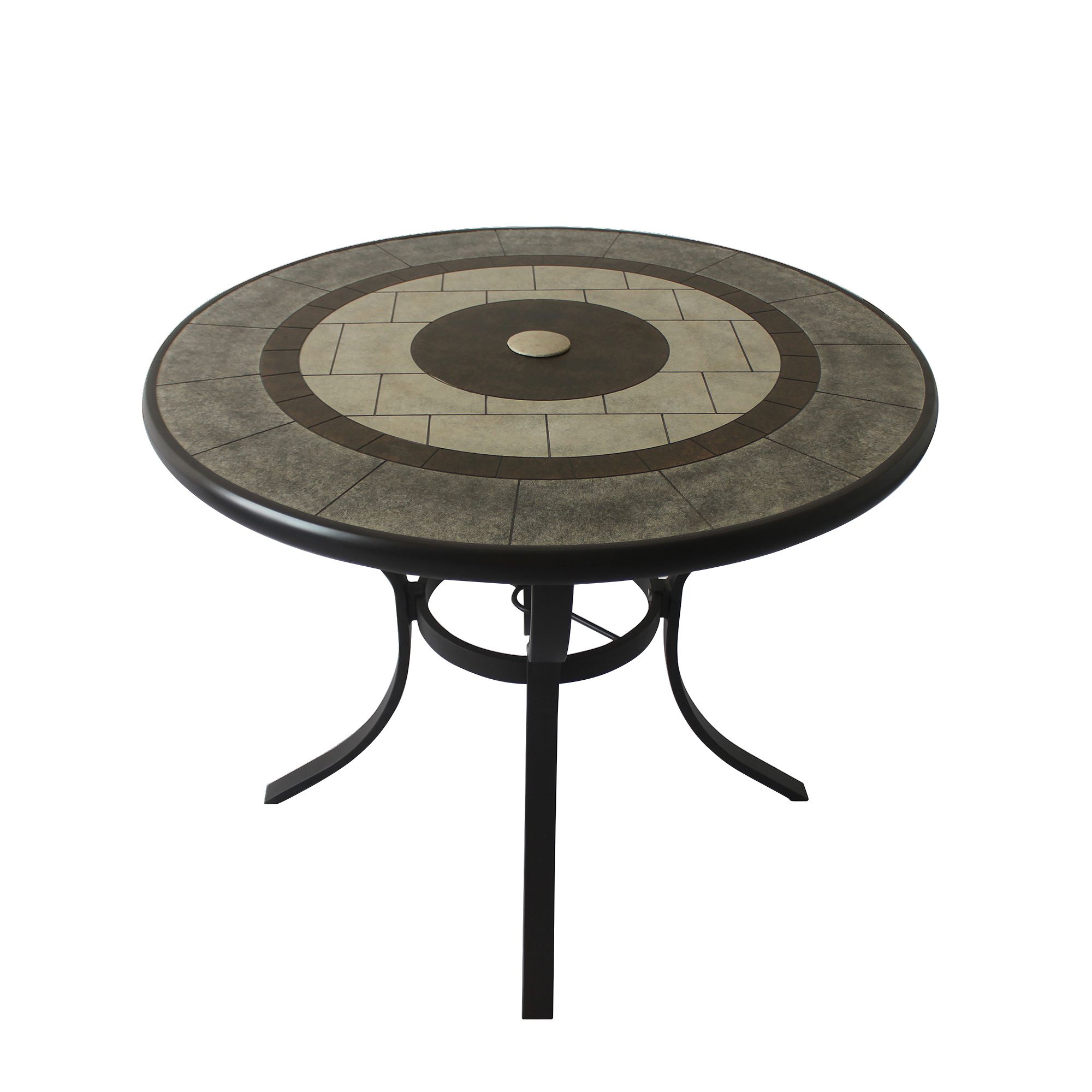 This 38" Dining Table from Berkley Jensen is made of non-rust aluminum. Available in a round shape, this table features an aluminum engraved faux stone top. A central hole allows support for an umbrella.