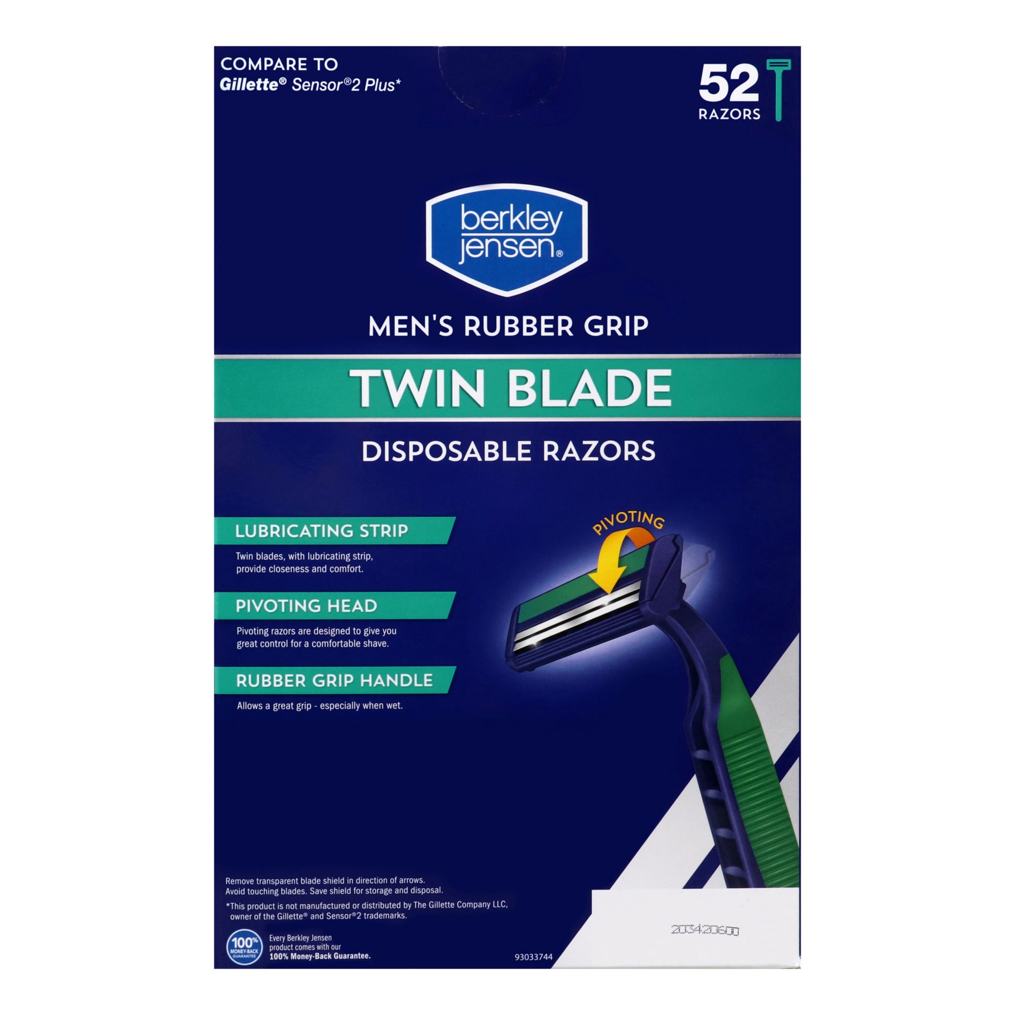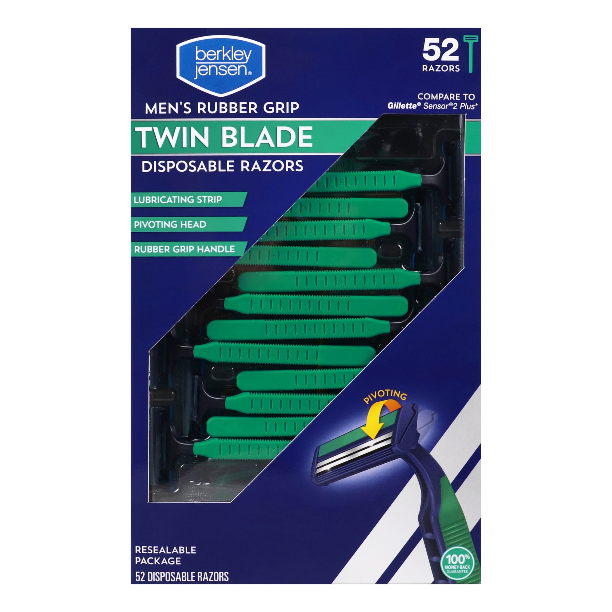 Shave with confidence with the Berkley Jensen Men’s Twin Blade Disposable Razor. The rubberized handle provides a great grip even when wet for superior shaving control. With twin blades and a lubricating strip, this razor glides over your skin, ensuring a close, comfortable shave. For added comfort, the lubricating strip contains vitamin E. Its unique flow-thru design makes it easy to keep the blades clean for a smooth shave. This pivoting razor, with longer handle length, is designed to give you great control for a clean shave. The blades are made in USA from imported steel. If you like Gillette Sensor2 Razors, we invite you to try Berkley Jensen Men’s Twin Blade Disposable Razor. Great value at a great price. As with all Berkley Jensen products we want you to be completely satisfied. These razors come with our 100% money-back guarantee so you can purchase with confidence.