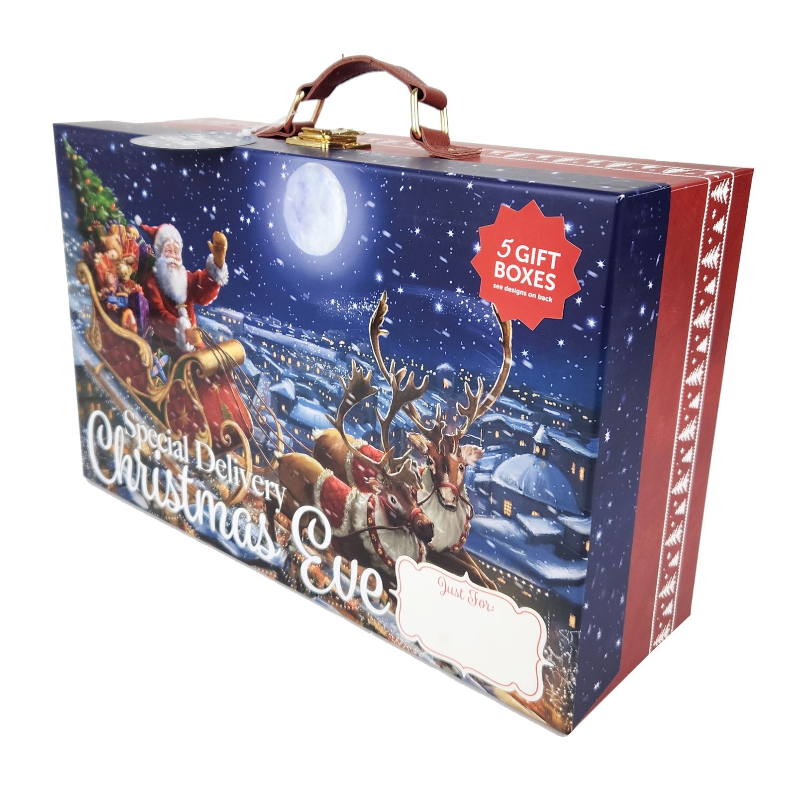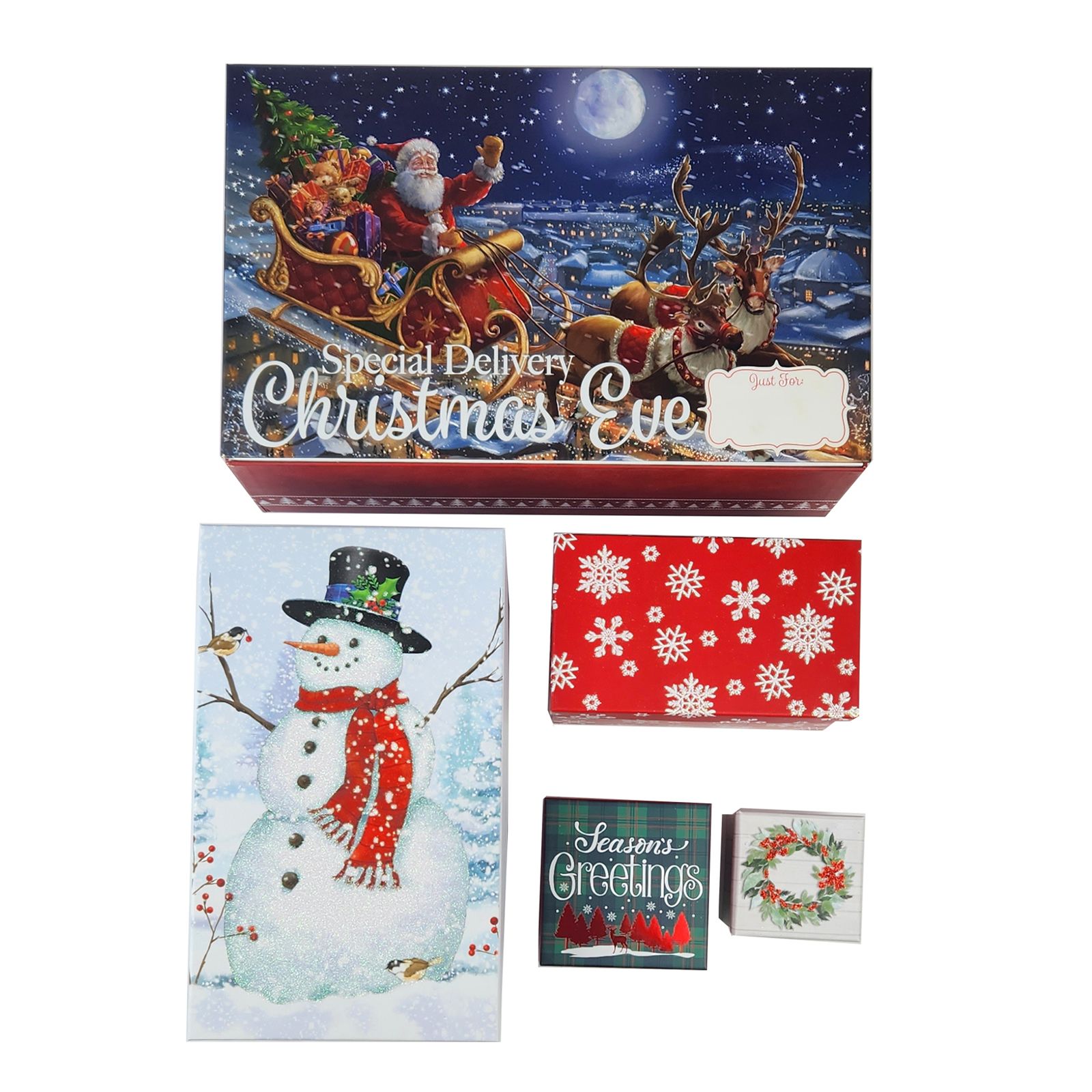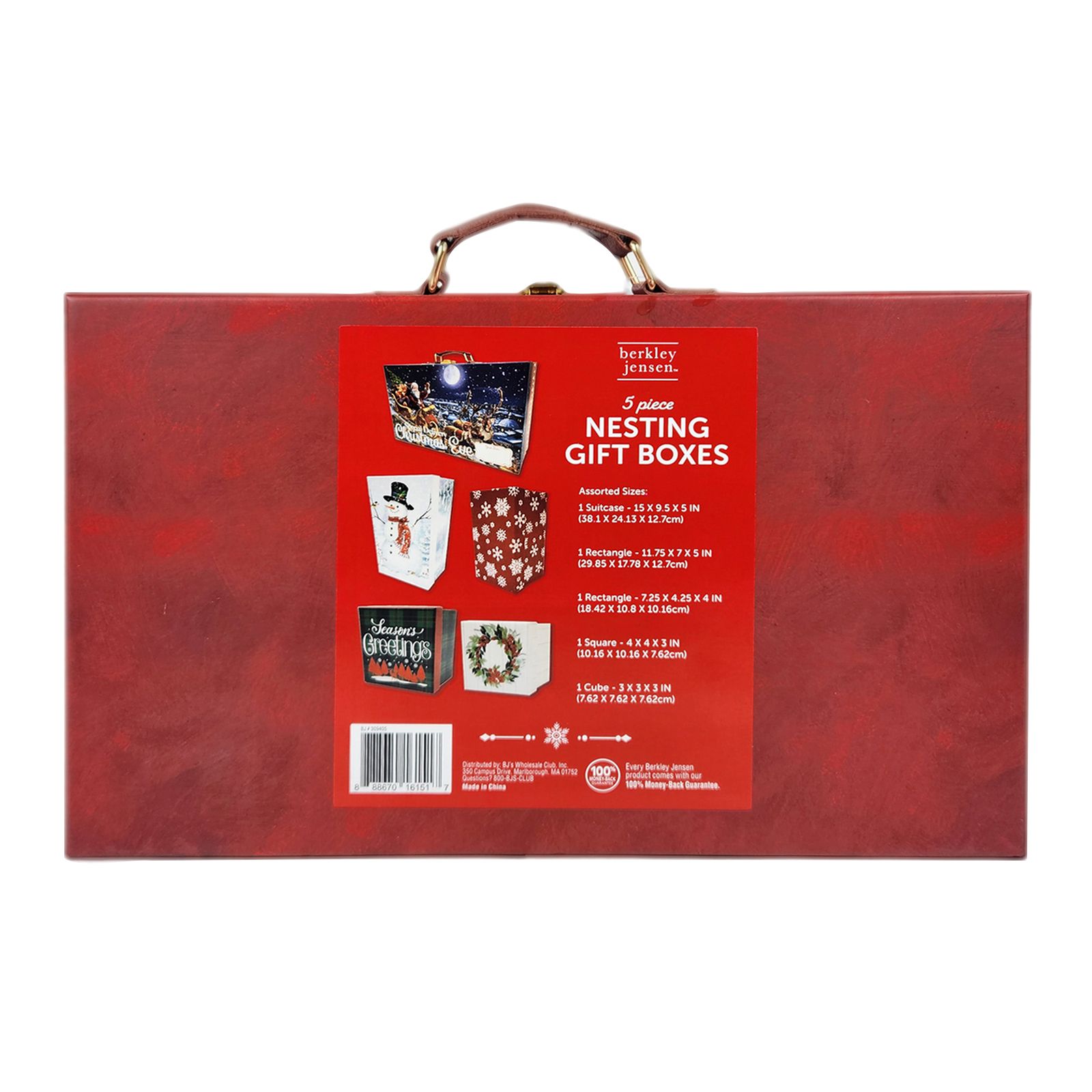 Give your gifts in style this holiday season with the Berkley Jensen 5 Piece Nesting Gift Box set. Each nested set contains (1) suitcase - 15" x 9.5" 5", (1) large rectangle - 11.75" x 7" x 5", (1) medium rectangle - 7.25" x 4.25" x 4", (1) square - 4" x 4" x 3", and (1) cube - 3" x 3" x 3". Each box showcases a fun, traditional Christmas design that people of all ages will enjoy. Use each box individually or stack multiple boxes to create a spectacular gift box tower.