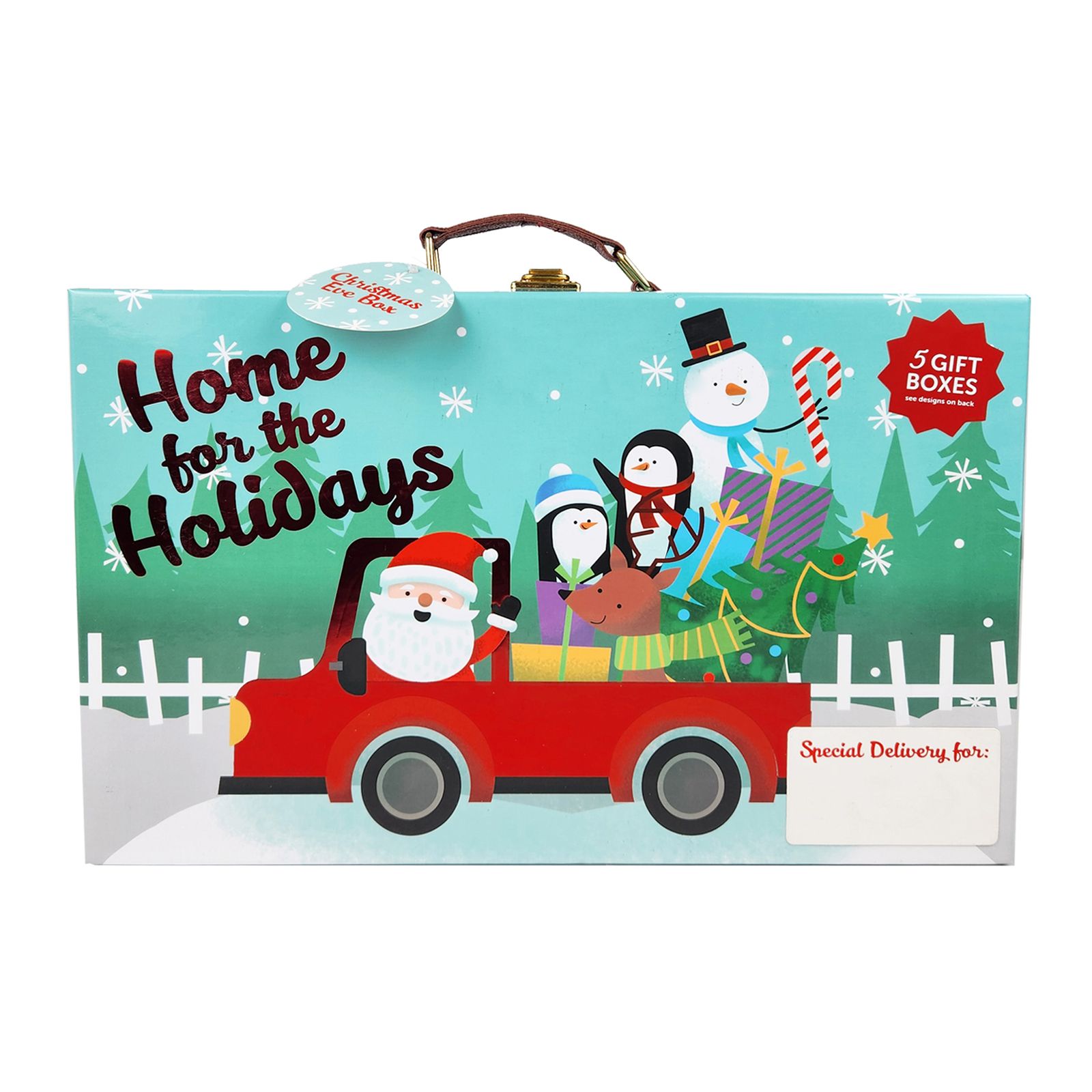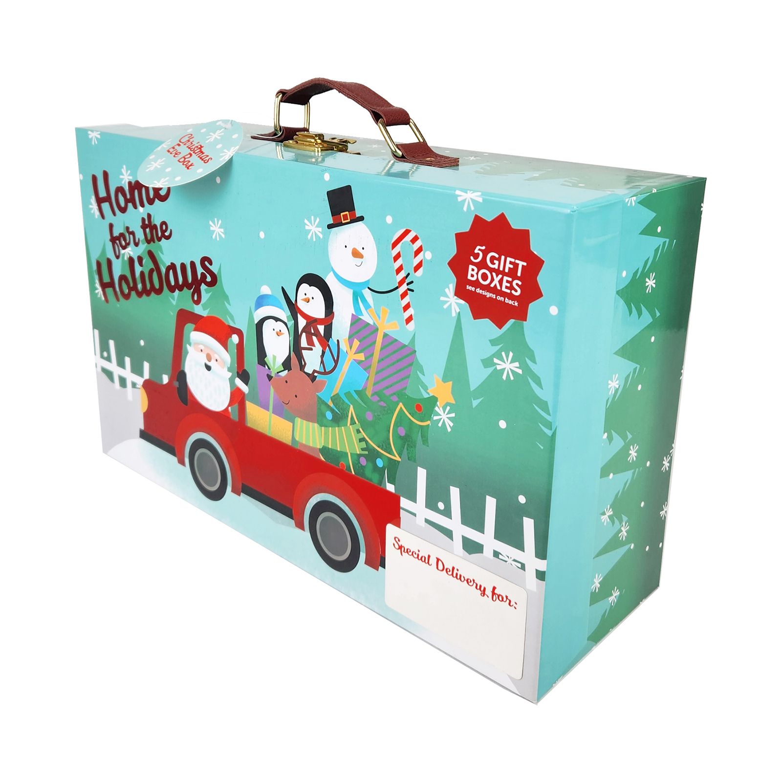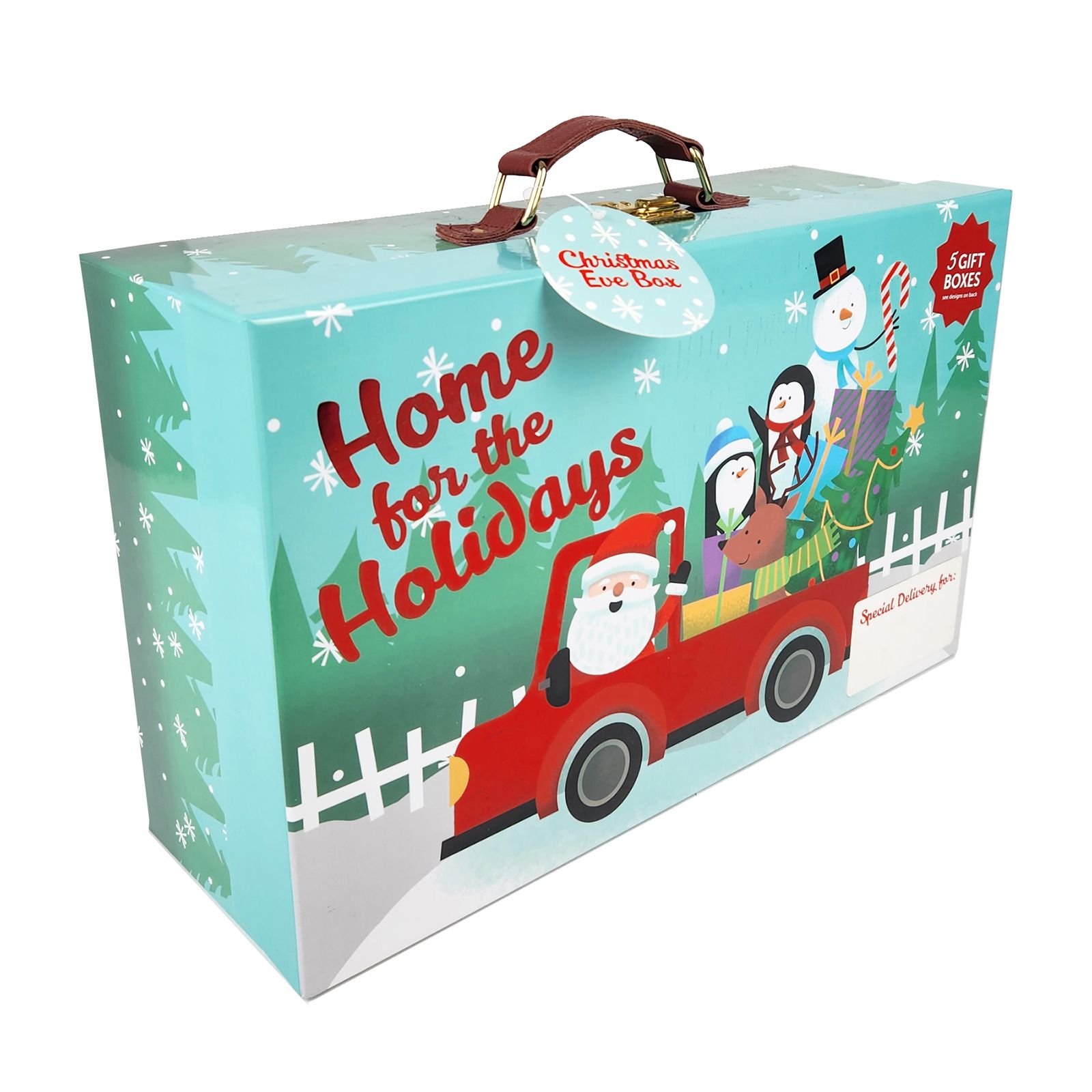 The suitcase gift box includes a carrying handle and buckle closure