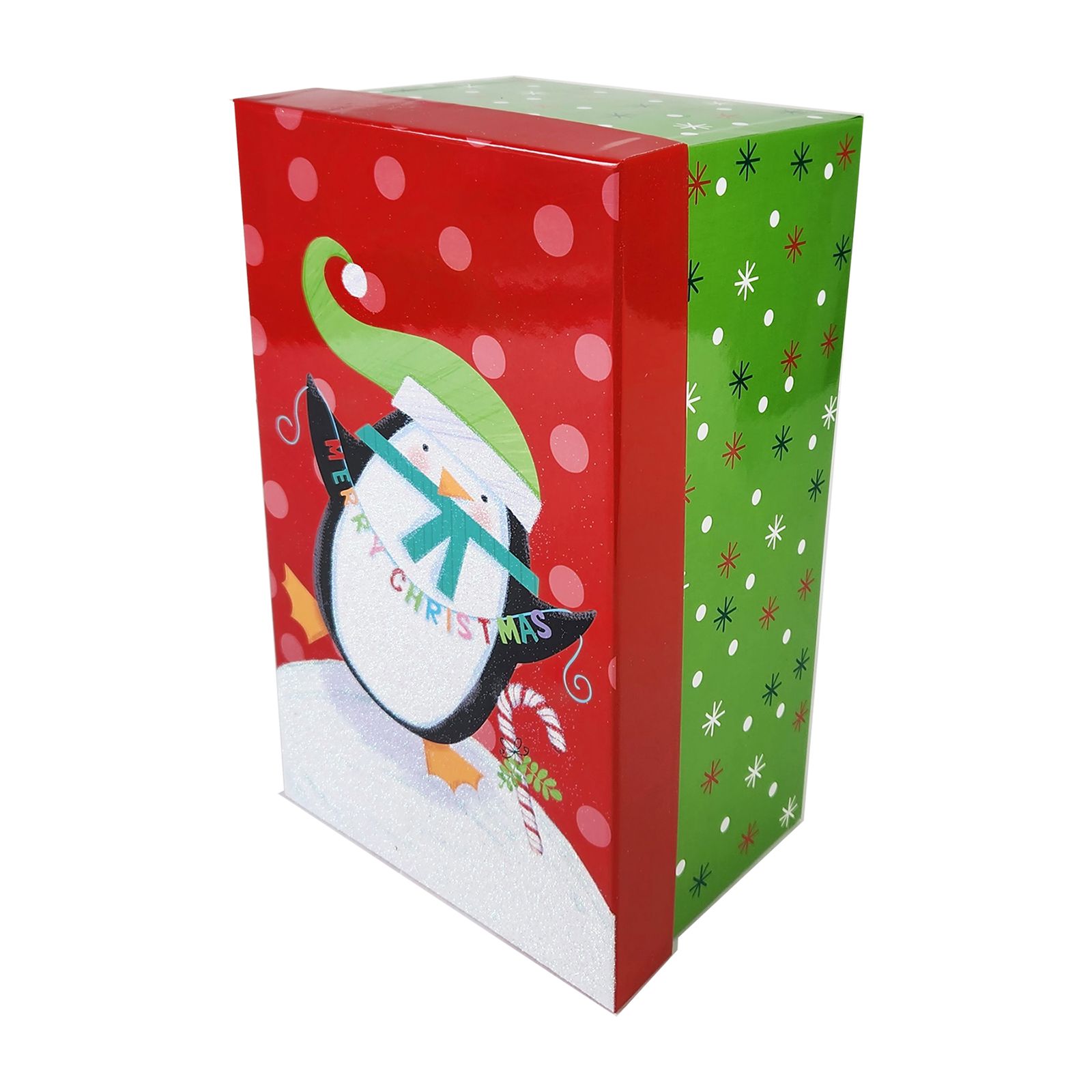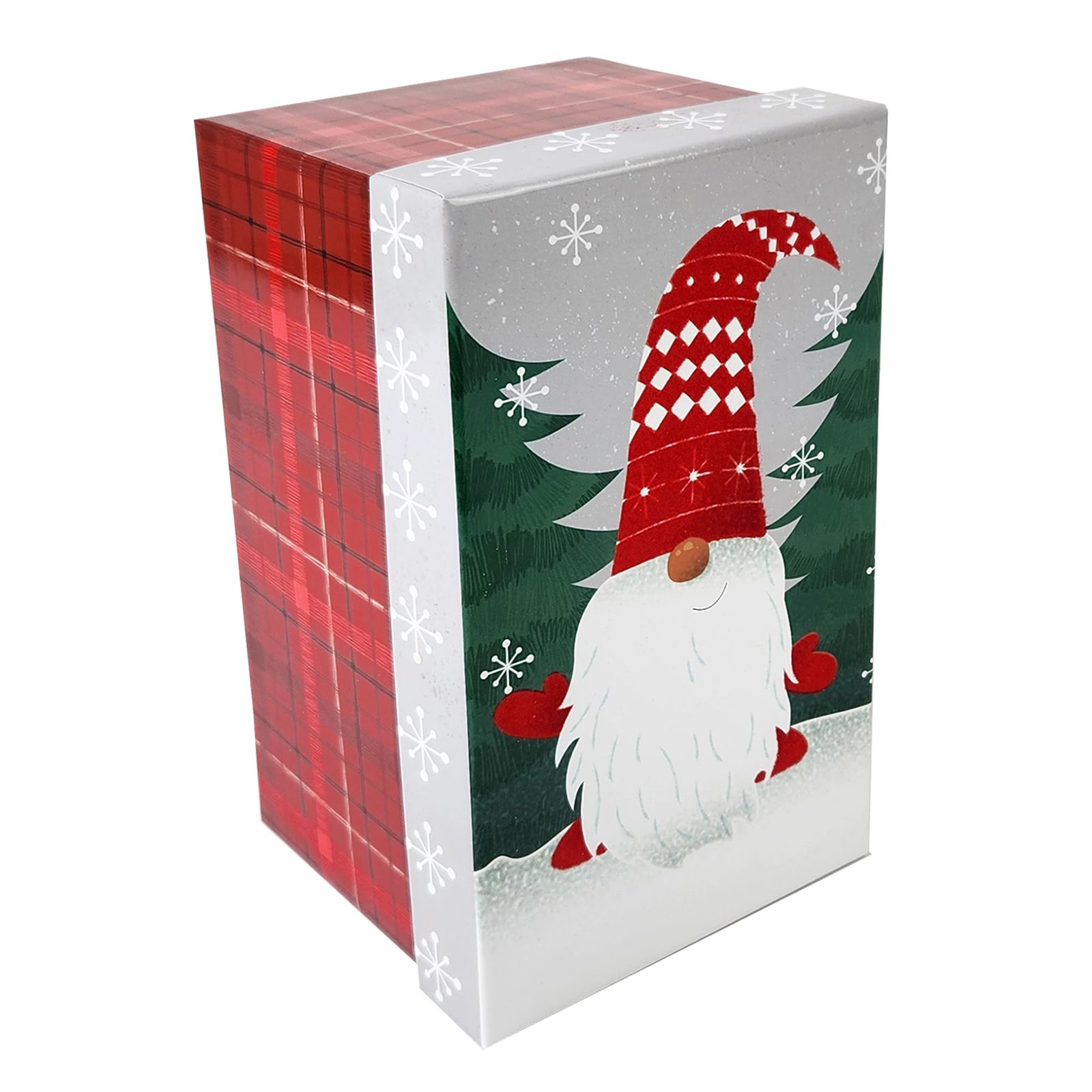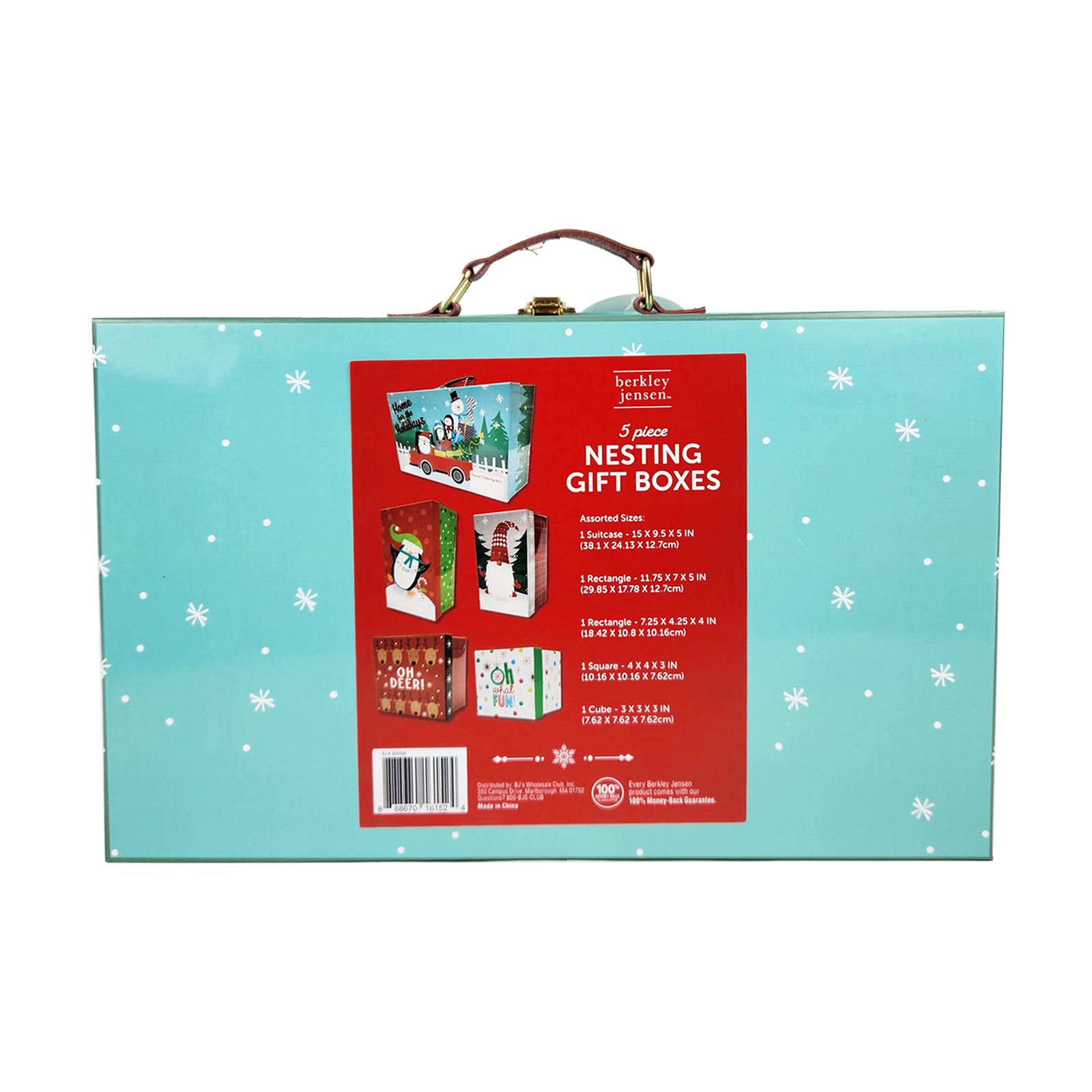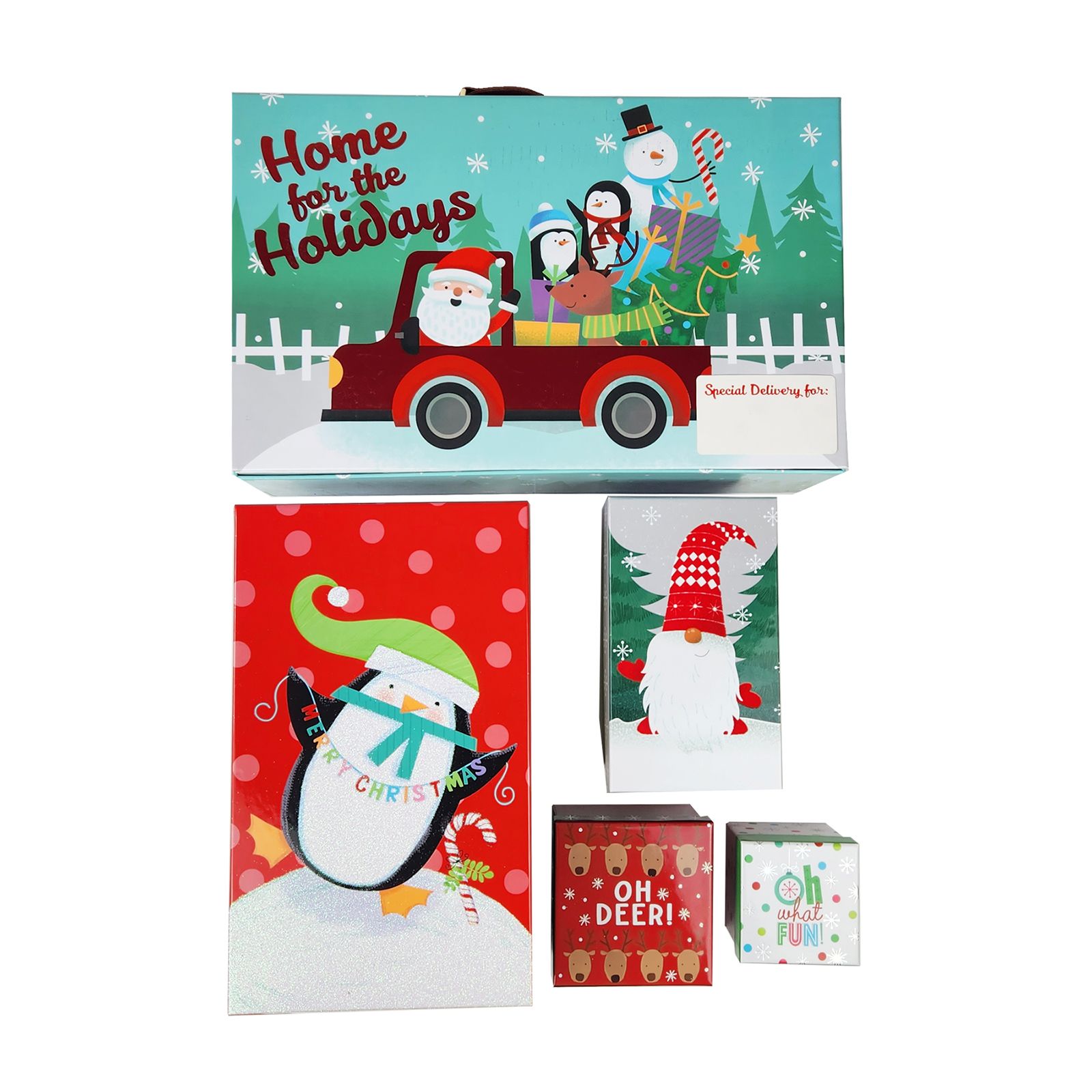 Give your gifts in style this holiday season with the Berkley Jensen five-piece nesting gift box set. Each nested set contains a suitcase, large rectangle, medium rectangle, square and cube decoration. Each box showcases a fun, traditional Christmas design that people of all ages will enjoy. Use each box individually or stack multiple boxes to create a spectacular gift box tower.