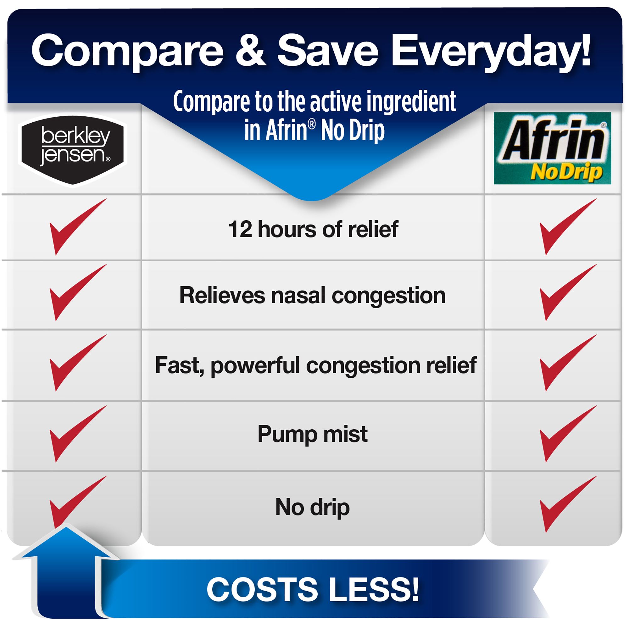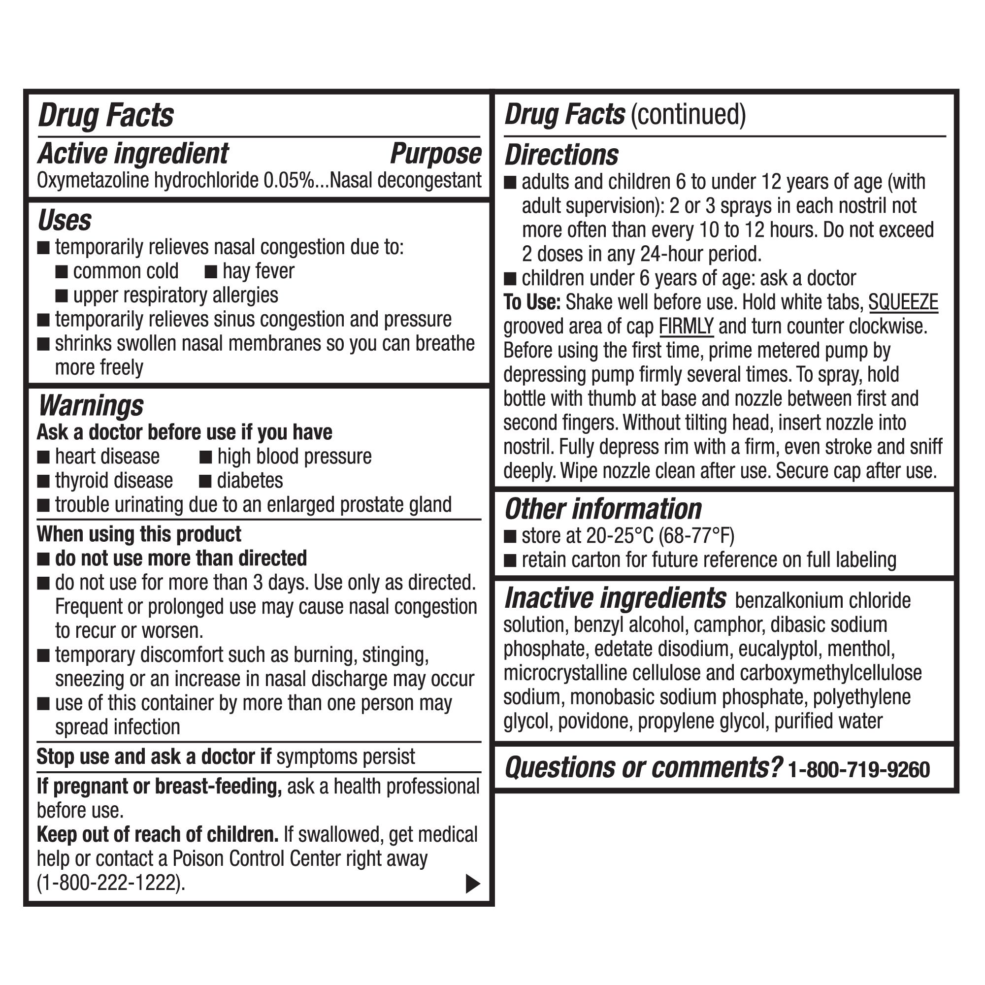 Compare to Afrin No Drip active ingredient. Severe Congestion Nasal Spray, Oxymetazoline HCl won’t drip from your nose or down your throat. For 12 hour, maximum strength relief of nasal and sinus congestion and sinus pressure due to colds and allergies. This nasal spray contains oxymetazoline HCl 0.05%, the #1 doctor recommended adult nasal spray active ingredient (of U.S. physicians surveyed by an independent market research firm).