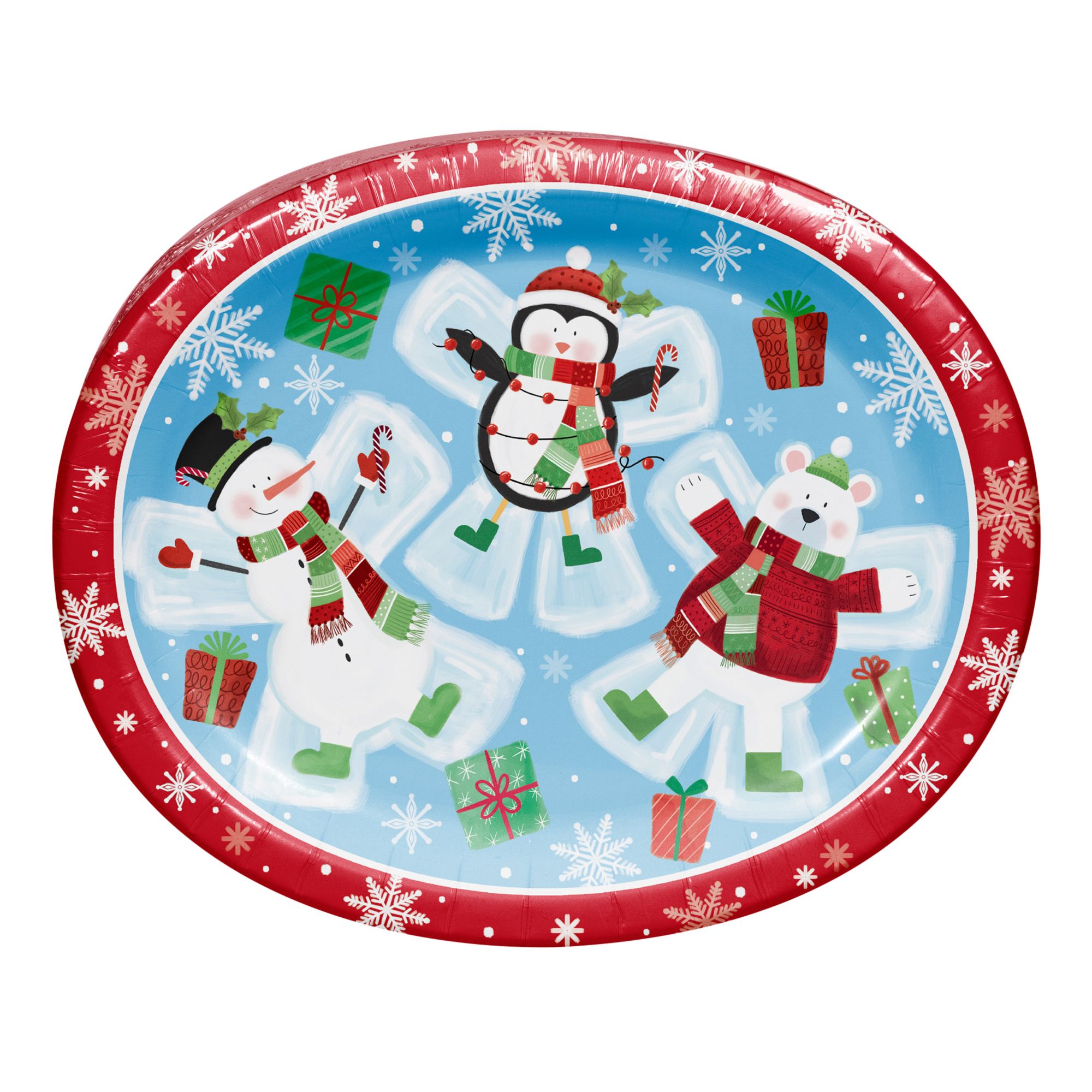 Bring Holiday cheer to your table with our BJ's exclusive Snowy Wonderland oval platter. Measuring 10" x 12", these versatile paper platters are disposable for easy serving. This playful design is perfect for your holiday cookie exchange and holiday gathering. Sold in packs of 60.