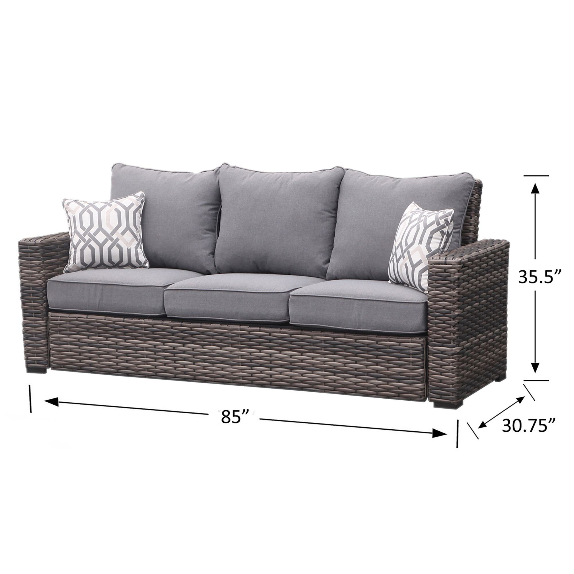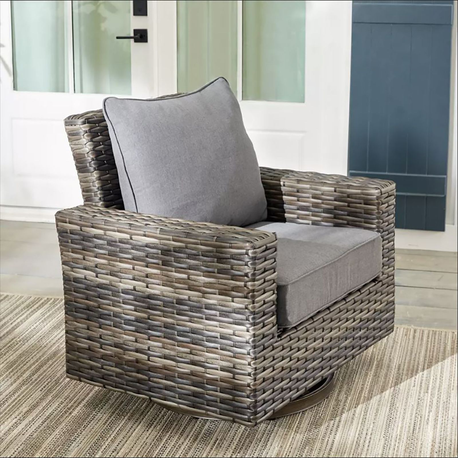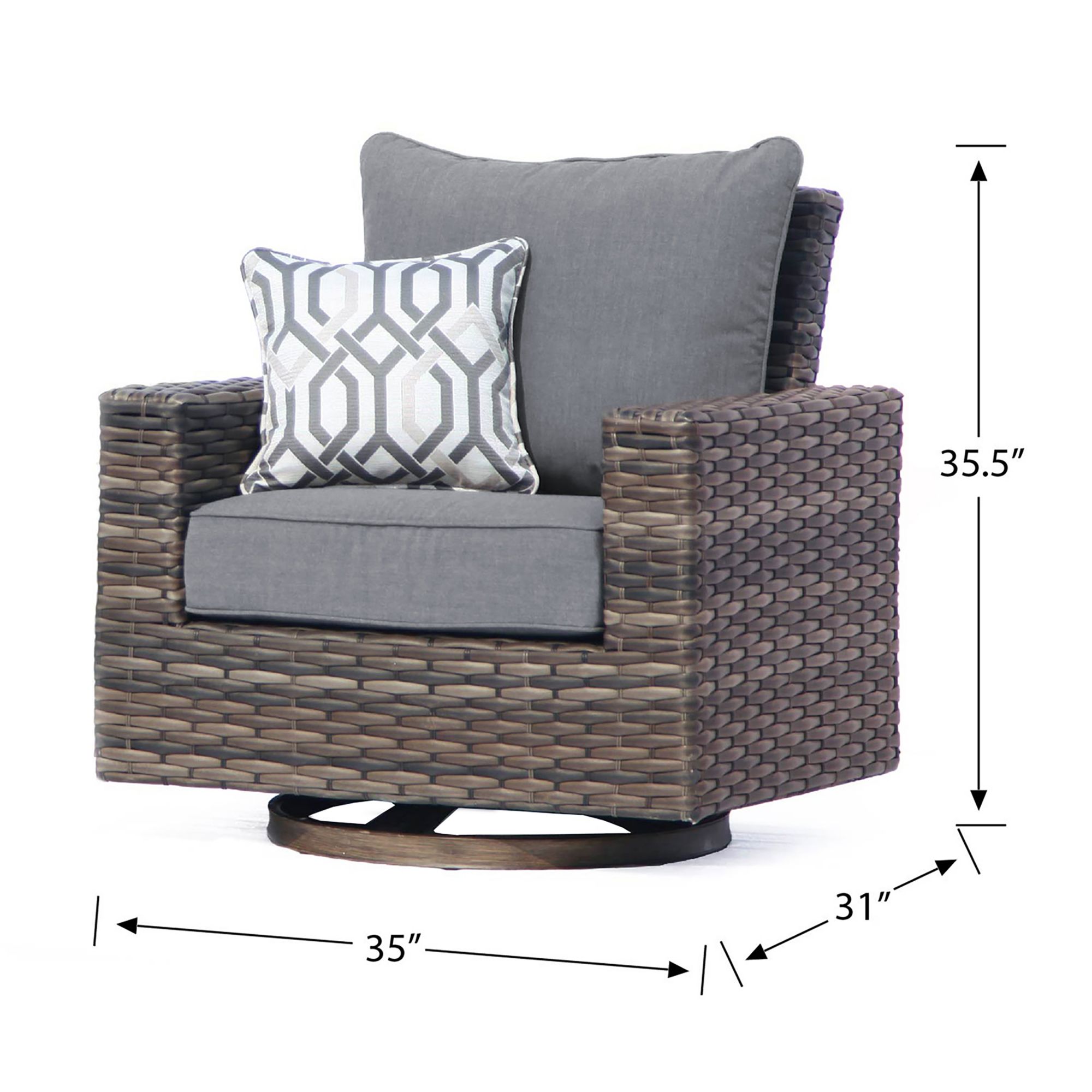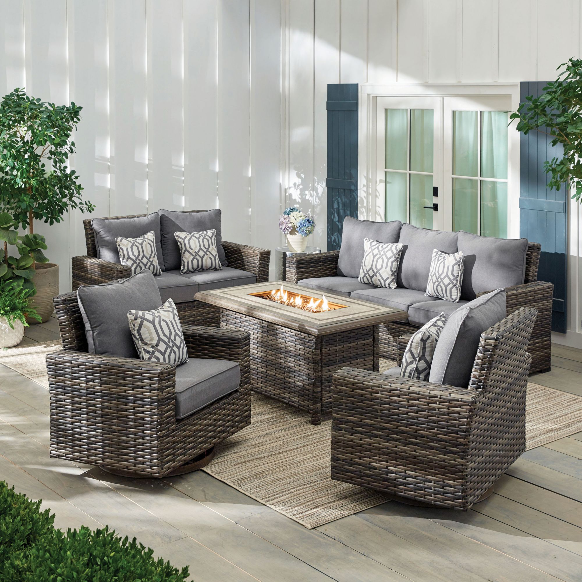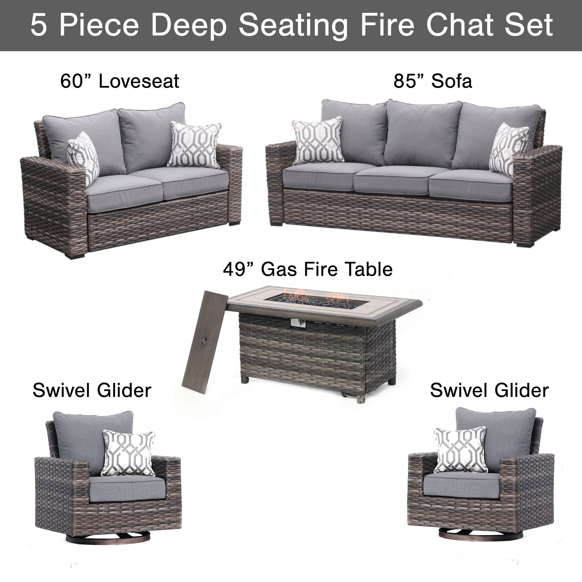 Includes sofa, loveseat, two swivel glider chairs, six 16 x 16 toss pillows and 50,000 BTU Fire Table