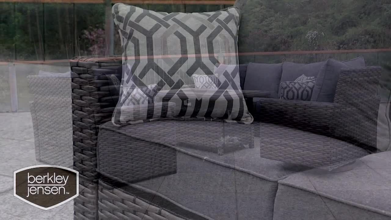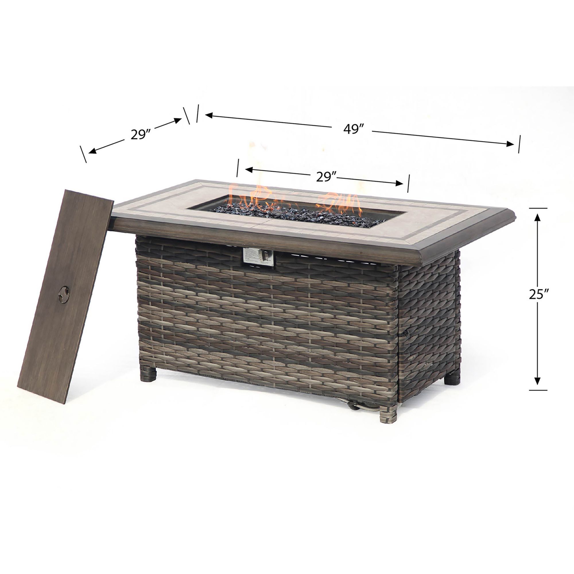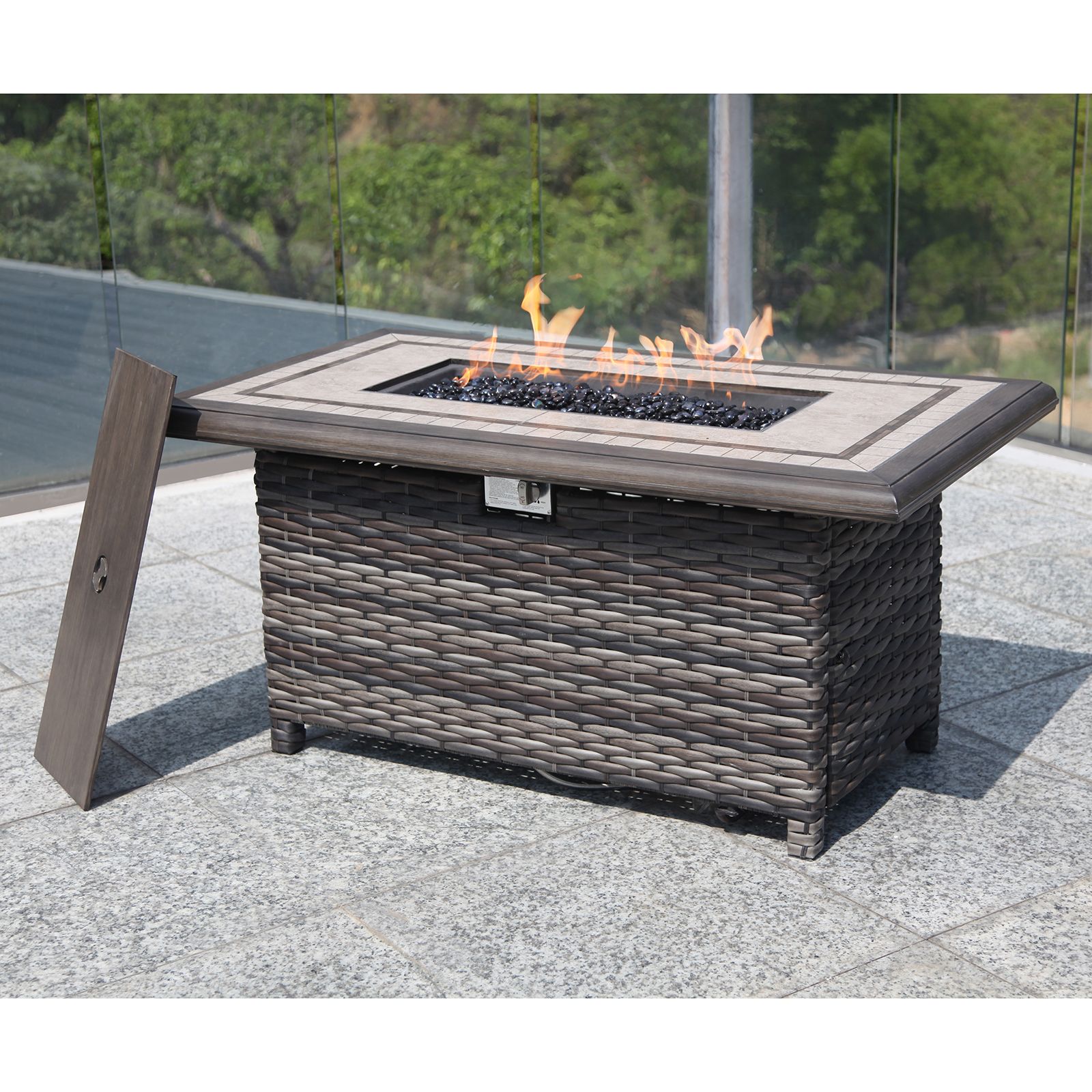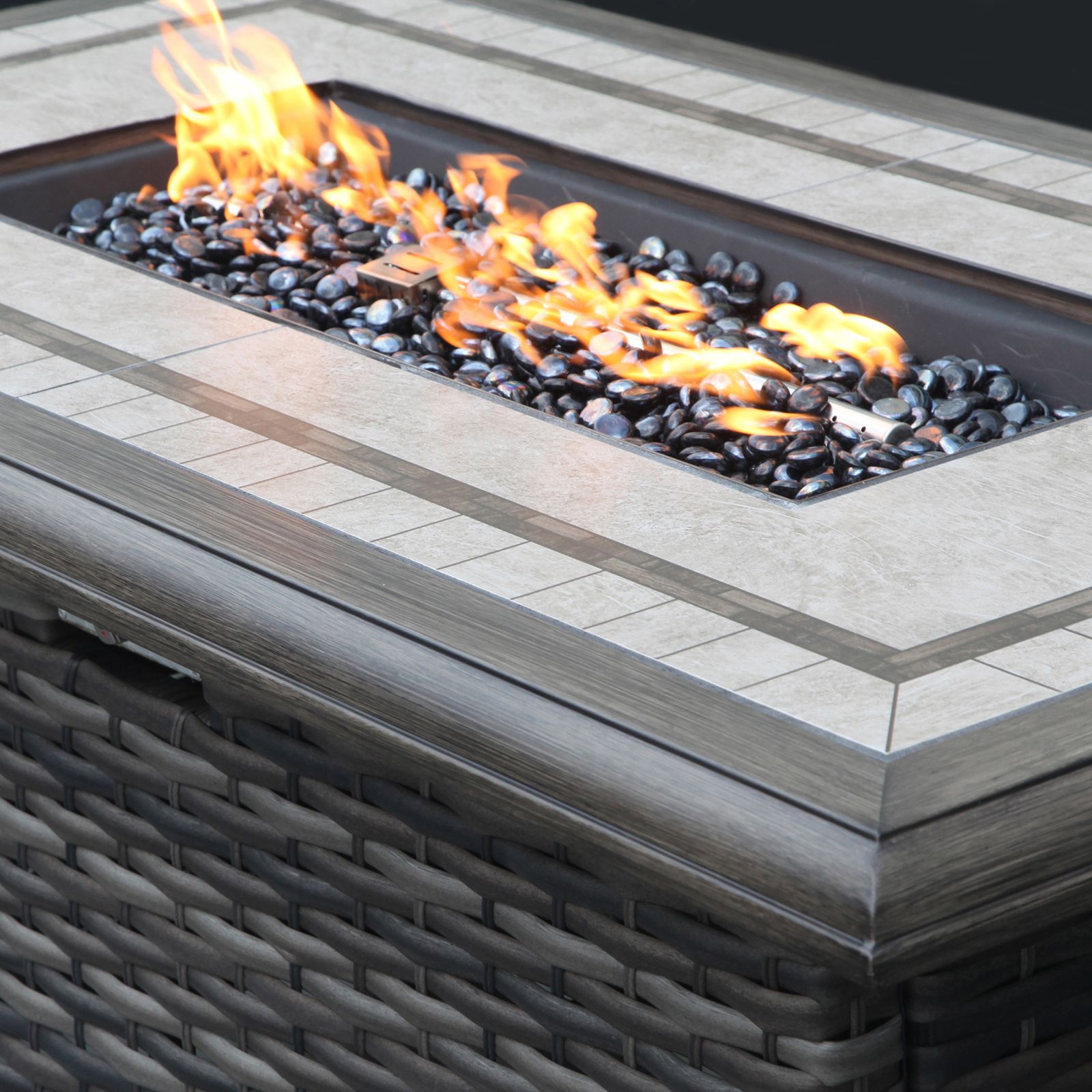 The Berkley Jensen Spring Lake Fire Table Set is constructed with an aluminum rust-resistant frame, a hand-woven Wintech wicker. The set contains stain-resistant acrylic cushions and a 50,000 BTU fire table with safety shut off.