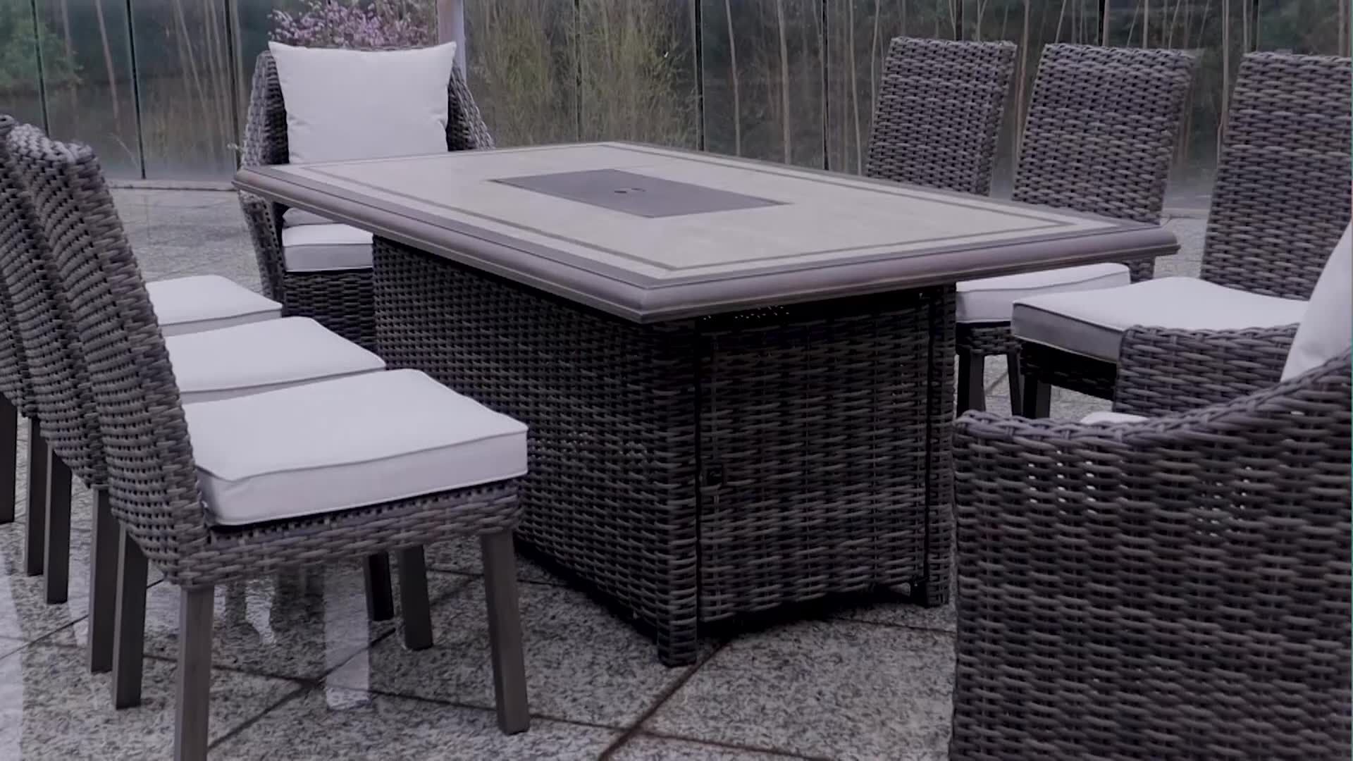 Create your backyard paradise with the Berkley Jensen Spring Lake Collection.  This top-of-the-line 9-Pc. Aluminum Fire Pit Dining Set includes a fire pit, dining table, six parsons chairs, and two stationary captain dining chairs. The 81.5" extra long dining table has a built-in 40,000-BTU adjustable flame fire pit, providing a warm and relaxing atmosphere for your dining experience. The Spring Lake innovative ceramic tile top heats, scratches, and is stain-resistant with minimal grout for easy cleaning and maintenance. Internal tank storage offers easy and safe access to a standard 15 lbs. - 20 lbs. propane tank (propane tank not included). The durable UV-protected powder-coated aluminum frame is naturally rust-free and corrosion resistant. The premium cushions are constructed using Solution Dyed Acrylic with 3M Scotchgard treatment five-year limited warranty providing lasting comfort and durability with enhanced water, stain, and fade-resistant fabric. The beautiful multi-color hand-woven all-weather wicker uses premium polyethylene wicker with Microban and UV protection for increased durability and longevity. This collection delivers long outdoor life and the premium luxury desired for your perfect outdoor space.