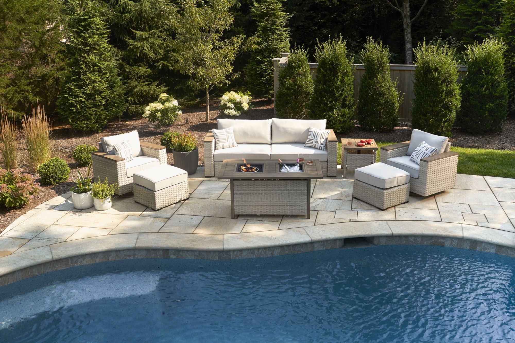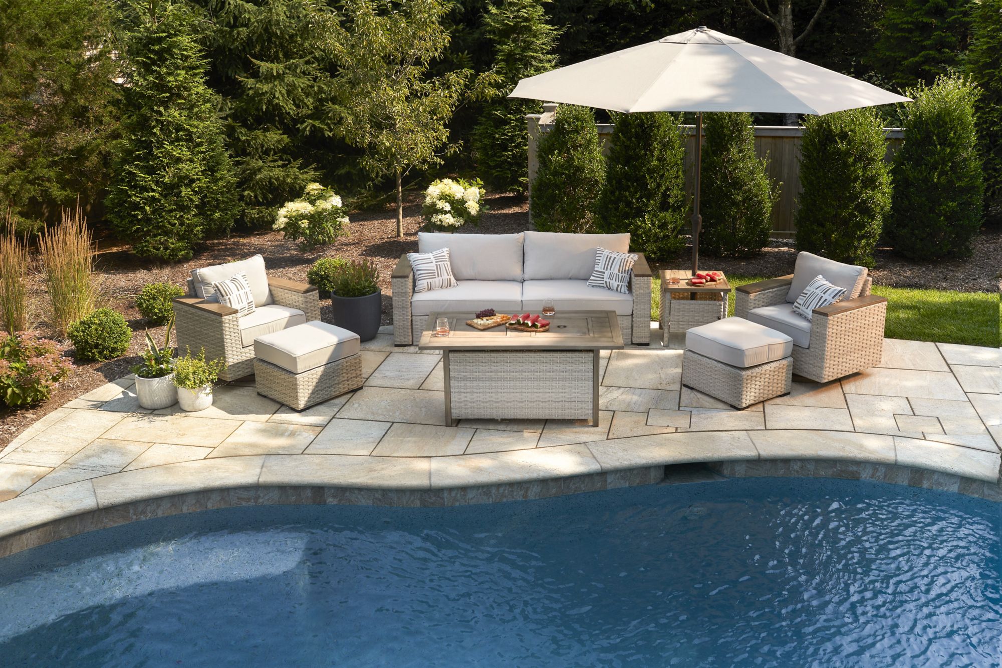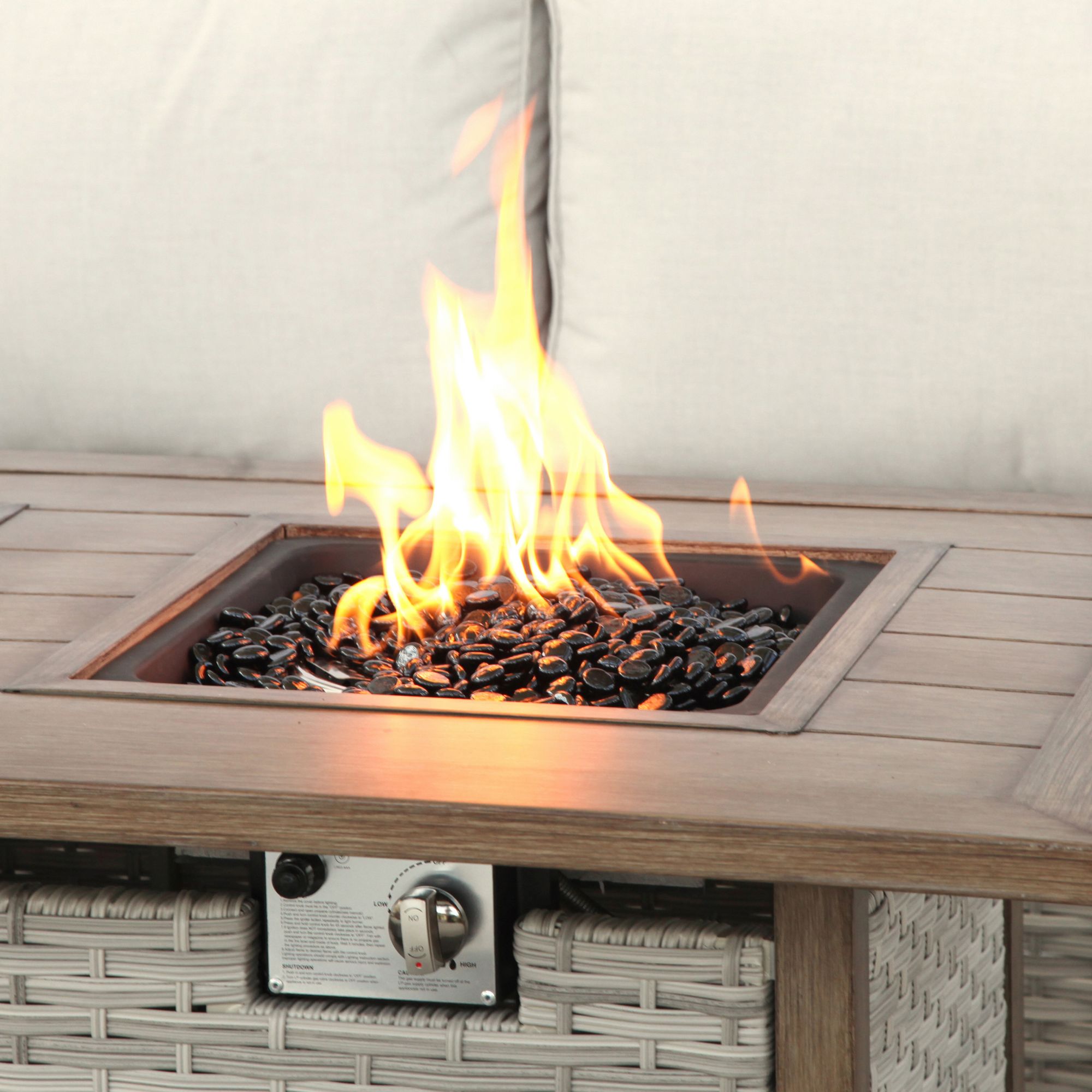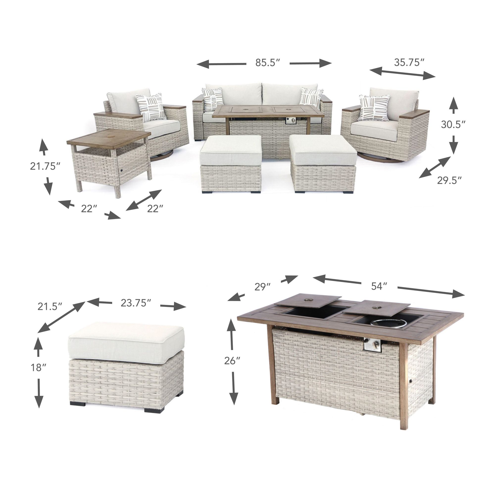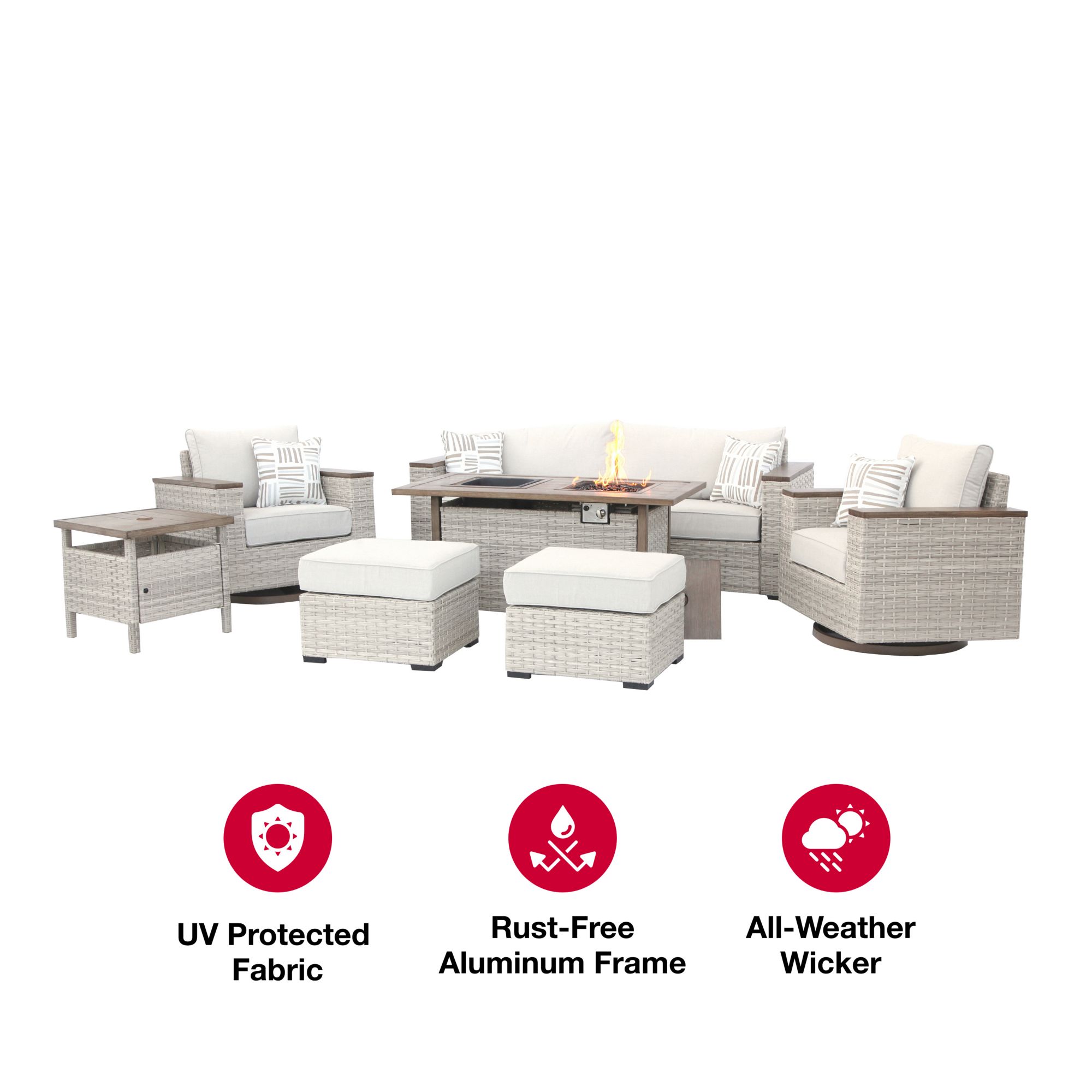 Exclusively at BJ's Rust-proof aluminum frame All weather hand-woven wicker UV Protected acrylic fabric with 5-year limited warranty Fire table with 400,00 BTU gas fire pit on the left side and ice cooler on the right side of the table. Easy Assembly Includes 1 sofa, 2 swivel glider club chairs, 2 ottomans, 1 umbrella side table and 50,000 BTU gas fire and ice cooler table