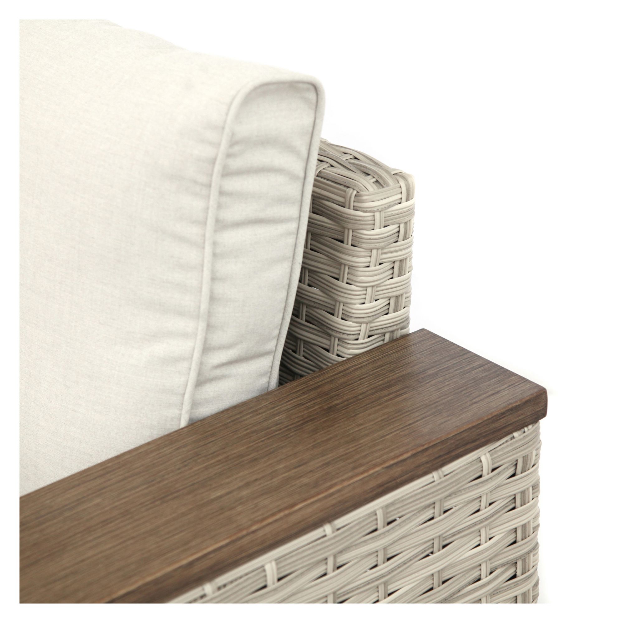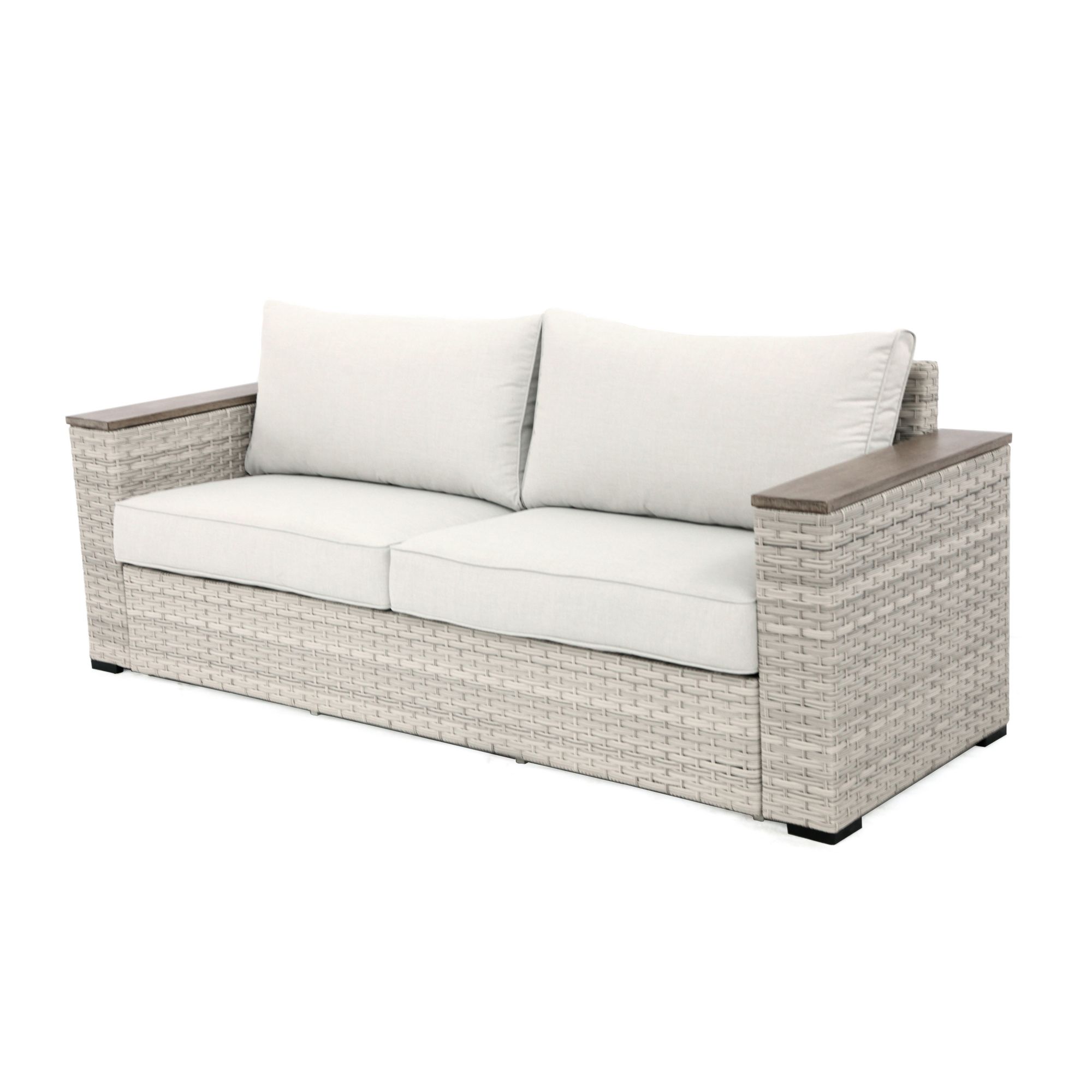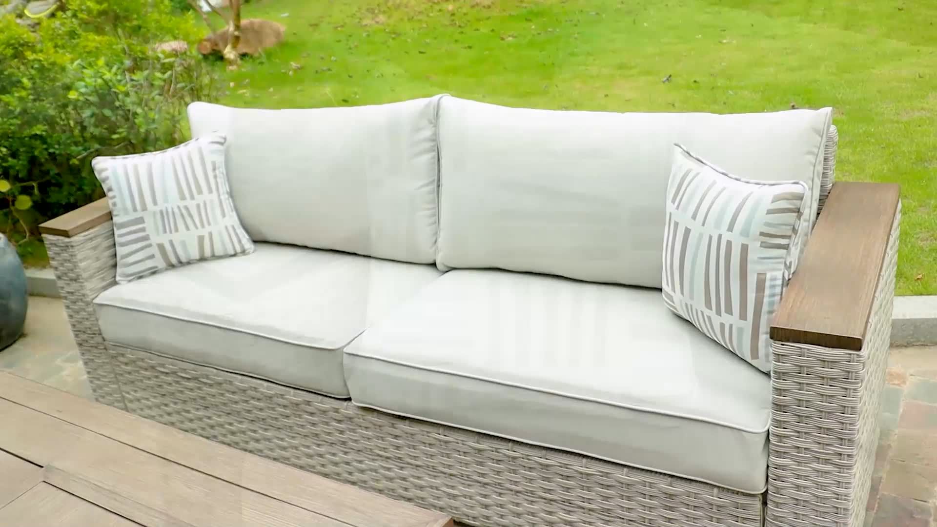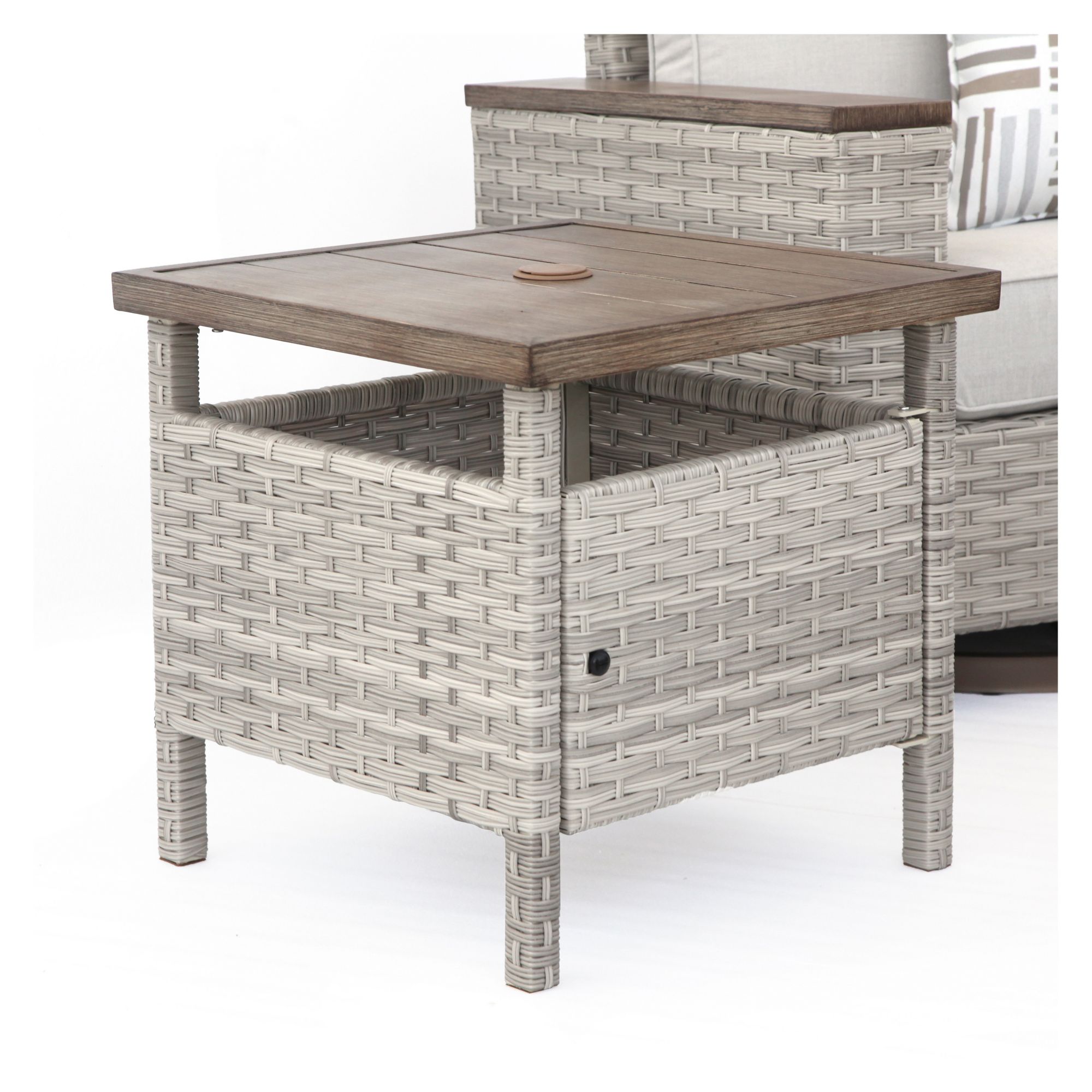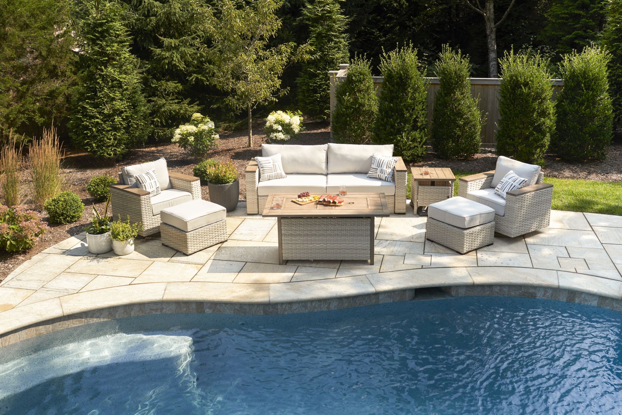 Exclusively at BJ's Rust-proof aluminum frame All weather hand-woven wicker UV Protected acrylic fabric with 5-year limited warranty Fire table with 400,00 BTU gas fire pit on the left side and ice cooler on the right side of the table. Easy Assembly Includes 1 sofa, 2 swivel glider club chairs, 2 ottomans, 1 umbrella side table and 50,000 BTU gas fire and ice cooler table